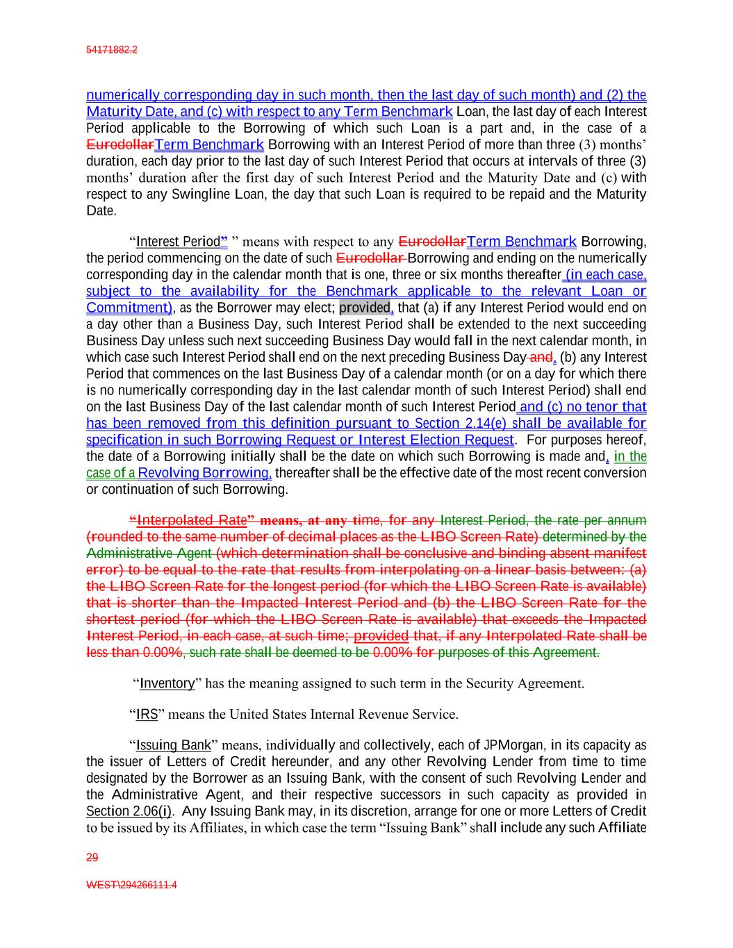 54171882.2 29 WEST\294266111.4 numerically corresponding day in such month, then the last day of such month) and (2) the Maturity Date, and (c) with respect to any Term Benchmark Loan, the last day of each Interest Period applicable to the Borrowing of which such Loan is a part and, in the case of a EurodollarTerm Benchmark Borrowing with an Interest Period of more than three (3) months’ duration, each day prior to the last day of such Interest Period that occurs at intervals of three (3) months’ duration after the first day of such Interest Period and the Maturity Date and (c) with respect to any Swingline Loan, the day that such Loan is required to be repaid and the Maturity Date. “Interest Period” ” means with respect to any EurodollarTerm Benchmark Borrowing, the period commencing on the date of such Eurodollar Borrowing and ending on the numerically corresponding day in the calendar month that is one, three or six months thereafter (in each case, subject to the availability for the Benchmark applicable to the relevant Loan or Commitment), as the Borrower may elect; provided, that (a) if any Interest Period would end on a day other than a Business Day, such Interest Period shall be extended to the next succeeding Business Day unless such next succeeding Business Day would fall in the next calendar month, in which case such Interest Period shall end on the next preceding Business Day and, (b) any Interest Period that commences on the last Business Day of a calendar month (or on a day for which there is no numerically corresponding day in the last calendar month of such Interest Period) shall end on the last Business Day of the last calendar month of such Interest Period and (c) no tenor that has been removed from this definition pursuant to Section 2.14(e) shall be available for specification in such Borrowing Request or Interest Election Request. For purposes hereof, the date of a Borrowing initially shall be the date on which such Borrowing is made and, in the case of a Revolving Borrowing, thereafter shall be the effective date of the most recent conversion or continuation of such Borrowing. “Interpolated Rate” means, at any time, for any Interest Period, the rate per annum (rounded to the same number of decimal places as the LIBO Screen Rate) determined by the Administrative Agent (which determination shall be conclusive and binding absent manifest error) to be equal to the rate that results from interpolating on a linear basis between: (a) the LIBO Screen Rate for the longest period (for which the LIBO Screen Rate is available) that is shorter than the Impacted Interest Period and (b) the LIBO Screen Rate for the shortest period (for which the LIBO Screen Rate is available) that exceeds the Impacted Interest Period, in each case, at such time; provided that, if any Interpolated Rate shall be less than 0.00%, such rate shall be deemed to be 0.00% for purposes of this Agreement. “Inventory” has the meaning assigned to such term in the Security Agreement. “IRS” means the United States Internal Revenue Service. “Issuing Bank” means, individually and collectively, each of JPMorgan, in its capacity as the issuer of Letters of Credit hereunder, and any other Revolving Lender from time to time designated by the Borrower as an Issuing Bank, with the consent of such Revolving Lender and the Administrative Agent, and their respective successors in such capacity as provided in Section 2.06(i). Any Issuing Bank may, in its discretion, arrange for one or more Letters of Credit to be issued by its Affiliates, in which case the term “Issuing Bank” shall include any such Affiliate