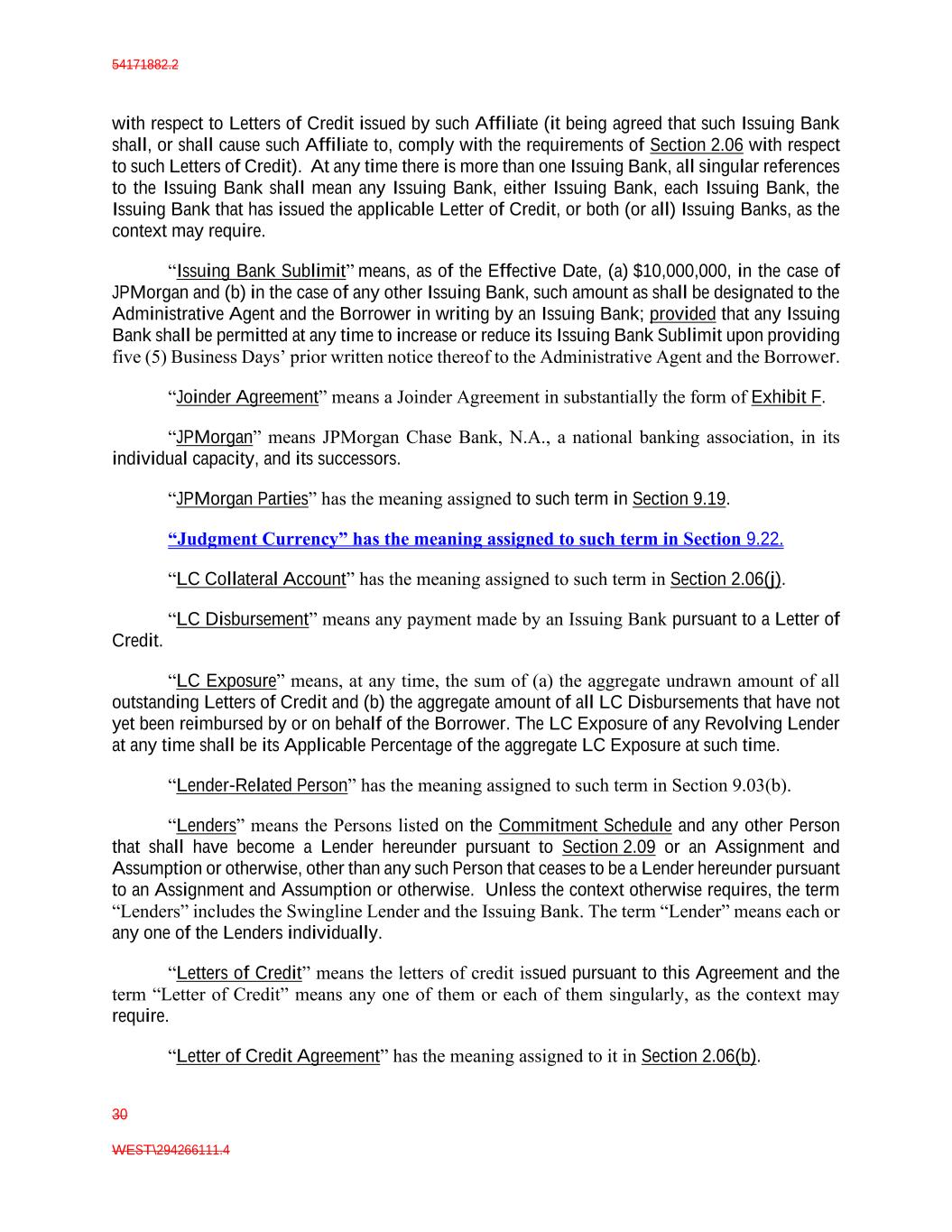 54171882.2 30 WEST\294266111.4 with respect to Letters of Credit issued by such Affiliate (it being agreed that such Issuing Bank shall, or shall cause such Affiliate to, comply with the requirements of Section 2.06 with respect to such Letters of Credit). At any time there is more than one Issuing Bank, all singular references to the Issuing Bank shall mean any Issuing Bank, either Issuing Bank, each Issuing Bank, the Issuing Bank that has issued the applicable Letter of Credit, or both (or all) Issuing Banks, as the context may require. “Issuing Bank Sublimit” means, as of the Effective Date, (a) $10,000,000, in the case of JPMorgan and (b) in the case of any other Issuing Bank, such amount as shall be designated to the Administrative Agent and the Borrower in writing by an Issuing Bank; provided that any Issuing Bank shall be permitted at any time to increase or reduce its Issuing Bank Sublimit upon providing five (5) Business Days’ prior written notice thereof to the Administrative Agent and the Borrower. “Joinder Agreement” means a Joinder Agreement in substantially the form of Exhibit F. “JPMorgan” means JPMorgan Chase Bank, N.A., a national banking association, in its individual capacity, and its successors. “JPMorgan Parties” has the meaning assigned to such term in Section 9.19. “Judgment Currency” has the meaning assigned to such term in Section 9.22. “LC Collateral Account” has the meaning assigned to such term in Section 2.06(j). “LC Disbursement” means any payment made by an Issuing Bank pursuant to a Letter of Credit. “LC Exposure” means, at any time, the sum of (a) the aggregate undrawn amount of all outstanding Letters of Credit and (b) the aggregate amount of all LC Disbursements that have not yet been reimbursed by or on behalf of the Borrower. The LC Exposure of any Revolving Lender at any time shall be its Applicable Percentage of the aggregate LC Exposure at such time. “Lender-Related Person” has the meaning assigned to such term in Section 9.03(b). “Lenders” means the Persons listed on the Commitment Schedule and any other Person that shall have become a Lender hereunder pursuant to Section 2.09 or an Assignment and Assumption or otherwise, other than any such Person that ceases to be a Lender hereunder pursuant to an Assignment and Assumption or otherwise. Unless the context otherwise requires, the term “Lenders” includes the Swingline Lender and the Issuing Bank. The term “Lender” means each or any one of the Lenders individually. “Letters of Credit” means the letters of credit issued pursuant to this Agreement and the term “Letter of Credit” means any one of them or each of them singularly, as the context may require. “Letter of Credit Agreement” has the meaning assigned to it in Section 2.06(b).
