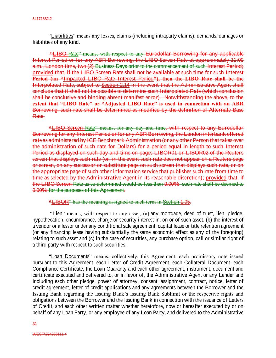 54171882.2 31 WEST\294266111.4 “Liabilities” means any losses, claims (including intraparty claims), demands, damages or liabilities of any kind. “LIBO Rate” means, with respect to any Eurodollar Borrowing for any applicable Interest Period or for any ABR Borrowing, the LIBO Screen Rate at approximately 11:00 a.m., London time, two (2) Business Days prior to the commencement of such Interest Period; provided that, if the LIBO Screen Rate shall not be available at such time for such Interest Period (an “Impacted LIBO Rate Interest Period”), then the LIBO Rate shall be the Interpolated Rate, subject to Section 2.14 in the event that the Administrative Agent shall conclude that it shall not be possible to determine such Interpolated Rate (which conclusion shall be conclusive and binding absent manifest error). Notwithstanding the above, to the extent that “LIBO Rate” or “Adjusted LIBO Rate” is used in connection with an ABR Borrowing, such rate shall be determined as modified by the definition of Alternate Base Rate. “LIBO Screen Rate” means, for any day and time, with respect to any Eurodollar Borrowing for any Interest Period or for any ABR Borrowing, the London interbank offered rate as administered by ICE Benchmark Administration (or any other Person that takes over the administration of such rate for Dollars) for a period equal in length to such Interest Period as displayed on such day and time on pages LIBOR01 or LIBOR02 of the Reuters screen that displays such rate (or, in the event such rate does not appear on a Reuters page or screen, on any successor or substitute page on such screen that displays such rate, or on the appropriate page of such other information service that publishes such rate from time to time as selected by the Administrative Agent in its reasonable discretion); provided that, if the LIBO Screen Rate as so determined would be less than 0.00%, such rate shall be deemed to 0.00% for the purposes of this Agreement. “LIBOR” has the meaning assigned to such term in Section 1.05. “Lien” means, with respect to any asset, (a) any mortgage, deed of trust, lien, pledge, hypothecation, encumbrance, charge or security interest in, on or of such asset, (b) the interest of a vendor or a lessor under any conditional sale agreement, capital lease or title retention agreement (or any financing lease having substantially the same economic effect as any of the foregoing) relating to such asset and (c) in the case of securities, any purchase option, call or similar right of a third party with respect to such securities. “Loan Documents” means, collectively, this Agreement, each promissory note issued pursuant to this Agreement, each Letter of Credit Agreement, each Collateral Document, each Compliance Certificate, the Loan Guaranty and each other agreement, instrument, document and certificate executed and delivered to, or in favor of, the Administrative Agent or any Lender and including each other pledge, power of attorney, consent, assignment, contract, notice, letter of credit agreement, letter of credit applications and any agreements between the Borrower and the Issuing Bank regarding the Issuing Bank’s Issuing Bank Sublimit or the respective rights and obligations between the Borrower and the Issuing Bank in connection with the issuance of Letters of Credit, and each other written matter whether heretofore, now or hereafter executed by or on behalf of any Loan Party, or any employee of any Loan Party, and delivered to the Administrative