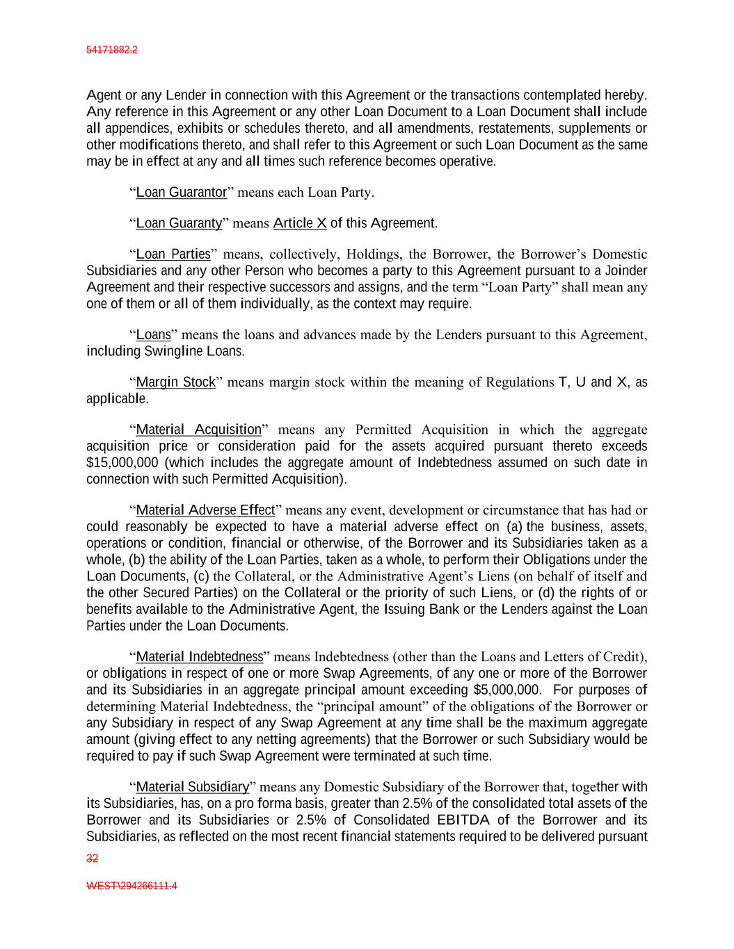 54171882.2 32 WEST\294266111.4 Agent or any Lender in connection with this Agreement or the transactions contemplated hereby. Any reference in this Agreement or any other Loan Document to a Loan Document shall include all appendices, exhibits or schedules thereto, and all amendments, restatements, supplements or other modifications thereto, and shall refer to this Agreement or such Loan Document as the same may be in effect at any and all times such reference becomes operative. “Loan Guarantor” means each Loan Party. “Loan Guaranty” means Article X of this Agreement. “Loan Parties” means, collectively, Holdings, the Borrower, the Borrower’s Domestic Subsidiaries and any other Person who becomes a party to this Agreement pursuant to a Joinder Agreement and their respective successors and assigns, and the term “Loan Party” shall mean any one of them or all of them individually, as the context may require. “Loans” means the loans and advances made by the Lenders pursuant to this Agreement, including Swingline Loans. “Margin Stock” means margin stock within the meaning of Regulations T, U and X, as applicable. “Material Acquisition” means any Permitted Acquisition in which the aggregate acquisition price or consideration paid for the assets acquired pursuant thereto exceeds $15,000,000 (which includes the aggregate amount of Indebtedness assumed on such date in connection with such Permitted Acquisition). “Material Adverse Effect” means any event, development or circumstance that has had or could reasonably be expected to have a material adverse effect on (a) the business, assets, operations or condition, financial or otherwise, of the Borrower and its Subsidiaries taken as a whole, (b) the ability of the Loan Parties, taken as a whole, to perform their Obligations under the Loan Documents, (c) the Collateral, or the Administrative Agent’s Liens (on behalf of itself and the other Secured Parties) on the Collateral or the priority of such Liens, or (d) the rights of or benefits available to the Administrative Agent, the Issuing Bank or the Lenders against the Loan Parties under the Loan Documents. “Material Indebtedness” means Indebtedness (other than the Loans and Letters of Credit), or obligations in respect of one or more Swap Agreements, of any one or more of the Borrower and its Subsidiaries in an aggregate principal amount exceeding $5,000,000. For purposes of determining Material Indebtedness, the “principal amount” of the obligations of the Borrower or any Subsidiary in respect of any Swap Agreement at any time shall be the maximum aggregate amount (giving effect to any netting agreements) that the Borrower or such Subsidiary would be required to pay if such Swap Agreement were terminated at such time. “Material Subsidiary” means any Domestic Subsidiary of the Borrower that, together with its Subsidiaries, has, on a pro forma basis, greater than 2.5% of the consolidated total assets of the Borrower and its Subsidiaries or 2.5% of Consolidated EBITDA of the Borrower and its Subsidiaries, as reflected on the most recent financial statements required to be delivered pursuant