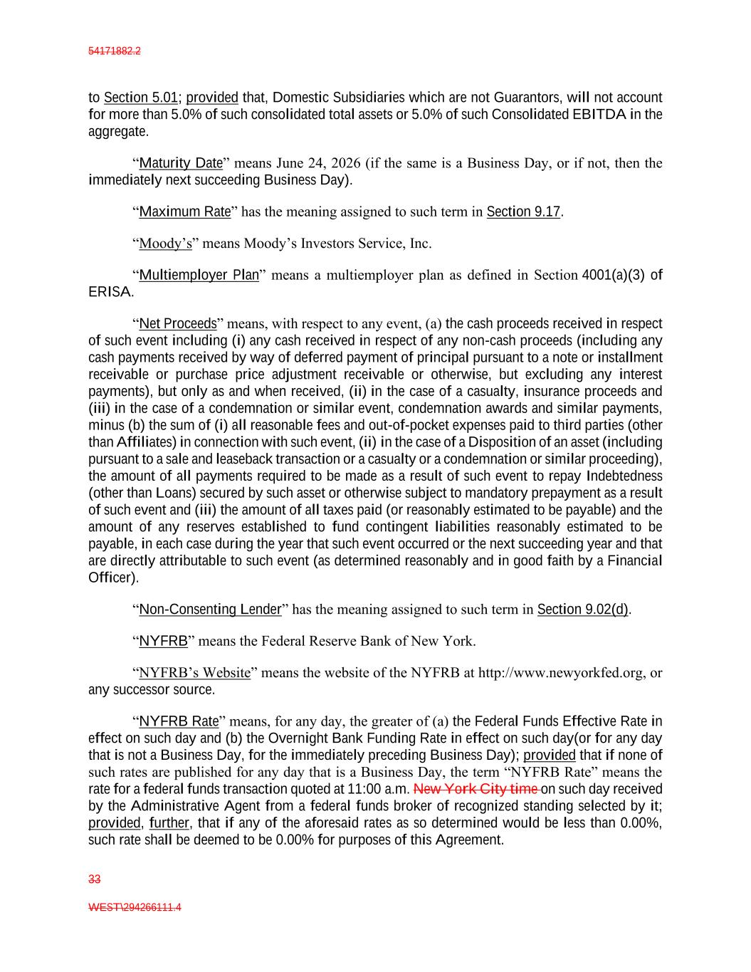 54171882.2 33 WEST\294266111.4 to Section 5.01; provided that, Domestic Subsidiaries which are not Guarantors, will not account for more than 5.0% of such consolidated total assets or 5.0% of such Consolidated EBITDA in the aggregate. “Maturity Date” means June 24, 2026 (if the same is a Business Day, or if not, then the immediately next succeeding Business Day). “Maximum Rate” has the meaning assigned to such term in Section 9.17. “Moody’s” means Moody’s Investors Service, Inc. “Multiemployer Plan” means a multiemployer plan as defined in Section 4001(a)(3) of ERISA. “Net Proceeds” means, with respect to any event, (a) the cash proceeds received in respect of such event including (i) any cash received in respect of any non-cash proceeds (including any cash payments received by way of deferred payment of principal pursuant to a note or installment receivable or purchase price adjustment receivable or otherwise, but excluding any interest payments), but only as and when received, (ii) in the case of a casualty, insurance proceeds and (iii) in the case of a condemnation or similar event, condemnation awards and similar payments, minus (b) the sum of (i) all reasonable fees and out-of-pocket expenses paid to third parties (other than Affiliates) in connection with such event, (ii) in the case of a Disposition of an asset (including pursuant to a sale and leaseback transaction or a casualty or a condemnation or similar proceeding), the amount of all payments required to be made as a result of such event to repay Indebtedness (other than Loans) secured by such asset or otherwise subject to mandatory prepayment as a result of such event and (iii) the amount of all taxes paid (or reasonably estimated to be payable) and the amount of any reserves established to fund contingent liabilities reasonably estimated to be payable, in each case during the year that such event occurred or the next succeeding year and that are directly attributable to such event (as determined reasonably and in good faith by a Financial Officer). “Non-Consenting Lender” has the meaning assigned to such term in Section 9.02(d). “NYFRB” means the Federal Reserve Bank of New York. “NYFRB’s Website” means the website of the NYFRB at http://www.newyorkfed.org, or any successor source. “NYFRB Rate” means, for any day, the greater of (a) the Federal Funds Effective Rate in effect on such day and (b) the Overnight Bank Funding Rate in effect on such day(or for any day that is not a Business Day, for the immediately preceding Business Day); provided that if none of such rates are published for any day that is a Business Day, the term “NYFRB Rate” means the rate for a federal funds transaction quoted at 11:00 a.m. New York City time on such day received by the Administrative Agent from a federal funds broker of recognized standing selected by it; provided, further, that if any of the aforesaid rates as so determined would be less than 0.00%, such rate shall be deemed to be 0.00% for purposes of this Agreement.