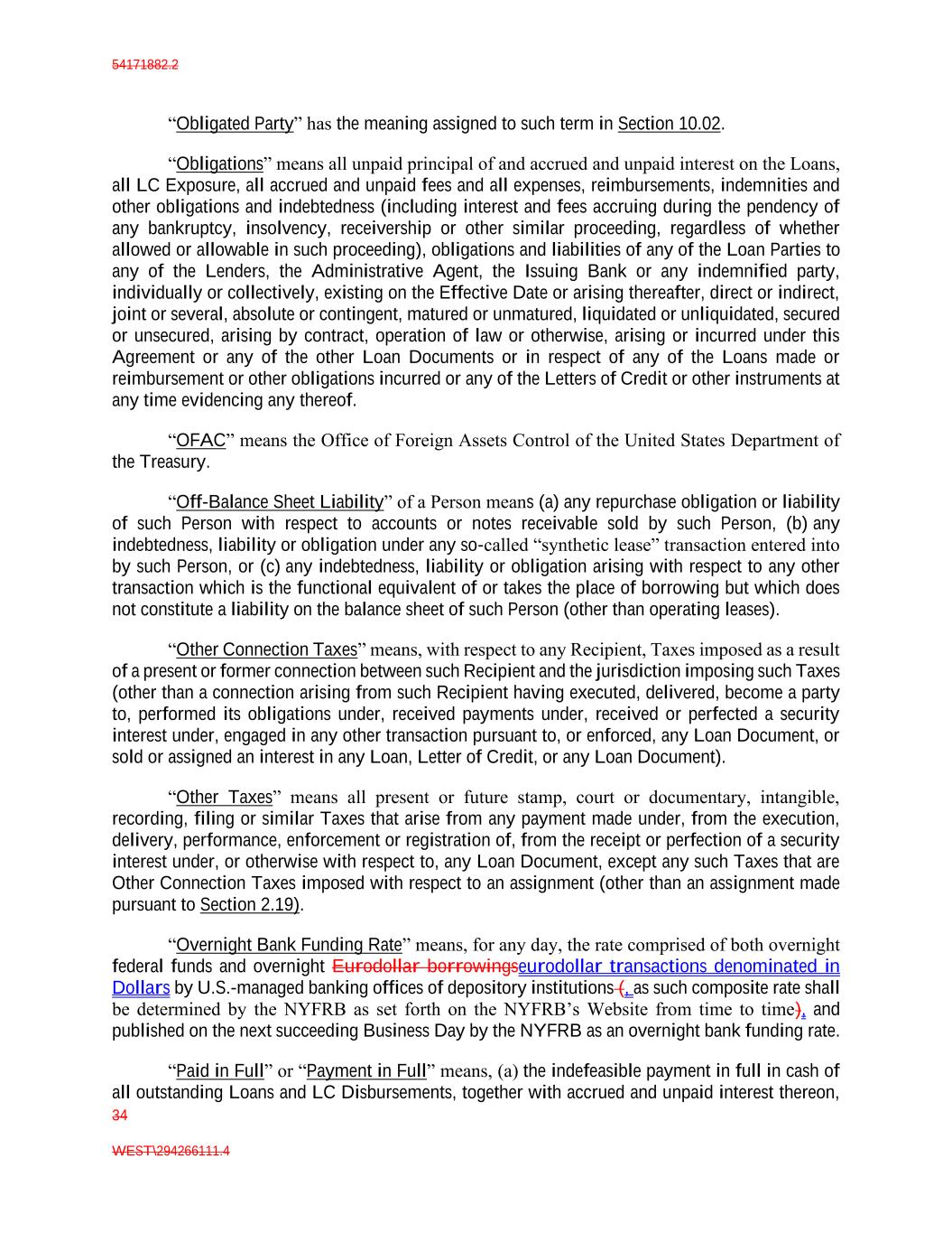 54171882.2 34 WEST\294266111.4 “Obligated Party” has the meaning assigned to such term in Section 10.02. “Obligations” means all unpaid principal of and accrued and unpaid interest on the Loans, all LC Exposure, all accrued and unpaid fees and all expenses, reimbursements, indemnities and other obligations and indebtedness (including interest and fees accruing during the pendency of any bankruptcy, insolvency, receivership or other similar proceeding, regardless of whether allowed or allowable in such proceeding), obligations and liabilities of any of the Loan Parties to any of the Lenders, the Administrative Agent, the Issuing Bank or any indemnified party, individually or collectively, existing on the Effective Date or arising thereafter, direct or indirect, joint or several, absolute or contingent, matured or unmatured, liquidated or unliquidated, secured or unsecured, arising by contract, operation of law or otherwise, arising or incurred under this Agreement or any of the other Loan Documents or in respect of any of the Loans made or reimbursement or other obligations incurred or any of the Letters of Credit or other instruments at any time evidencing any thereof. “OFAC” means the Office of Foreign Assets Control of the United States Department of the Treasury. “Off-Balance Sheet Liability” of a Person means (a) any repurchase obligation or liability of such Person with respect to accounts or notes receivable sold by such Person, (b) any indebtedness, liability or obligation under any so-called “synthetic lease” transaction entered into by such Person, or (c) any indebtedness, liability or obligation arising with respect to any other transaction which is the functional equivalent of or takes the place of borrowing but which does not constitute a liability on the balance sheet of such Person (other than operating leases). “Other Connection Taxes” means, with respect to any Recipient, Taxes imposed as a result of a present or former connection between such Recipient and the jurisdiction imposing such Taxes (other than a connection arising from such Recipient having executed, delivered, become a party to, performed its obligations under, received payments under, received or perfected a security interest under, engaged in any other transaction pursuant to, or enforced, any Loan Document, or sold or assigned an interest in any Loan, Letter of Credit, or any Loan Document). “Other Taxes” means all present or future stamp, court or documentary, intangible, recording, filing or similar Taxes that arise from any payment made under, from the execution, delivery, performance, enforcement or registration of, from the receipt or perfection of a security interest under, or otherwise with respect to, any Loan Document, except any such Taxes that are Other Connection Taxes imposed with respect to an assignment (other than an assignment made pursuant to Section 2.19). “Overnight Bank Funding Rate” means, for any day, the rate comprised of both overnight federal funds and overnight Eurodollar borrowingseurodollar transactions denominated in Dollars by U.S.-managed banking offices of depository institutions (, as such composite rate shall be determined by the NYFRB as set forth on the NYFRB’s Website from time to time), and published on the next succeeding Business Day by the NYFRB as an overnight bank funding rate. “Paid in Full” or “Payment in Full” means, (a) the indefeasible payment in full in cash of all outstanding Loans and LC Disbursements, together with accrued and unpaid interest thereon,