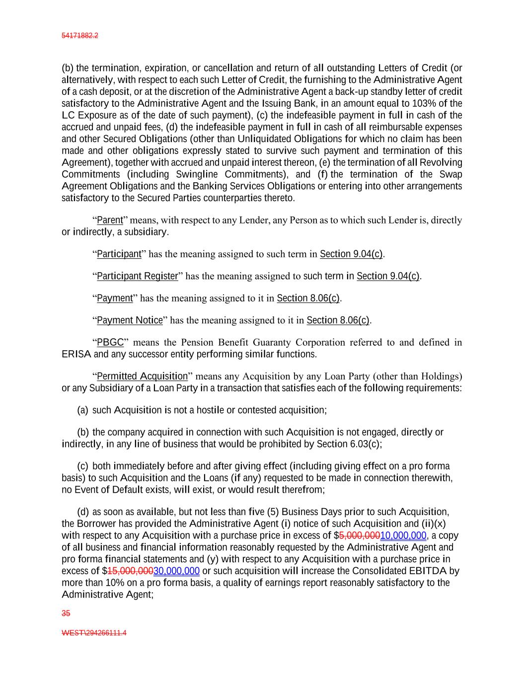 54171882.2 35 WEST\294266111.4 (b) the termination, expiration, or cancellation and return of all outstanding Letters of Credit (or alternatively, with respect to each such Letter of Credit, the furnishing to the Administrative Agent of a cash deposit, or at the discretion of the Administrative Agent a back-up standby letter of credit satisfactory to the Administrative Agent and the Issuing Bank, in an amount equal to 103% of the LC Exposure as of the date of such payment), (c) the indefeasible payment in full in cash of the accrued and unpaid fees, (d) the indefeasible payment in full in cash of all reimbursable expenses and other Secured Obligations (other than Unliquidated Obligations for which no claim has been made and other obligations expressly stated to survive such payment and termination of this Agreement), together with accrued and unpaid interest thereon, (e) the termination of all Revolving Commitments (including Swingline Commitments), and (f) the termination of the Swap Agreement Obligations and the Banking Services Obligations or entering into other arrangements satisfactory to the Secured Parties counterparties thereto. “Parent” means, with respect to any Lender, any Person as to which such Lender is, directly or indirectly, a subsidiary. “Participant” has the meaning assigned to such term in Section 9.04(c). “Participant Register” has the meaning assigned to such term in Section 9.04(c). “Payment” has the meaning assigned to it in Section 8.06(c). “Payment Notice” has the meaning assigned to it in Section 8.06(c). “PBGC” means the Pension Benefit Guaranty Corporation referred to and defined in ERISA and any successor entity performing similar functions. “Permitted Acquisition” means any Acquisition by any Loan Party (other than Holdings) or any Subsidiary of a Loan Party in a transaction that satisfies each of the following requirements: (a) such Acquisition is not a hostile or contested acquisition; (b) the company acquired in connection with such Acquisition is not engaged, directly or indirectly, in any line of business that would be prohibited by Section 6.03(c); (c) both immediately before and after giving effect (including giving effect on a pro forma basis) to such Acquisition and the Loans (if any) requested to be made in connection therewith, no Event of Default exists, will exist, or would result therefrom; (d) as soon as available, but not less than five (5) Business Days prior to such Acquisition, the Borrower has provided the Administrative Agent (i) notice of such Acquisition and (ii)(x) with respect to any Acquisition with a purchase price in excess of $5,000,00010,000,000, a copy of all business and financial information reasonably requested by the Administrative Agent and pro forma financial statements and (y) with respect to any Acquisition with a purchase price in excess of $15,000,00030,000,000 or such acquisition will increase the Consolidated EBITDA by more than 10% on a pro forma basis, a quality of earnings report reasonably satisfactory to the Administrative Agent;
