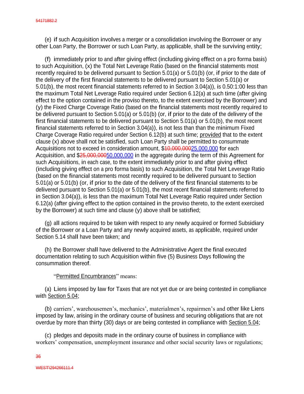 54171882.2 36 WEST\294266111.4 (e) if such Acquisition involves a merger or a consolidation involving the Borrower or any other Loan Party, the Borrower or such Loan Party, as applicable, shall be the surviving entity; (f) immediately prior to and after giving effect (including giving effect on a pro forma basis) to such Acquisition, (x) the Total Net Leverage Ratio (based on the financial statements most recently required to be delivered pursuant to Section 5.01(a) or 5.01(b) (or, if prior to the date of the delivery of the first financial statements to be delivered pursuant to Section 5.01(a) or 5.01(b), the most recent financial statements referred to in Section 3.04(a)), is 0.50:1:00 less than the maximum Total Net Leverage Ratio required under Section 6.12(a) at such time (after giving effect to the option contained in the proviso thereto, to the extent exercised by the Borrower) and (y) the Fixed Charge Coverage Ratio (based on the financial statements most recently required to be delivered pursuant to Section 5.01(a) or 5.01(b) (or, if prior to the date of the delivery of the first financial statements to be delivered pursuant to Section 5.01(a) or 5.01(b), the most recent financial statements referred to in Section 3.04(a)), is not less than than the minimum Fixed Charge Coverage Ratio required under Section 6.12(b) at such time; provided that to the extent clause (x) above shall not be satisfied, such Loan Party shall be permitted to consummate Acquisitions not to exceed in consideration amount, $10,000,00025,000,000 for each Acquisition, and $25,000,00050,000,000 in the aggregate during the term of this Agreement for such Acquisitions, in each case, to the extent immediately prior to and after giving effect (including giving effect on a pro forma basis) to such Acquisition, the Total Net Leverage Ratio (based on the financial statements most recently required to be delivered pursuant to Section 5.01(a) or 5.01(b) (or, if prior to the date of the delivery of the first financial statements to be delivered pursuant to Section 5.01(a) or 5.01(b), the most recent financial statements referred to in Section 3.04(a)), is less than the maximum Total Net Leverage Ratio required under Section 6.12(a) (after giving effect to the option contained in the proviso thereto, to the extent exercised by the Borrower) at such time and clause (y) above shall be satisfied; (g) all actions required to be taken with respect to any newly acquired or formed Subsidiary of the Borrower or a Loan Party and any newly acquired assets, as applicable, required under Section 5.14 shall have been taken; and (h) the Borrower shall have delivered to the Administrative Agent the final executed documentation relating to such Acquisition within five (5) Business Days following the consummation thereof. “Permitted Encumbrances” means: (a) Liens imposed by law for Taxes that are not yet due or are being contested in compliance with Section 5.04; (b) carriers’, warehousemen’s, mechanics’, materialmen’s, repairmen’s and other like Liens imposed by law, arising in the ordinary course of business and securing obligations that are not overdue by more than thirty (30) days or are being contested in compliance with Section 5.04; (c) pledges and deposits made in the ordinary course of business in compliance with workers’ compensation, unemployment insurance and other social security laws or regulations;