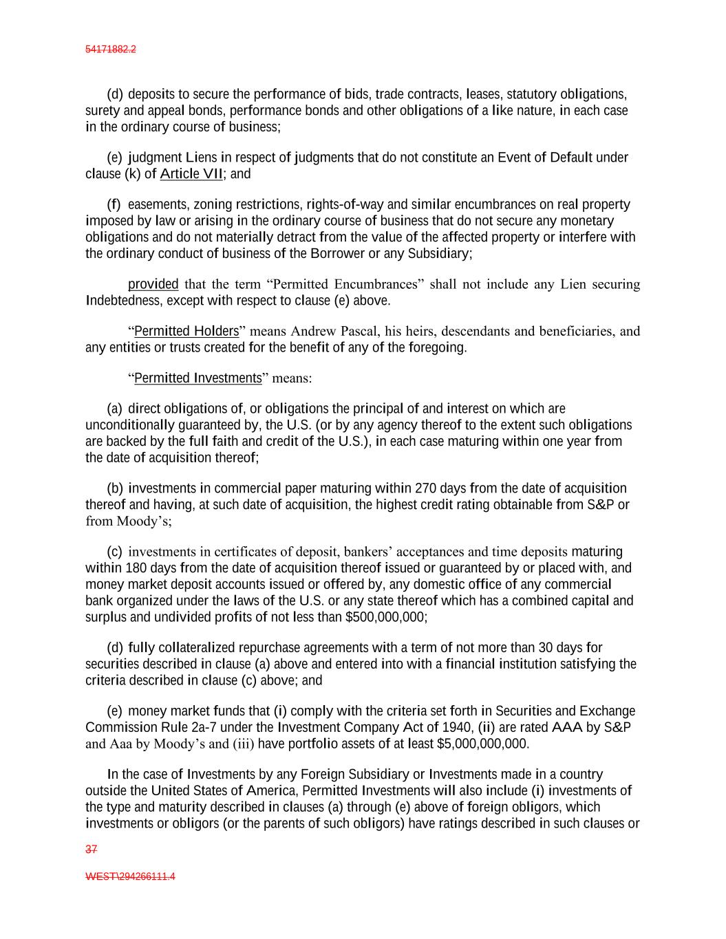 54171882.2 37 WEST\294266111.4 (d) deposits to secure the performance of bids, trade contracts, leases, statutory obligations, surety and appeal bonds, performance bonds and other obligations of a like nature, in each case in the ordinary course of business; (e) judgment Liens in respect of judgments that do not constitute an Event of Default under clause (k) of Article VII; and (f) easements, zoning restrictions, rights-of-way and similar encumbrances on real property imposed by law or arising in the ordinary course of business that do not secure any monetary obligations and do not materially detract from the value of the affected property or interfere with the ordinary conduct of business of the Borrower or any Subsidiary; provided that the term “Permitted Encumbrances” shall not include any Lien securing Indebtedness, except with respect to clause (e) above. “Permitted Holders” means Andrew Pascal, his heirs, descendants and beneficiaries, and any entities or trusts created for the benefit of any of the foregoing. “Permitted Investments” means: (a) direct obligations of, or obligations the principal of and interest on which are unconditionally guaranteed by, the U.S. (or by any agency thereof to the extent such obligations are backed by the full faith and credit of the U.S.), in each case maturing within one year from the date of acquisition thereof; (b) investments in commercial paper maturing within 270 days from the date of acquisition thereof and having, at such date of acquisition, the highest credit rating obtainable from S&P or from Moody’s; (c) investments in certificates of deposit, bankers’ acceptances and time deposits maturing within 180 days from the date of acquisition thereof issued or guaranteed by or placed with, and money market deposit accounts issued or offered by, any domestic office of any commercial bank organized under the laws of the U.S. or any state thereof which has a combined capital and surplus and undivided profits of not less than $500,000,000; (d) fully collateralized repurchase agreements with a term of not more than 30 days for securities described in clause (a) above and entered into with a financial institution satisfying the criteria described in clause (c) above; and (e) money market funds that (i) comply with the criteria set forth in Securities and Exchange Commission Rule 2a-7 under the Investment Company Act of 1940, (ii) are rated AAA by S&P and Aaa by Moody’s and (iii) have portfolio assets of at least $5,000,000,000. In the case of Investments by any Foreign Subsidiary or Investments made in a country outside the United States of America, Permitted Investments will also include (i) investments of the type and maturity described in clauses (a) through (e) above of foreign obligors, which investments or obligors (or the parents of such obligors) have ratings described in such clauses or