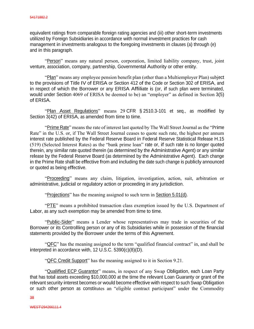54171882.2 38 WEST\294266111.4 equivalent ratings from comparable foreign rating agencies and (ii) other short-term investments utilized by Foreign Subsidiaries in accordance with normal investment practices for cash management in investments analogous to the foregoing investments in clauses (a) through (e) and in this paragraph. “Person” means any natural person, corporation, limited liability company, trust, joint venture, association, company, partnership, Governmental Authority or other entity. “Plan” means any employee pension benefit plan (other than a Multiemployer Plan) subject to the provisions of Title IV of ERISA or Section 412 of the Code or Section 302 of ERISA, and in respect of which the Borrower or any ERISA Affiliate is (or, if such plan were terminated, would under Section 4069 of ERISA be deemed to be) an “employer” as defined in Section 3(5) of ERISA. “Plan Asset Regulations” means 29 CFR § 2510.3-101 et seq., as modified by Section 3(42) of ERISA, as amended from time to time. “Prime Rate” means the rate of interest last quoted by The Wall Street Journal as the “Prime Rate” in the U.S. or, if The Wall Street Journal ceases to quote such rate, the highest per annum interest rate published by the Federal Reserve Board in Federal Reserve Statistical Release H.15 (519) (Selected Interest Rates) as the “bank prime loan” rate or, if such rate is no longer quoted therein, any similar rate quoted therein (as determined by the Administrative Agent) or any similar release by the Federal Reserve Board (as determined by the Administrative Agent). Each change in the Prime Rate shall be effective from and including the date such change is publicly announced or quoted as being effective. “Proceeding” means any claim, litigation, investigation, action, suit, arbitration or administrative, judicial or regulatory action or proceeding in any jurisdiction. “Projections” has the meaning assigned to such term in Section 5.01(d). “PTE” means a prohibited transaction class exemption issued by the U.S. Department of Labor, as any such exemption may be amended from time to time. “Public-Sider” means a Lender whose representatives may trade in securities of the Borrower or its Controlling person or any of its Subsidiaries while in possession of the financial statements provided by the Borrower under the terms of this Agreement. “QFC” has the meaning assigned to the term “qualified financial contract” in, and shall be interpreted in accordance with, 12 U.S.C. 5390(c)(8)(D). “QFC Credit Support” has the meaning assigned to it in Section 9.21. “Qualified ECP Guarantor” means, in respect of any Swap Obligation, each Loan Party that has total assets exceeding $10,000,000 at the time the relevant Loan Guaranty or grant of the relevant security interest becomes or would become effective with respect to such Swap Obligation or such other person as constitutes an “eligible contract participant” under the Commodity