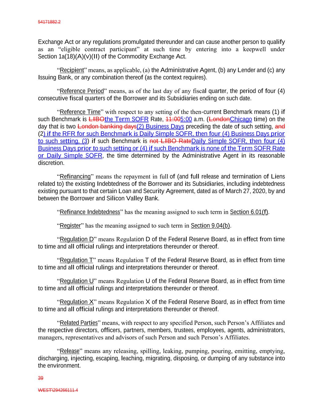 54171882.2 39 WEST\294266111.4 Exchange Act or any regulations promulgated thereunder and can cause another person to qualify as an “eligible contract participant” at such time by entering into a keepwell under Section 1a(18)(A)(v)(II) of the Commodity Exchange Act. “Recipient” means, as applicable, (a) the Administrative Agent, (b) any Lender and (c) any Issuing Bank, or any combination thereof (as the context requires). “Reference Period” means, as of the last day of any fiscal quarter, the period of four (4) consecutive fiscal quarters of the Borrower and its Subsidiaries ending on such date. “Reference Time” with respect to any setting of the then-current Benchmark means (1) if such Benchmark is LIBOthe Term SOFR Rate, 11:005:00 a.m. (LondonChicago time) on the day that is two London banking days(2) Business Days preceding the date of such setting, and (2) if the RFR for such Benchmark is Daily Simple SOFR, then four (4) Business Days prior to such setting, (3) if such Benchmark is not LIBO RateDaily Simple SOFR, then four (4) Business Days prior to such setting or (4) if such Benchmark is none of the Term SOFR Rate or Daily Simple SOFR, the time determined by the Administrative Agent in its reasonable discretion. “Refinancing” means the repayment in full of (and full release and termination of Liens related to) the existing Indebtedness of the Borrower and its Subsidiaries, including indebtedness existing pursuant to that certain Loan and Security Agreement, dated as of March 27, 2020, by and between the Borrower and Silicon Valley Bank. “Refinance Indebtedness” has the meaning assigned to such term in Section 6.01(f). “Register” has the meaning assigned to such term in Section 9.04(b). “Regulation D” means Regulation D of the Federal Reserve Board, as in effect from time to time and all official rulings and interpretations thereunder or thereof. “Regulation T” means Regulation T of the Federal Reserve Board, as in effect from time to time and all official rulings and interpretations thereunder or thereof. “Regulation U” means Regulation U of the Federal Reserve Board, as in effect from time to time and all official rulings and interpretations thereunder or thereof. “Regulation X” means Regulation X of the Federal Reserve Board, as in effect from time to time and all official rulings and interpretations thereunder or thereof. “Related Parties” means, with respect to any specified Person, such Person’s Affiliates and the respective directors, officers, partners, members, trustees, employees, agents, administrators, managers, representatives and advisors of such Person and such Person’s Affiliates. “Release” means any releasing, spilling, leaking, pumping, pouring, emitting, emptying, discharging, injecting, escaping, leaching, migrating, disposing, or dumping of any substance into the environment.