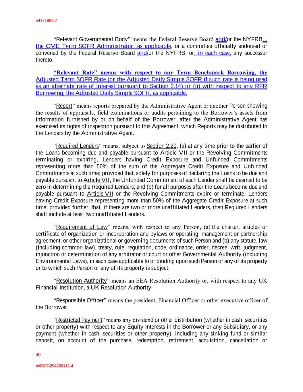 54171882.2 40 WEST\294266111.4 “Relevant Governmental Body” means the Federal Reserve Board and/or the NYFRB, , the CME Term SOFR Administrator, as applicable, or a committee officially endorsed or convened by the Federal Reserve Board and/or the NYFRB, or, in each case, any successor thereto. “Relevant Rate” means with respect to any Term Benchmark Borrowing, the Adjusted Term SOFR Rate (or the Adjusted Daily Simple SOFR if such rate is being used as an alternate rate of interest pursuant to Section 2.14) or (ii) with respect to any RFR Borrowing, the Adjusted Daily Simple SOFR, as applicable. “Report” means reports prepared by the Administrative Agent or another Person showing the results of appraisals, field examinations or audits pertaining to the Borrower’s assets from information furnished by or on behalf of the Borrower, after the Administrative Agent has exercised its rights of inspection pursuant to this Agreement, which Reports may be distributed to the Lenders by the Administrative Agent. “Required Lenders” means, subject to Section 2.20, (a) at any time prior to the earlier of the Loans becoming due and payable pursuant to Article VII or the Revolving Commitments terminating or expiring, Lenders having Credit Exposure and Unfunded Commitments representing more than 50% of the sum of the Aggregate Credit Exposure and Unfunded Commitments at such time; provided that, solely for purposes of declaring the Loans to be due and payable pursuant to Article VII, the Unfunded Commitment of each Lender shall be deemed to be zero in determining the Required Lenders; and (b) for all purposes after the Loans become due and payable pursuant to Article VII or the Revolving Commitments expire or terminate, Lenders having Credit Exposure representing more than 50% of the Aggregate Credit Exposure at such time; provided further, that, if there are two or more unaffiliated Lenders, then Required Lenders shall include at least two unaffiliated Lenders. “Requirement of Law” means, with respect to any Person, (a) the charter, articles or certificate of organization or incorporation and bylaws or operating, management or partnership agreement, or other organizational or governing documents of such Person and (b) any statute, law (including common law), treaty, rule, regulation, code, ordinance, order, decree, writ, judgment, injunction or determination of any arbitrator or court or other Governmental Authority (including Environmental Laws), in each case applicable to or binding upon such Person or any of its property or to which such Person or any of its property is subject. “Resolution Authority” means an EEA Resolution Authority or, with respect to any UK Financial Institution, a UK Resolution Authority. “Responsible Officer” means the president, Financial Officer or other executive officer of the Borrower. “Restricted Payment” means any dividend or other distribution (whether in cash, securities or other property) with respect to any Equity Interests in the Borrower or any Subsidiary, or any payment (whether in cash, securities or other property), including any sinking fund or similar deposit, on account of the purchase, redemption, retirement, acquisition, cancellation or