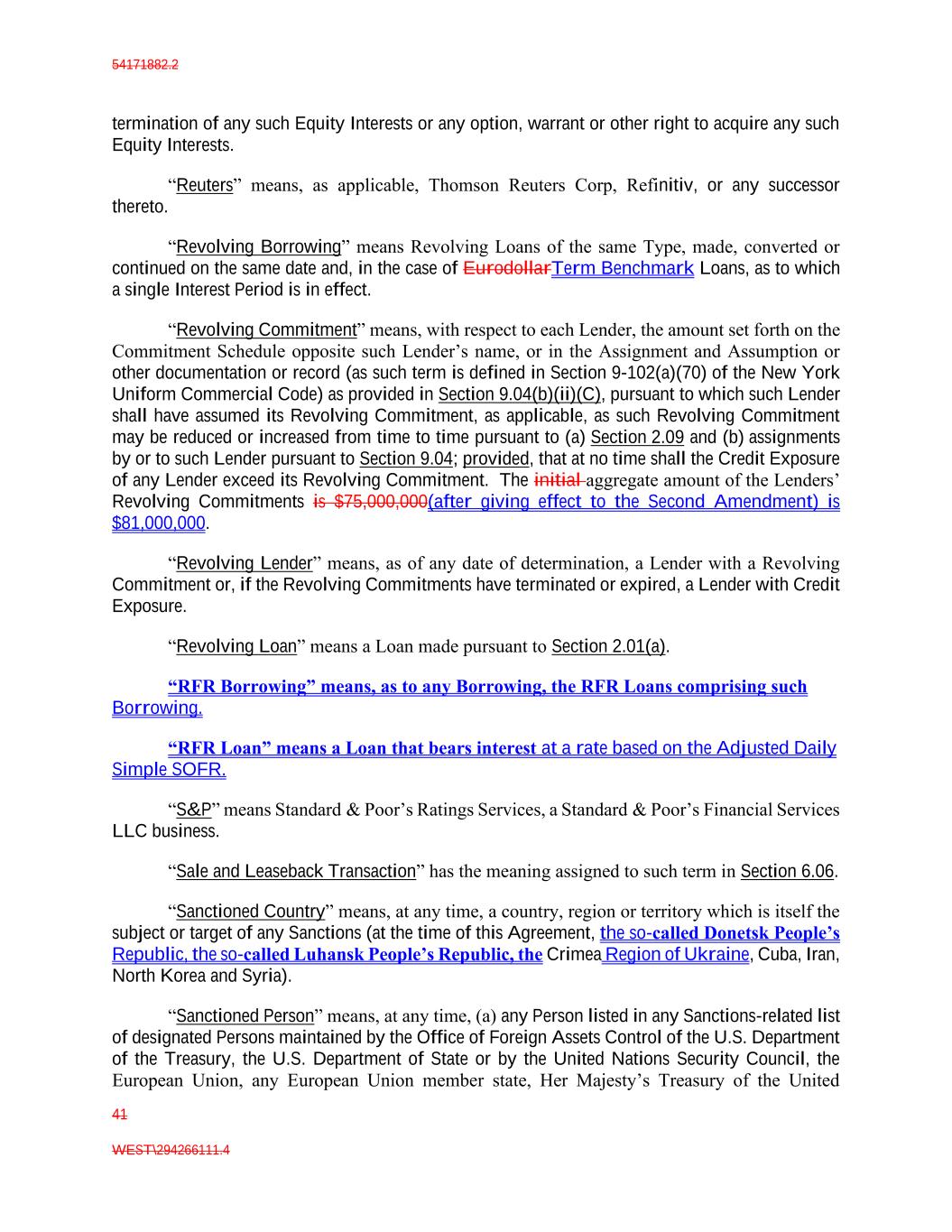 54171882.2 41 WEST\294266111.4 termination of any such Equity Interests or any option, warrant or other right to acquire any such Equity Interests. “Reuters” means, as applicable, Thomson Reuters Corp, Refinitiv, or any successor thereto. “Revolving Borrowing” means Revolving Loans of the same Type, made, converted or continued on the same date and, in the case of EurodollarTerm Benchmark Loans, as to which a single Interest Period is in effect. “Revolving Commitment” means, with respect to each Lender, the amount set forth on the Commitment Schedule opposite such Lender’s name, or in the Assignment and Assumption or other documentation or record (as such term is defined in Section 9-102(a)(70) of the New York Uniform Commercial Code) as provided in Section 9.04(b)(ii)(C), pursuant to which such Lender shall have assumed its Revolving Commitment, as applicable, as such Revolving Commitment may be reduced or increased from time to time pursuant to (a) Section 2.09 and (b) assignments by or to such Lender pursuant to Section 9.04; provided, that at no time shall the Credit Exposure of any Lender exceed its Revolving Commitment. The initial aggregate amount of the Lenders’ Revolving Commitments is $75,000,000(after giving effect to the Second Amendment) is $81,000,000. “Revolving Lender” means, as of any date of determination, a Lender with a Revolving Commitment or, if the Revolving Commitments have terminated or expired, a Lender with Credit Exposure. “Revolving Loan” means a Loan made pursuant to Section 2.01(a). “RFR Borrowing” means, as to any Borrowing, the RFR Loans comprising such Borrowing. “RFR Loan” means a Loan that bears interest at a rate based on the Adjusted Daily Simple SOFR. “S&P” means Standard & Poor’s Ratings Services, a Standard & Poor’s Financial Services LLC business. “Sale and Leaseback Transaction” has the meaning assigned to such term in Section 6.06. “Sanctioned Country” means, at any time, a country, region or territory which is itself the subject or target of any Sanctions (at the time of this Agreement, the so-called Donetsk People’s Republic, the so-called Luhansk People’s Republic, the Crimea Region of Ukraine, Cuba, Iran, North Korea and Syria). “Sanctioned Person” means, at any time, (a) any Person listed in any Sanctions-related list of designated Persons maintained by the Office of Foreign Assets Control of the U.S. Department of the Treasury, the U.S. Department of State or by the United Nations Security Council, the European Union, any European Union member state, Her Majesty’s Treasury of the United