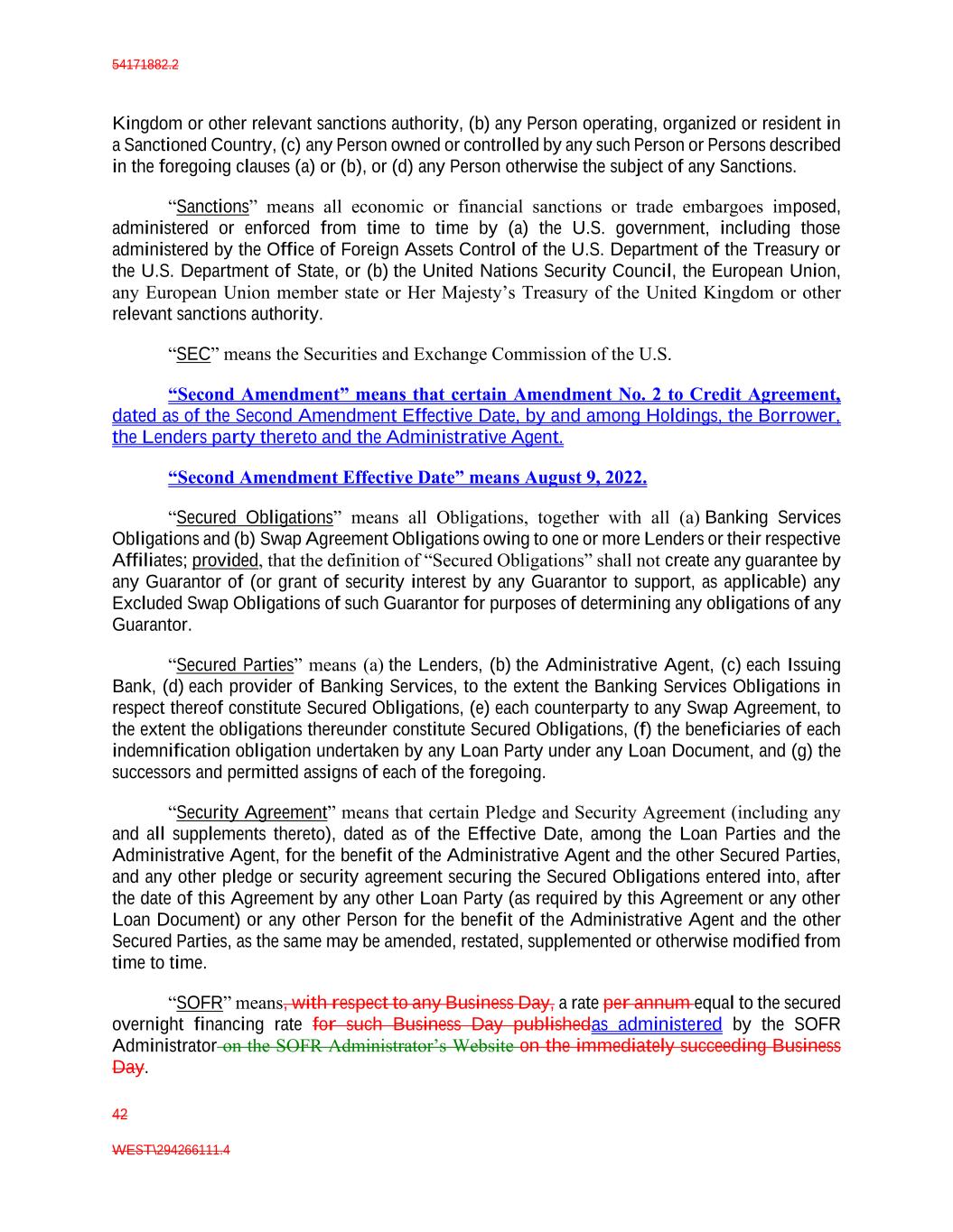 54171882.2 42 WEST\294266111.4 Kingdom or other relevant sanctions authority, (b) any Person operating, organized or resident in a Sanctioned Country, (c) any Person owned or controlled by any such Person or Persons described in the foregoing clauses (a) or (b), or (d) any Person otherwise the subject of any Sanctions. “Sanctions” means all economic or financial sanctions or trade embargoes imposed, administered or enforced from time to time by (a) the U.S. government, including those administered by the Office of Foreign Assets Control of the U.S. Department of the Treasury or the U.S. Department of State, or (b) the United Nations Security Council, the European Union, any European Union member state or Her Majesty’s Treasury of the United Kingdom or other relevant sanctions authority. “SEC” means the Securities and Exchange Commission of the U.S. “Second Amendment” means that certain Amendment No. 2 to Credit Agreement, dated as of the Second Amendment Effective Date, by and among Holdings, the Borrower, the Lenders party thereto and the Administrative Agent. “Second Amendment Effective Date” means August 9, 2022. “Secured Obligations” means all Obligations, together with all (a) Banking Services Obligations and (b) Swap Agreement Obligations owing to one or more Lenders or their respective Affiliates; provided, that the definition of “Secured Obligations” shall not create any guarantee by any Guarantor of (or grant of security interest by any Guarantor to support, as applicable) any Excluded Swap Obligations of such Guarantor for purposes of determining any obligations of any Guarantor. “Secured Parties” means (a) the Lenders, (b) the Administrative Agent, (c) each Issuing Bank, (d) each provider of Banking Services, to the extent the Banking Services Obligations in respect thereof constitute Secured Obligations, (e) each counterparty to any Swap Agreement, to the extent the obligations thereunder constitute Secured Obligations, (f) the beneficiaries of each indemnification obligation undertaken by any Loan Party under any Loan Document, and (g) the successors and permitted assigns of each of the foregoing. “Security Agreement” means that certain Pledge and Security Agreement (including any and all supplements thereto), dated as of the Effective Date, among the Loan Parties and the Administrative Agent, for the benefit of the Administrative Agent and the other Secured Parties, and any other pledge or security agreement securing the Secured Obligations entered into, after the date of this Agreement by any other Loan Party (as required by this Agreement or any other Loan Document) or any other Person for the benefit of the Administrative Agent and the other Secured Parties, as the same may be amended, restated, supplemented or otherwise modified from time to time. “SOFR” means, with respect to any Business Day, a rate per annum equal to the secured overnight financing rate for such Business Day publishedas administered by the SOFR Administrator on the SOFR Administrator’s Website on the immediately succeeding Business Day.