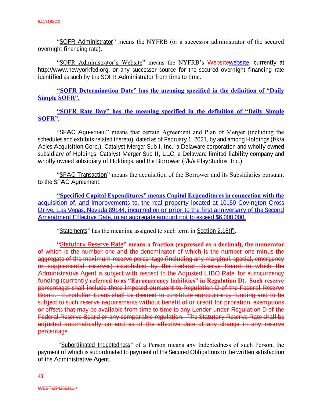 54171882.2 43 WEST\294266111.4 “SOFR Administrator” means the NYFRB (or a successor administrator of the secured overnight financing rate). “SOFR Administrator’s Website” means the NYFRB’s Websitewebsite, currently at http://www.newyorkfed.org, or any successor source for the secured overnight financing rate identified as such by the SOFR Administrator from time to time. “SOFR Determination Date” has the meaning specified in the definition of “Daily Simple SOFR”. “SOFR Rate Day” has the meaning specified in the definition of “Daily Simple SOFR”. “SPAC Agreement” means that certain Agreement and Plan of Merger (including the schedules and exhibits related thereto), dated as of February 1, 2021, by and among Holdings (f/k/a Acies Acquisition Corp.), Catalyst Merger Sub I, Inc., a Delaware corporation and wholly owned subsidiary of Holdings, Catalyst Merger Sub II, LLC, a Delaware limited liability company and wholly owned subsidiary of Holdings, and the Borrower (f/k/a PlayStudios, Inc.). “SPAC Transaction” means the acquisition of the Borrower and its Subsidiaries pursuant to the SPAC Agreement. “Specified Capital Expenditures” means Capital Expenditures in connection with the acquisition of, and improvements to, the real property located at 10150 Covington Cross Drive, Las Vegas, Nevada 89144, incurred on or prior to the first anniversary of the Second Amendment Effective Date, in an aggregate amount not to exceed $6,000,000. “Statements” has the meaning assigned to such term in Section 2.18(f). “Statutory Reserve Rate” means a fraction (expressed as a decimal), the numerator of which is the number one and the denominator of which is the number one minus the aggregate of the maximum reserve percentage (including any marginal, special, emergency or supplemental reserves) established by the Federal Reserve Board to which the Administrative Agent is subject with respect to the Adjusted LIBO Rate, for eurocurrency funding (currently referred to as “Eurocurrency liabilities” in Regulation D). Such reserve percentages shall include those imposed pursuant to Regulation D of the Federal Reserve Board. Eurodollar Loans shall be deemed to constitute eurocurrency funding and to be subject to such reserve requirements without benefit of or credit for proration, exemptions or offsets that may be available from time to time to any Lender under Regulation D of the Federal Reserve Board or any comparable regulation. The Statutory Reserve Rate shall be adjusted automatically on and as of the effective date of any change in any reserve percentage. “Subordinated Indebtedness” of a Person means any Indebtedness of such Person, the payment of which is subordinated to payment of the Secured Obligations to the written satisfaction of the Administrative Agent.