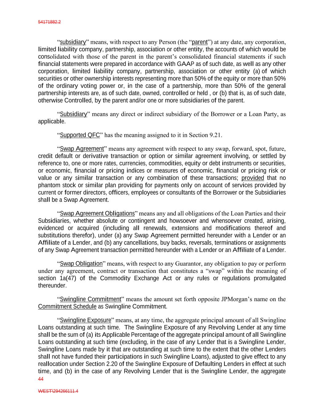 54171882.2 44 WEST\294266111.4 “subsidiary” means, with respect to any Person (the “parent”) at any date, any corporation, limited liability company, partnership, association or other entity, the accounts of which would be consolidated with those of the parent in the parent’s consolidated financial statements if such financial statements were prepared in accordance with GAAP as of such date, as well as any other corporation, limited liability company, partnership, association or other entity (a) of which securities or other ownership interests representing more than 50% of the equity or more than 50% of the ordinary voting power or, in the case of a partnership, more than 50% of the general partnership interests are, as of such date, owned, controlled or held , or (b) that is, as of such date, otherwise Controlled, by the parent and/or one or more subsidiaries of the parent. “Subsidiary” means any direct or indirect subsidiary of the Borrower or a Loan Party, as applicable. “Supported QFC” has the meaning assigned to it in Section 9.21. “Swap Agreement” means any agreement with respect to any swap, forward, spot, future, credit default or derivative transaction or option or similar agreement involving, or settled by reference to, one or more rates, currencies, commodities, equity or debt instruments or securities, or economic, financial or pricing indices or measures of economic, financial or pricing risk or value or any similar transaction or any combination of these transactions; provided that no phantom stock or similar plan providing for payments only on account of services provided by current or former directors, officers, employees or consultants of the Borrower or the Subsidiaries shall be a Swap Agreement. “Swap Agreement Obligations” means any and all obligations of the Loan Parties and their Subsidiaries, whether absolute or contingent and howsoever and whensoever created, arising, evidenced or acquired (including all renewals, extensions and modifications thereof and substitutions therefor), under (a) any Swap Agreement permitted hereunder with a Lender or an Affiliate of a Lender, and (b) any cancellations, buy backs, reversals, terminations or assignments of any Swap Agreement transaction permitted hereunder with a Lender or an Affiliate of a Lender. “Swap Obligation” means, with respect to any Guarantor, any obligation to pay or perform under any agreement, contract or transaction that constitutes a “swap” within the meaning of section 1a(47) of the Commodity Exchange Act or any rules or regulations promulgated thereunder. “Swingline Commitment” means the amount set forth opposite JPMorgan’s name on the Commitment Schedule as Swingline Commitment. “Swingline Exposure” means, at any time, the aggregate principal amount of all Swingline Loans outstanding at such time. The Swingline Exposure of any Revolving Lender at any time shall be the sum of (a) its Applicable Percentage of the aggregate principal amount of all Swingline Loans outstanding at such time (excluding, in the case of any Lender that is a Swingline Lender, Swingline Loans made by it that are outstanding at such time to the extent that the other Lenders shall not have funded their participations in such Swingline Loans), adjusted to give effect to any reallocation under Section 2.20 of the Swingline Exposure of Defaulting Lenders in effect at such time, and (b) in the case of any Revolving Lender that is the Swingline Lender, the aggregate