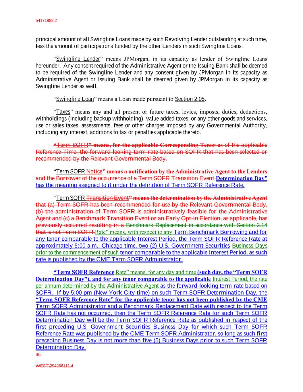 54171882.2 45 WEST\294266111.4 principal amount of all Swingline Loans made by such Revolving Lender outstanding at such time, less the amount of participations funded by the other Lenders in such Swingline Loans. “Swingline Lender” means JPMorgan, in its capacity as lender of Swingline Loans hereunder. Any consent required of the Administrative Agent or the Issuing Bank shall be deemed to be required of the Swingline Lender and any consent given by JPMorgan in its capacity as Administrative Agent or Issuing Bank shall be deemed given by JPMorgan in its capacity as Swingline Lender as well. “Swingline Loan” means a Loan made pursuant to Section 2.05. “Taxes” means any and all present or future taxes, levies, imposts, duties, deductions, withholdings (including backup withholding), value added taxes, or any other goods and services, use or sales taxes, assessments, fees or other charges imposed by any Governmental Authority, including any interest, additions to tax or penalties applicable thereto. “Term SOFR” means, for the applicable Corresponding Tenor as of the applicable Reference Time, the forward-looking term rate based on SOFR that has been selected or recommended by the Relevant Governmental Body. “Term SOFR Notice” means a notification by the Administrative Agent to the Lenders and the Borrower of the occurrence of a Term SOFR Transition Event.Determination Day” has the meaning assigned to it under the definition of Term SOFR Reference Rate. “Term SOFR Transition Event” means the determination by the Administrative Agent that (a) Term SOFR has been recommended for use by the Relevant Governmental Body, (b) the administration of Term SOFR is administratively feasible for the Administrative Agent and (c) a Benchmark Transition Event or an Early Opt-in Election, as applicable, has previously occurred resulting in a Benchmark Replacement in accordance with Section 2.14 that is not Term SOFR.Rate” means, with respect to any Term Benchmark Borrowing and for any tenor comparable to the applicable Interest Period, the Term SOFR Reference Rate at approximately 5:00 a.m., Chicago time, two (2) U.S. Government Securities Business Days prior to the commencement of such tenor comparable to the applicable Interest Period, as such rate is published by the CME Term SOFR Administrator. “Term SOFR Reference Rate” means, for any day and time (such day, the “Term SOFR Determination Day”), and for any tenor comparable to the applicable Interest Period, the rate per annum determined by the Administrative Agent as the forward-looking term rate based on SOFR. If by 5:00 pm (New York City time) on such Term SOFR Determination Day, the “Term SOFR Reference Rate” for the applicable tenor has not been published by the CME Term SOFR Administrator and a Benchmark Replacement Date with respect to the Term SOFR Rate has not occurred, then the Term SOFR Reference Rate for such Term SOFR Determination Day will be the Term SOFR Reference Rate as published in respect of the first preceding U.S. Government Securities Business Day for which such Term SOFR Reference Rate was published by the CME Term SOFR Administrator, so long as such first preceding Business Day is not more than five (5) Business Days prior to such Term SOFR Determination Day.
