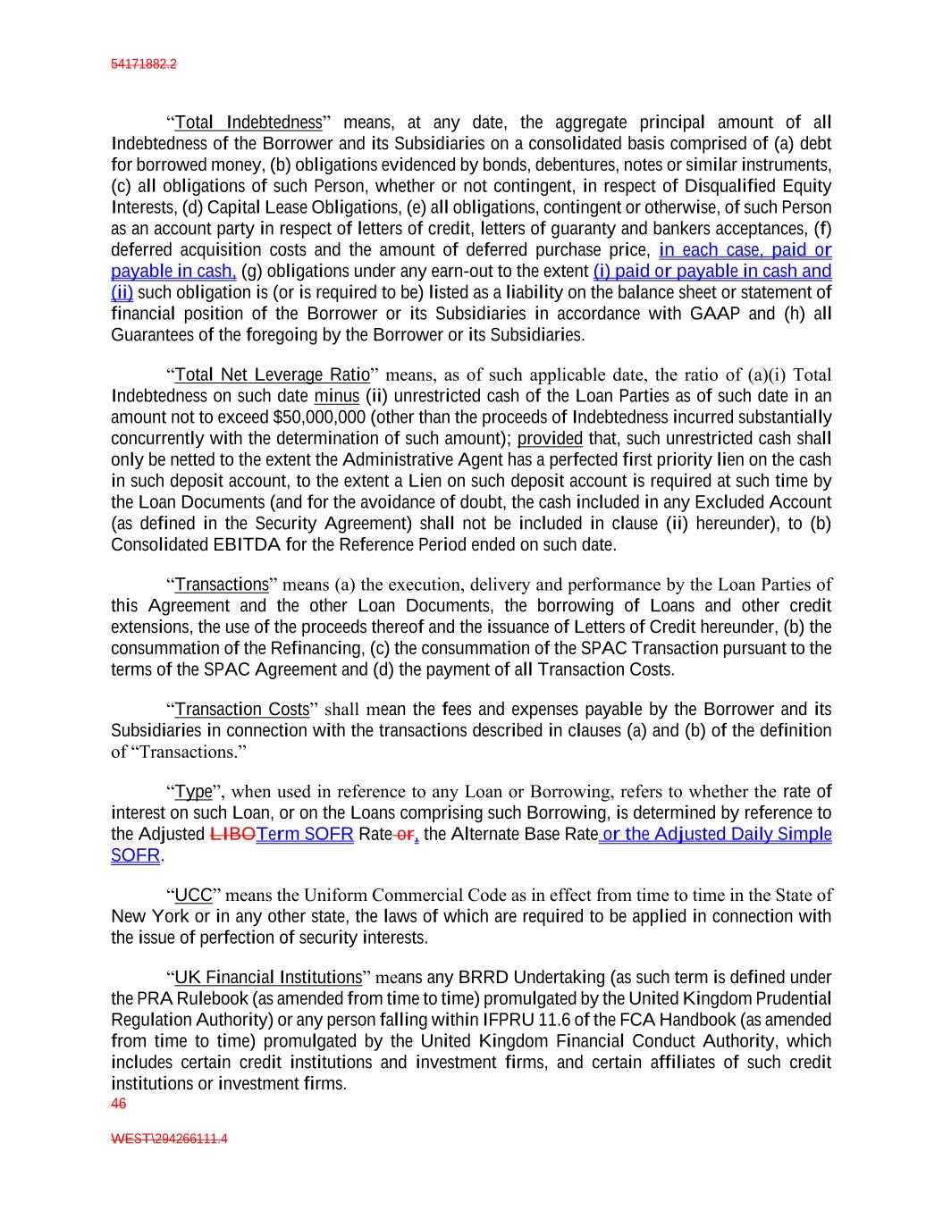 54171882.2 46 WEST\294266111.4 “Total Indebtedness” means, at any date, the aggregate principal amount of all Indebtedness of the Borrower and its Subsidiaries on a consolidated basis comprised of (a) debt for borrowed money, (b) obligations evidenced by bonds, debentures, notes or similar instruments, (c) all obligations of such Person, whether or not contingent, in respect of Disqualified Equity Interests, (d) Capital Lease Obligations, (e) all obligations, contingent or otherwise, of such Person as an account party in respect of letters of credit, letters of guaranty and bankers acceptances, (f) deferred acquisition costs and the amount of deferred purchase price, in each case, paid or payable in cash, (g) obligations under any earn-out to the extent (i) paid or payable in cash and (ii) such obligation is (or is required to be) listed as a liability on the balance sheet or statement of financial position of the Borrower or its Subsidiaries in accordance with GAAP and (h) all Guarantees of the foregoing by the Borrower or its Subsidiaries. “Total Net Leverage Ratio” means, as of such applicable date, the ratio of (a)(i) Total Indebtedness on such date minus (ii) unrestricted cash of the Loan Parties as of such date in an amount not to exceed $50,000,000 (other than the proceeds of Indebtedness incurred substantially concurrently with the determination of such amount); provided that, such unrestricted cash shall only be netted to the extent the Administrative Agent has a perfected first priority lien on the cash in such deposit account, to the extent a Lien on such deposit account is required at such time by the Loan Documents (and for the avoidance of doubt, the cash included in any Excluded Account (as defined in the Security Agreement) shall not be included in clause (ii) hereunder), to (b) Consolidated EBITDA for the Reference Period ended on such date. “Transactions” means (a) the execution, delivery and performance by the Loan Parties of this Agreement and the other Loan Documents, the borrowing of Loans and other credit extensions, the use of the proceeds thereof and the issuance of Letters of Credit hereunder, (b) the consummation of the Refinancing, (c) the consummation of the SPAC Transaction pursuant to the terms of the SPAC Agreement and (d) the payment of all Transaction Costs. “Transaction Costs” shall mean the fees and expenses payable by the Borrower and its Subsidiaries in connection with the transactions described in clauses (a) and (b) of the definition of “Transactions.” “Type”, when used in reference to any Loan or Borrowing, refers to whether the rate of interest on such Loan, or on the Loans comprising such Borrowing, is determined by reference to the Adjusted LIBOTerm SOFR Rate or, the Alternate Base Rate or the Adjusted Daily Simple SOFR. “UCC” means the Uniform Commercial Code as in effect from time to time in the State of New York or in any other state, the laws of which are required to be applied in connection with the issue of perfection of security interests. “UK Financial Institutions” means any BRRD Undertaking (as such term is defined under the PRA Rulebook (as amended from time to time) promulgated by the United Kingdom Prudential Regulation Authority) or any person falling within IFPRU 11.6 of the FCA Handbook (as amended from time to time) promulgated by the United Kingdom Financial Conduct Authority, which includes certain credit institutions and investment firms, and certain affiliates of such credit institutions or investment firms.