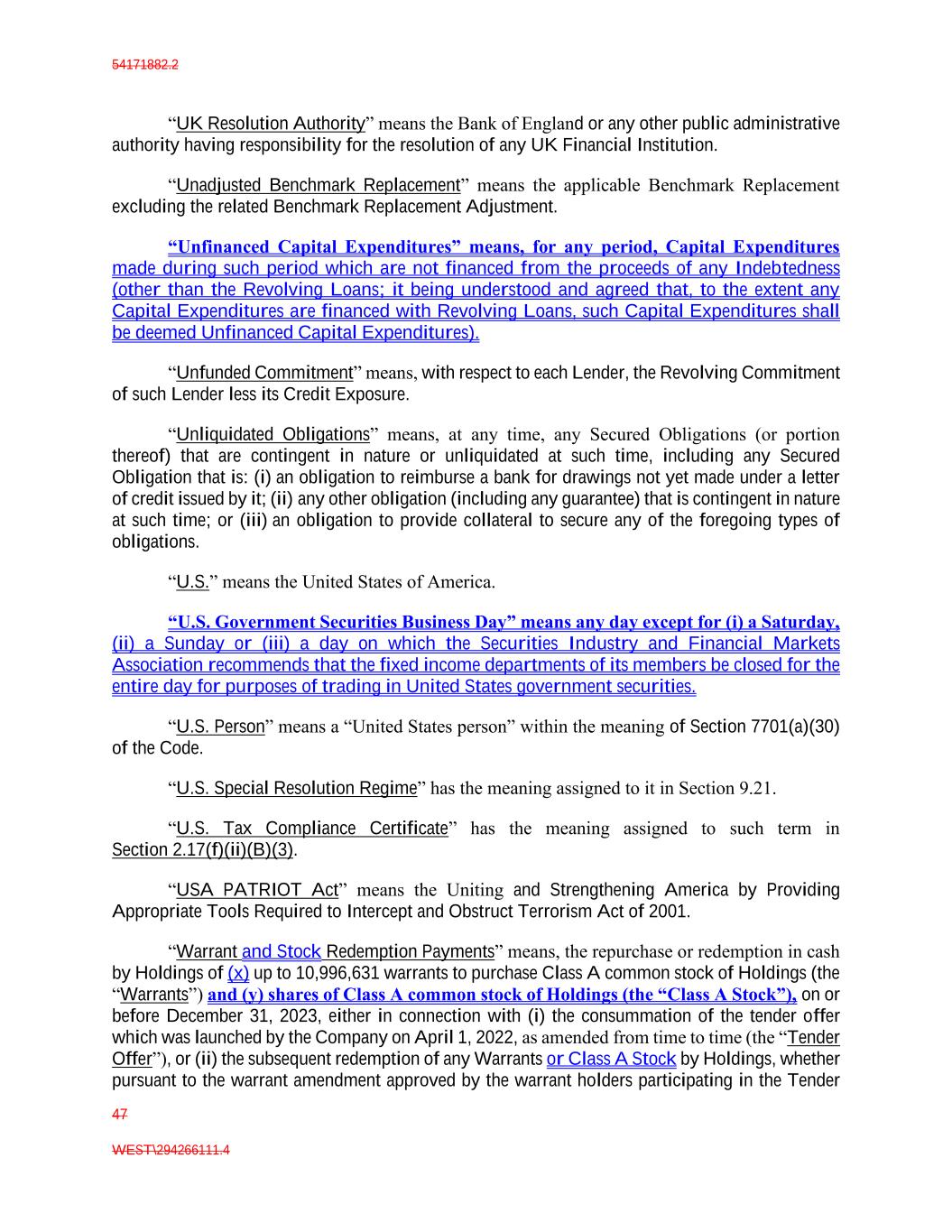54171882.2 47 WEST\294266111.4 “UK Resolution Authority” means the Bank of England or any other public administrative authority having responsibility for the resolution of any UK Financial Institution. “Unadjusted Benchmark Replacement” means the applicable Benchmark Replacement excluding the related Benchmark Replacement Adjustment. “Unfinanced Capital Expenditures” means, for any period, Capital Expenditures made during such period which are not financed from the proceeds of any Indebtedness (other than the Revolving Loans; it being understood and agreed that, to the extent any Capital Expenditures are financed with Revolving Loans, such Capital Expenditures shall be deemed Unfinanced Capital Expenditures). “Unfunded Commitment” means, with respect to each Lender, the Revolving Commitment of such Lender less its Credit Exposure. “Unliquidated Obligations” means, at any time, any Secured Obligations (or portion thereof) that are contingent in nature or unliquidated at such time, including any Secured Obligation that is: (i) an obligation to reimburse a bank for drawings not yet made under a letter of credit issued by it; (ii) any other obligation (including any guarantee) that is contingent in nature at such time; or (iii) an obligation to provide collateral to secure any of the foregoing types of obligations. “U.S.” means the United States of America. “U.S. Government Securities Business Day” means any day except for (i) a Saturday, (ii) a Sunday or (iii) a day on which the Securities Industry and Financial Markets Association recommends that the fixed income departments of its members be closed for the entire day for purposes of trading in United States government securities. “U.S. Person” means a “United States person” within the meaning of Section 7701(a)(30) of the Code. “U.S. Special Resolution Regime” has the meaning assigned to it in Section 9.21. “U.S. Tax Compliance Certificate” has the meaning assigned to such term in Section 2.17(f)(ii)(B)(3). “USA PATRIOT Act” means the Uniting and Strengthening America by Providing Appropriate Tools Required to Intercept and Obstruct Terrorism Act of 2001. “Warrant and Stock Redemption Payments” means, the repurchase or redemption in cash by Holdings of (x) up to 10,996,631 warrants to purchase Class A common stock of Holdings (the “Warrants”) and (y) shares of Class A common stock of Holdings (the “Class A Stock”), on or before December 31, 2023, either in connection with (i) the consummation of the tender offer which was launched by the Company on April 1, 2022, as amended from time to time (the “Tender Offer”), or (ii) the subsequent redemption of any Warrants or Class A Stock by Holdings, whether pursuant to the warrant amendment approved by the warrant holders participating in the Tender