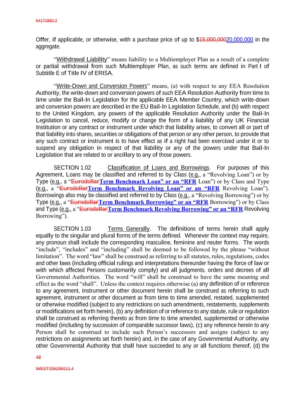 54171882.2 48 WEST\294266111.4 Offer, if applicable, or otherwise, with a purchase price of up to $15,000,00020,000,000 in the aggregate. “Withdrawal Liability” means liability to a Multiemployer Plan as a result of a complete or partial withdrawal from such Multiemployer Plan, as such terms are defined in Part I of Subtitle E of Title IV of ERISA. “Write-Down and Conversion Powers” means, (a) with respect to any EEA Resolution Authority, the write-down and conversion powers of such EEA Resolution Authority from time to time under the Bail-In Legislation for the applicable EEA Member Country, which write-down and conversion powers are described in the EU Bail-In Legislation Schedule, and (b) with respect to the United Kingdom, any powers of the applicable Resolution Authority under the Bail-In Legislation to cancel, reduce, modify or change the form of a liability of any UK Financial Institution or any contract or instrument under which that liability arises, to convert all or part of that liability into shares, securities or obligations of that person or any other person, to provide that any such contract or instrument is to have effect as if a right had been exercised under it or to suspend any obligation in respect of that liability or any of the powers under that Bail-In Legislation that are related to or ancillary to any of those powers. SECTION 1.02 Classification of Loans and Borrowings. For purposes of this Agreement, Loans may be classified and referred to by Class (e.g., a “Revolving Loan”) or by Type (e.g., a “EurodollarTerm Benchmark Loan” or an “RFR Loan”) or by Class and Type (e.g., a “EurodollarTerm Benchmark Revolving Loan” or an “RFR Revolving Loan”). Borrowings also may be classified and referred to by Class (e.g., a “Revolving Borrowing”) or by Type (e.g., a “EurodollarTerm Benchmark Borrowing” or an “RFR Borrowing”) or by Class and Type (e.g., a “EurodollarTerm Benchmark Revolving Borrowing” or an “RFR Revolving Borrowing”). SECTION 1.03 Terms Generally. The definitions of terms herein shall apply equally to the singular and plural forms of the terms defined. Whenever the context may require, any pronoun shall include the corresponding masculine, feminine and neuter forms. The words “include”, “includes” and “including” shall be deemed to be followed by the phrase “without limitation”. The word “law” shall be construed as referring to all statutes, rules, regulations, codes and other laws (including official rulings and interpretations thereunder having the force of law or with which affected Persons customarily comply) and all judgments, orders and decrees of all Governmental Authorities. The word “will” shall be construed to have the same meaning and effect as the word “shall”. Unless the context requires otherwise (a) any definition of or reference to any agreement, instrument or other document herein shall be construed as referring to such agreement, instrument or other document as from time to time amended, restated, supplemented or otherwise modified (subject to any restrictions on such amendments, restatements, supplements or modifications set forth herein), (b) any definition of or reference to any statute, rule or regulation shall be construed as referring thereto as from time to time amended, supplemented or otherwise modified (including by succession of comparable successor laws), (c) any reference herein to any Person shall be construed to include such Person’s successors and assigns (subject to any restrictions on assignments set forth herein) and, in the case of any Governmental Authority, any other Governmental Authority that shall have succeeded to any or all functions thereof, (d) the