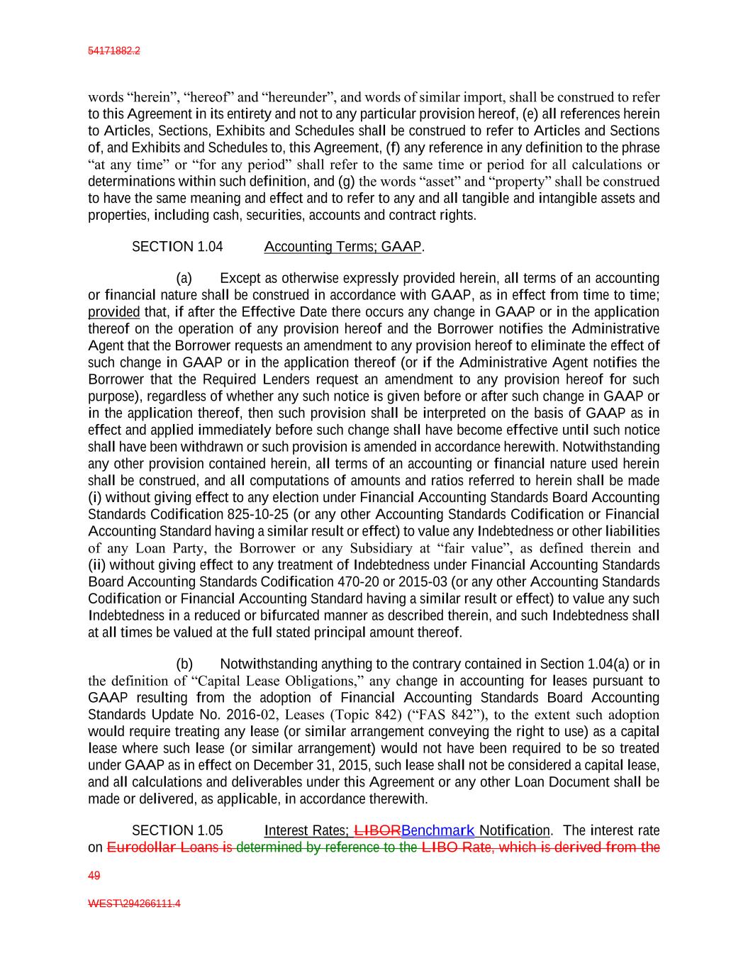 54171882.2 49 WEST\294266111.4 words “herein”, “hereof” and “hereunder”, and words of similar import, shall be construed to refer to this Agreement in its entirety and not to any particular provision hereof, (e) all references herein to Articles, Sections, Exhibits and Schedules shall be construed to refer to Articles and Sections of, and Exhibits and Schedules to, this Agreement, (f) any reference in any definition to the phrase “at any time” or “for any period” shall refer to the same time or period for all calculations or determinations within such definition, and (g) the words “asset” and “property” shall be construed to have the same meaning and effect and to refer to any and all tangible and intangible assets and properties, including cash, securities, accounts and contract rights. SECTION 1.04 Accounting Terms; GAAP. (a) Except as otherwise expressly provided herein, all terms of an accounting or financial nature shall be construed in accordance with GAAP, as in effect from time to time; provided that, if after the Effective Date there occurs any change in GAAP or in the application thereof on the operation of any provision hereof and the Borrower notifies the Administrative Agent that the Borrower requests an amendment to any provision hereof to eliminate the effect of such change in GAAP or in the application thereof (or if the Administrative Agent notifies the Borrower that the Required Lenders request an amendment to any provision hereof for such purpose), regardless of whether any such notice is given before or after such change in GAAP or in the application thereof, then such provision shall be interpreted on the basis of GAAP as in effect and applied immediately before such change shall have become effective until such notice shall have been withdrawn or such provision is amended in accordance herewith. Notwithstanding any other provision contained herein, all terms of an accounting or financial nature used herein shall be construed, and all computations of amounts and ratios referred to herein shall be made (i) without giving effect to any election under Financial Accounting Standards Board Accounting Standards Codification 825-10-25 (or any other Accounting Standards Codification or Financial Accounting Standard having a similar result or effect) to value any Indebtedness or other liabilities of any Loan Party, the Borrower or any Subsidiary at “fair value”, as defined therein and (ii) without giving effect to any treatment of Indebtedness under Financial Accounting Standards Board Accounting Standards Codification 470-20 or 2015-03 (or any other Accounting Standards Codification or Financial Accounting Standard having a similar result or effect) to value any such Indebtedness in a reduced or bifurcated manner as described therein, and such Indebtedness shall at all times be valued at the full stated principal amount thereof. (b) Notwithstanding anything to the contrary contained in Section 1.04(a) or in the definition of “Capital Lease Obligations,” any change in accounting for leases pursuant to GAAP resulting from the adoption of Financial Accounting Standards Board Accounting Standards Update No. 2016-02, Leases (Topic 842) (“FAS 842”), to the extent such adoption would require treating any lease (or similar arrangement conveying the right to use) as a capital lease where such lease (or similar arrangement) would not have been required to be so treated under GAAP as in effect on December 31, 2015, such lease shall not be considered a capital lease, and all calculations and deliverables under this Agreement or any other Loan Document shall be made or delivered, as applicable, in accordance therewith. SECTION 1.05 Interest Rates; LIBORBenchmark Notification. The interest rate on Eurodollar Loans is determined by reference to the LIBO Rate, which is derived from the