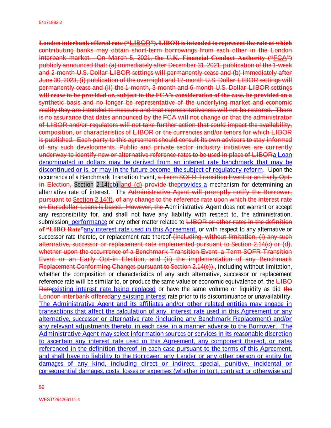 54171882.2 50 WEST\294266111.4 London interbank offered rate (“LIBOR”). LIBOR is intended to represent the rate at which contributing banks may obtain short-term borrowings from each other in the London interbank market. On March 5, 2021, the U.K. Financial Conduct Authority (“FCA”) publicly announced that: (a) immediately after December 31, 2021, publication of the 1-week and 2-month U.S. Dollar LIBOR settings will permanently cease and (b) immediately after June 30, 2023, (i) publication of the overnight and 12-month U.S. Dollar LIBOR settings will permanently cease and (ii) the 1-month, 3-month and 6-month U.S. Dollar LIBOR settings will cease to be provided or, subject to the FCA’s consideration of the case, be provided on a synthetic basis and no longer be representative of the underlying market and economic reality they are intended to measure and that representativeness will not be restored. There is no assurance that dates announced by the FCA will not change or that the administrator of LIBOR and/or regulators will not take further action that could impact the availability, composition, or characteristics of LIBOR or the currencies and/or tenors for which LIBOR is published. Each party to this agreement should consult its own advisors to stay informed of any such developments. Public and private sector industry initiatives are currently underway to identify new or alternative reference rates to be used in place of LIBORa Loan denominated in dollars may be derived from an interest rate benchmark that may be discontinued or is, or may in the future become, the subject of regulatory reform. Upon the occurrence of a Benchmark Transition Event, a Term SOFR Transition Event or an Early Opt- in Election, Section 2.14(cb) and (d) provide theprovides a mechanism for determining an alternative rate of interest. The Administrative Agent will promptly notify the Borrower, pursuant to Section 2.14(f), of any change to the reference rate upon which the interest rate on Eurodollar Loans is based. However, the Administrative Agent does not warrant or accept any responsibility for, and shall not have any liability with respect to, the administration, submission, performance or any other matter related to LIBOR or other rates in the definition of “LIBO Rate”any interest rate used in this Agreement, or with respect to any alternative or successor rate thereto, or replacement rate thereof (including, without limitation, (i) any such alternative, successor or replacement rate implemented pursuant to Section 2.14(c) or (d), whether upon the occurrence of a Benchmark Transition Event, a Term SOFR Transition Event or an Early Opt-in Election, and (ii) the implementation of any Benchmark Replacement Conforming Changes pursuant to Section 2.14(e)),, including without limitation, whether the composition or characteristics of any such alternative, successor or replacement reference rate will be similar to, or produce the same value or economic equivalence of, the LIBO Rateexisting interest rate being replaced or have the same volume or liquidity as did the London interbank offeredany existing interest rate prior to its discontinuance or unavailability. The Administrative Agent and its affiliates and/or other related entities may engage in transactions that affect the calculation of any interest rate used in this Agreement or any alternative, successor or alternative rate (including any Benchmark Replacement) and/or any relevant adjustments thereto, in each case, in a manner adverse to the Borrower. The Administrative Agent may select information sources or services in its reasonable discretion to ascertain any interest rate used in this Agreement, any component thereof, or rates referenced in the definition thereof, in each case pursuant to the terms of this Agreement, and shall have no liability to the Borrower, any Lender or any other person or entity for damages of any kind, including direct or indirect, special, punitive, incidental or consequential damages, costs, losses or expenses (whether in tort, contract or otherwise and