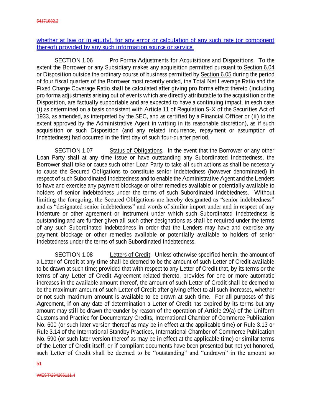54171882.2 51 WEST\294266111.4 whether at law or in equity), for any error or calculation of any such rate (or component thereof) provided by any such information source or service. SECTION 1.06 Pro Forma Adjustments for Acquisitions and Dispositions. To the extent the Borrower or any Subsidiary makes any acquisition permitted pursuant to Section 6.04 or Disposition outside the ordinary course of business permitted by Section 6.05 during the period of four fiscal quarters of the Borrower most recently ended, the Total Net Leverage Ratio and the Fixed Charge Coverage Ratio shall be calculated after giving pro forma effect thereto (including pro forma adjustments arising out of events which are directly attributable to the acquisition or the Disposition, are factually supportable and are expected to have a continuing impact, in each case (i) as determined on a basis consistent with Article 11 of Regulation S-X of the Securities Act of 1933, as amended, as interpreted by the SEC, and as certified by a Financial Officer or (ii) to the extent approved by the Administrative Agent in writing in its reasonable discretion), as if such acquisition or such Disposition (and any related incurrence, repayment or assumption of Indebtedness) had occurred in the first day of such four-quarter period. SECTION 1.07 Status of Obligations. In the event that the Borrower or any other Loan Party shall at any time issue or have outstanding any Subordinated Indebtedness, the Borrower shall take or cause such other Loan Party to take all such actions as shall be necessary to cause the Secured Obligations to constitute senior indebtedness (however denominated) in respect of such Subordinated Indebtedness and to enable the Administrative Agent and the Lenders to have and exercise any payment blockage or other remedies available or potentially available to holders of senior indebtedness under the terms of such Subordinated Indebtedness. Without limiting the foregoing, the Secured Obligations are hereby designated as “senior indebtedness” and as “designated senior indebtedness” and words of similar import under and in respect of any indenture or other agreement or instrument under which such Subordinated Indebtedness is outstanding and are further given all such other designations as shall be required under the terms of any such Subordinated Indebtedness in order that the Lenders may have and exercise any payment blockage or other remedies available or potentially available to holders of senior indebtedness under the terms of such Subordinated Indebtedness. SECTION 1.08 Letters of Credit. Unless otherwise specified herein, the amount of a Letter of Credit at any time shall be deemed to be the amount of such Letter of Credit available to be drawn at such time; provided that with respect to any Letter of Credit that, by its terms or the terms of any Letter of Credit Agreement related thereto, provides for one or more automatic increases in the available amount thereof, the amount of such Letter of Credit shall be deemed to be the maximum amount of such Letter of Credit after giving effect to all such increases, whether or not such maximum amount is available to be drawn at such time. For all purposes of this Agreement, if on any date of determination a Letter of Credit has expired by its terms but any amount may still be drawn thereunder by reason of the operation of Article 29(a) of the Uniform Customs and Practice for Documentary Credits, International Chamber of Commerce Publication No. 600 (or such later version thereof as may be in effect at the applicable time) or Rule 3.13 or Rule 3.14 of the International Standby Practices, International Chamber of Commerce Publication No. 590 (or such later version thereof as may be in effect at the applicable time) or similar terms of the Letter of Credit itself, or if compliant documents have been presented but not yet honored, such Letter of Credit shall be deemed to be “outstanding” and “undrawn” in the amount so