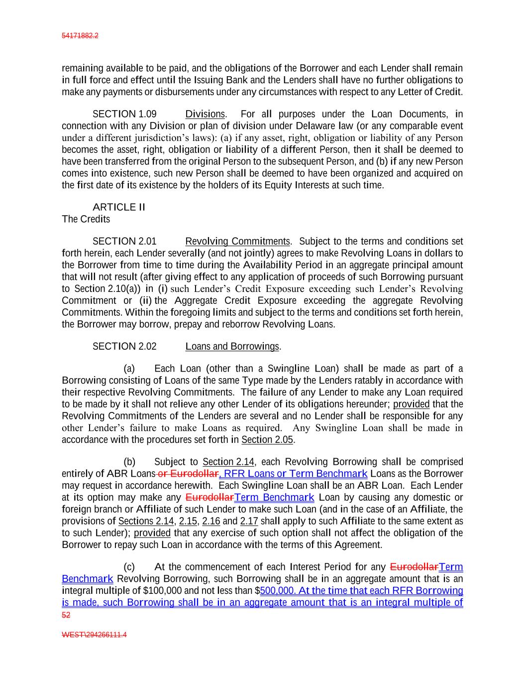 54171882.2 52 WEST\294266111.4 remaining available to be paid, and the obligations of the Borrower and each Lender shall remain in full force and effect until the Issuing Bank and the Lenders shall have no further obligations to make any payments or disbursements under any circumstances with respect to any Letter of Credit. SECTION 1.09 Divisions. For all purposes under the Loan Documents, in connection with any Division or plan of division under Delaware law (or any comparable event under a different jurisdiction’s laws): (a) if any asset, right, obligation or liability of any Person becomes the asset, right, obligation or liability of a different Person, then it shall be deemed to have been transferred from the original Person to the subsequent Person, and (b) if any new Person comes into existence, such new Person shall be deemed to have been organized and acquired on the first date of its existence by the holders of its Equity Interests at such time. ARTICLE II The Credits SECTION 2.01 Revolving Commitments. Subject to the terms and conditions set forth herein, each Lender severally (and not jointly) agrees to make Revolving Loans in dollars to the Borrower from time to time during the Availability Period in an aggregate principal amount that will not result (after giving effect to any application of proceeds of such Borrowing pursuant to Section 2.10(a)) in (i) such Lender’s Credit Exposure exceeding such Lender’s Revolving Commitment or (ii) the Aggregate Credit Exposure exceeding the aggregate Revolving Commitments. Within the foregoing limits and subject to the terms and conditions set forth herein, the Borrower may borrow, prepay and reborrow Revolving Loans. SECTION 2.02 Loans and Borrowings. (a) Each Loan (other than a Swingline Loan) shall be made as part of a Borrowing consisting of Loans of the same Type made by the Lenders ratably in accordance with their respective Revolving Commitments. The failure of any Lender to make any Loan required to be made by it shall not relieve any other Lender of its obligations hereunder; provided that the Revolving Commitments of the Lenders are several and no Lender shall be responsible for any other Lender’s failure to make Loans as required. Any Swingline Loan shall be made in accordance with the procedures set forth in Section 2.05. (b) Subject to Section 2.14, each Revolving Borrowing shall be comprised entirely of ABR Loans or Eurodollar, RFR Loans or Term Benchmark Loans as the Borrower may request in accordance herewith. Each Swingline Loan shall be an ABR Loan. Each Lender at its option may make any EurodollarTerm Benchmark Loan by causing any domestic or foreign branch or Affiliate of such Lender to make such Loan (and in the case of an Affiliate, the provisions of Sections 2.14, 2.15, 2.16 and 2.17 shall apply to such Affiliate to the same extent as to such Lender); provided that any exercise of such option shall not affect the obligation of the Borrower to repay such Loan in accordance with the terms of this Agreement. (c) At the commencement of each Interest Period for any EurodollarTerm Benchmark Revolving Borrowing, such Borrowing shall be in an aggregate amount that is an integral multiple of $100,000 and not less than $500,000. At the time that each RFR Borrowing is made, such Borrowing shall be in an aggregate amount that is an integral multiple of