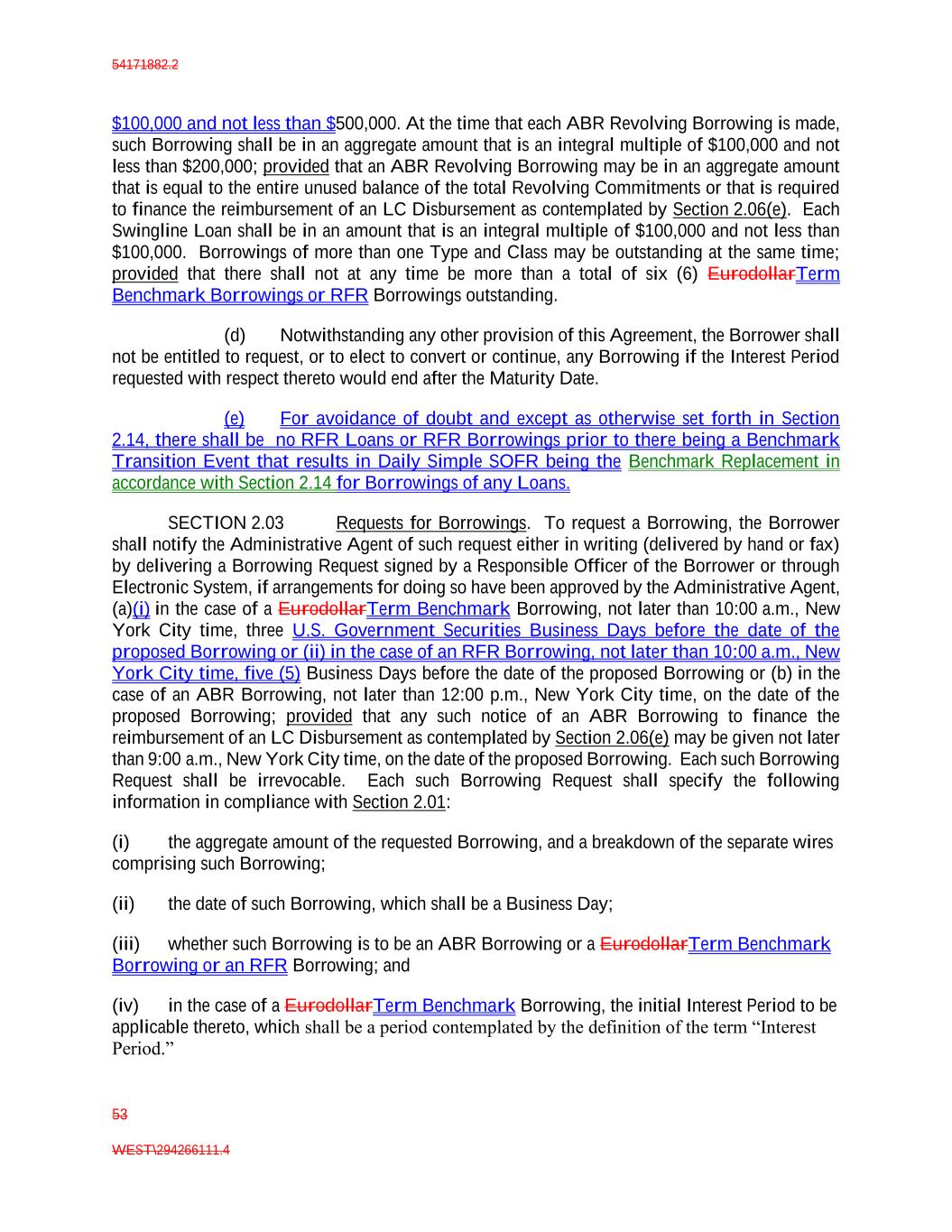 54171882.2 53 WEST\294266111.4 $100,000 and not less than $500,000. At the time that each ABR Revolving Borrowing is made, such Borrowing shall be in an aggregate amount that is an integral multiple of $100,000 and not less than $200,000; provided that an ABR Revolving Borrowing may be in an aggregate amount that is equal to the entire unused balance of the total Revolving Commitments or that is required to finance the reimbursement of an LC Disbursement as contemplated by Section 2.06(e). Each Swingline Loan shall be in an amount that is an integral multiple of $100,000 and not less than $100,000. Borrowings of more than one Type and Class may be outstanding at the same time; provided that there shall not at any time be more than a total of six (6) EurodollarTerm Benchmark Borrowings or RFR Borrowings outstanding. (d) Notwithstanding any other provision of this Agreement, the Borrower shall not be entitled to request, or to elect to convert or continue, any Borrowing if the Interest Period requested with respect thereto would end after the Maturity Date. (e) For avoidance of doubt and except as otherwise set forth in Section 2.14, there shall be no RFR Loans or RFR Borrowings prior to there being a Benchmark Transition Event that results in Daily Simple SOFR being the Benchmark Replacement in accordance with Section 2.14 for Borrowings of any Loans. SECTION 2.03 Requests for Borrowings. To request a Borrowing, the Borrower shall notify the Administrative Agent of such request either in writing (delivered by hand or fax) by delivering a Borrowing Request signed by a Responsible Officer of the Borrower or through Electronic System, if arrangements for doing so have been approved by the Administrative Agent, (a)(i) in the case of a EurodollarTerm Benchmark Borrowing, not later than 10:00 a.m., New York City time, three U.S. Government Securities Business Days before the date of the proposed Borrowing or (ii) in the case of an RFR Borrowing, not later than 10:00 a.m., New York City time, five (5) Business Days before the date of the proposed Borrowing or (b) in the case of an ABR Borrowing, not later than 12:00 p.m., New York City time, on the date of the proposed Borrowing; provided that any such notice of an ABR Borrowing to finance the reimbursement of an LC Disbursement as contemplated by Section 2.06(e) may be given not later than 9:00 a.m., New York City time, on the date of the proposed Borrowing. Each such Borrowing Request shall be irrevocable. Each such Borrowing Request shall specify the following information in compliance with Section 2.01: (i) the aggregate amount of the requested Borrowing, and a breakdown of the separate wires comprising such Borrowing; (ii) the date of such Borrowing, which shall be a Business Day; (iii) whether such Borrowing is to be an ABR Borrowing or a EurodollarTerm Benchmark Borrowing or an RFR Borrowing; and (iv) in the case of a EurodollarTerm Benchmark Borrowing, the initial Interest Period to be applicable thereto, which shall be a period contemplated by the definition of the term “Interest Period.”