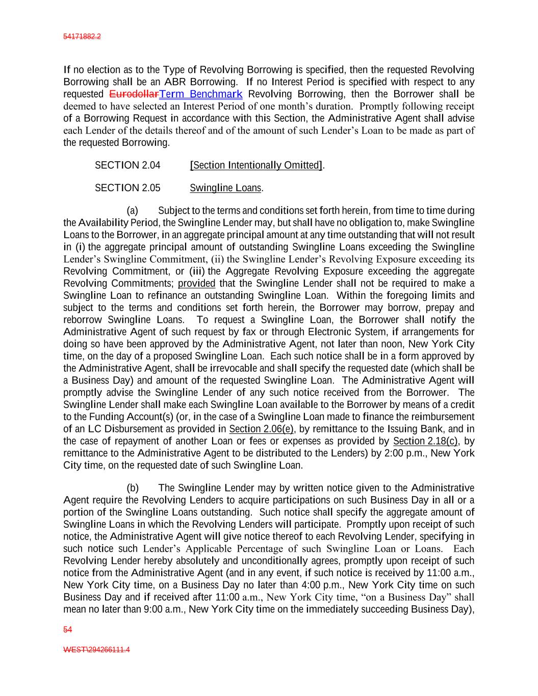 54171882.2 54 WEST\294266111.4 If no election as to the Type of Revolving Borrowing is specified, then the requested Revolving Borrowing shall be an ABR Borrowing. If no Interest Period is specified with respect to any requested EurodollarTerm Benchmark Revolving Borrowing, then the Borrower shall be deemed to have selected an Interest Period of one month’s duration. Promptly following receipt of a Borrowing Request in accordance with this Section, the Administrative Agent shall advise each Lender of the details thereof and of the amount of such Lender’s Loan to be made as part of the requested Borrowing. SECTION 2.04 [Section Intentionally Omitted]. SECTION 2.05 Swingline Loans. (a) Subject to the terms and conditions set forth herein, from time to time during the Availability Period, the Swingline Lender may, but shall have no obligation to, make Swingline Loans to the Borrower, in an aggregate principal amount at any time outstanding that will not result in (i) the aggregate principal amount of outstanding Swingline Loans exceeding the Swingline Lender’s Swingline Commitment, (ii) the Swingline Lender’s Revolving Exposure exceeding its Revolving Commitment, or (iii) the Aggregate Revolving Exposure exceeding the aggregate Revolving Commitments; provided that the Swingline Lender shall not be required to make a Swingline Loan to refinance an outstanding Swingline Loan. Within the foregoing limits and subject to the terms and conditions set forth herein, the Borrower may borrow, prepay and reborrow Swingline Loans. To request a Swingline Loan, the Borrower shall notify the Administrative Agent of such request by fax or through Electronic System, if arrangements for doing so have been approved by the Administrative Agent, not later than noon, New York City time, on the day of a proposed Swingline Loan. Each such notice shall be in a form approved by the Administrative Agent, shall be irrevocable and shall specify the requested date (which shall be a Business Day) and amount of the requested Swingline Loan. The Administrative Agent will promptly advise the Swingline Lender of any such notice received from the Borrower. The Swingline Lender shall make each Swingline Loan available to the Borrower by means of a credit to the Funding Account(s) (or, in the case of a Swingline Loan made to finance the reimbursement of an LC Disbursement as provided in Section 2.06(e), by remittance to the Issuing Bank, and in the case of repayment of another Loan or fees or expenses as provided by Section 2.18(c), by remittance to the Administrative Agent to be distributed to the Lenders) by 2:00 p.m., New York City time, on the requested date of such Swingline Loan. (b) The Swingline Lender may by written notice given to the Administrative Agent require the Revolving Lenders to acquire participations on such Business Day in all or a portion of the Swingline Loans outstanding. Such notice shall specify the aggregate amount of Swingline Loans in which the Revolving Lenders will participate. Promptly upon receipt of such notice, the Administrative Agent will give notice thereof to each Revolving Lender, specifying in such notice such Lender’s Applicable Percentage of such Swingline Loan or Loans. Each Revolving Lender hereby absolutely and unconditionally agrees, promptly upon receipt of such notice from the Administrative Agent (and in any event, if such notice is received by 11:00 a.m., New York City time, on a Business Day no later than 4:00 p.m., New York City time on such Business Day and if received after 11:00 a.m., New York City time, “on a Business Day” shall mean no later than 9:00 a.m., New York City time on the immediately succeeding Business Day),
