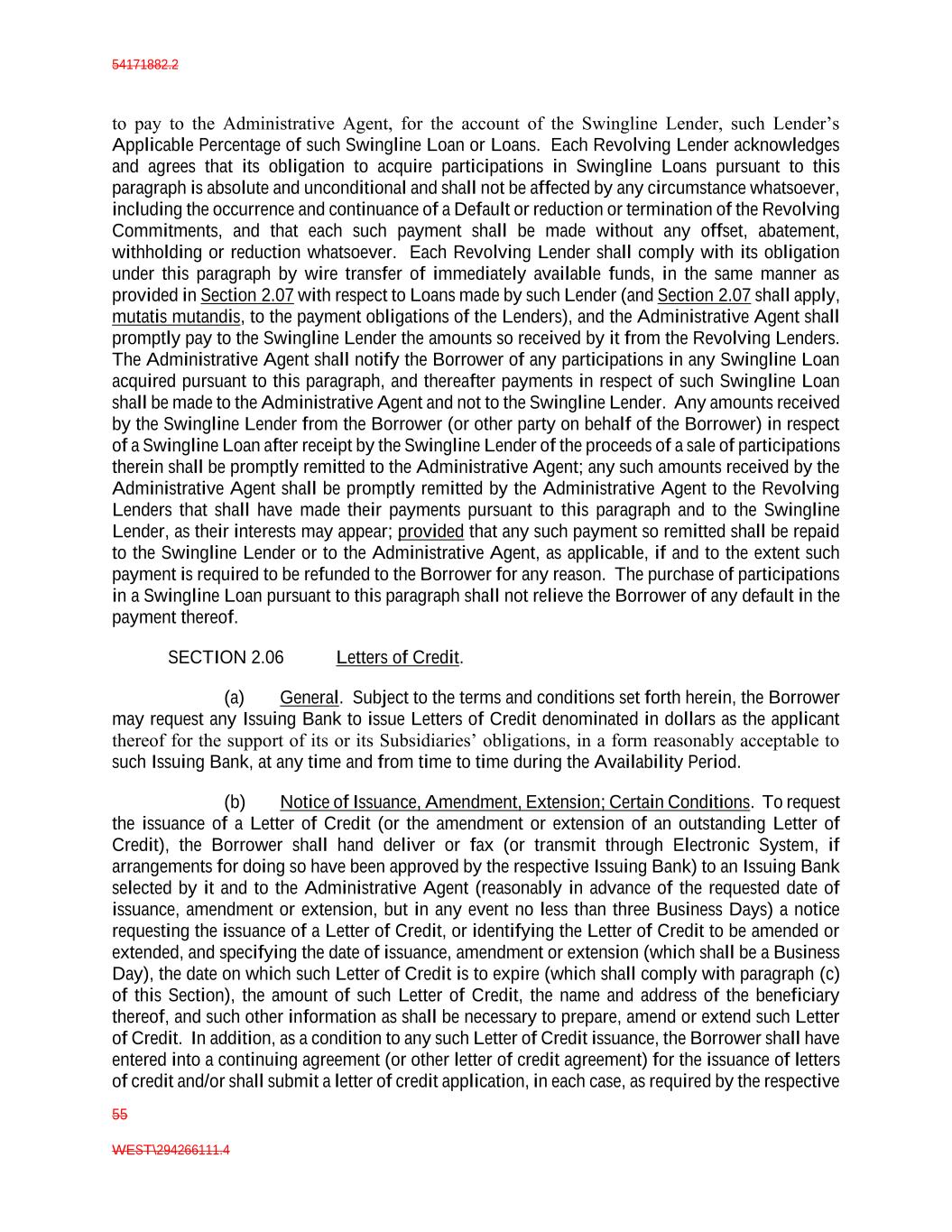 54171882.2 55 WEST\294266111.4 to pay to the Administrative Agent, for the account of the Swingline Lender, such Lender’s Applicable Percentage of such Swingline Loan or Loans. Each Revolving Lender acknowledges and agrees that its obligation to acquire participations in Swingline Loans pursuant to this paragraph is absolute and unconditional and shall not be affected by any circumstance whatsoever, including the occurrence and continuance of a Default or reduction or termination of the Revolving Commitments, and that each such payment shall be made without any offset, abatement, withholding or reduction whatsoever. Each Revolving Lender shall comply with its obligation under this paragraph by wire transfer of immediately available funds, in the same manner as provided in Section 2.07 with respect to Loans made by such Lender (and Section 2.07 shall apply, mutatis mutandis, to the payment obligations of the Lenders), and the Administrative Agent shall promptly pay to the Swingline Lender the amounts so received by it from the Revolving Lenders. The Administrative Agent shall notify the Borrower of any participations in any Swingline Loan acquired pursuant to this paragraph, and thereafter payments in respect of such Swingline Loan shall be made to the Administrative Agent and not to the Swingline Lender. Any amounts received by the Swingline Lender from the Borrower (or other party on behalf of the Borrower) in respect of a Swingline Loan after receipt by the Swingline Lender of the proceeds of a sale of participations therein shall be promptly remitted to the Administrative Agent; any such amounts received by the Administrative Agent shall be promptly remitted by the Administrative Agent to the Revolving Lenders that shall have made their payments pursuant to this paragraph and to the Swingline Lender, as their interests may appear; provided that any such payment so remitted shall be repaid to the Swingline Lender or to the Administrative Agent, as applicable, if and to the extent such payment is required to be refunded to the Borrower for any reason. The purchase of participations in a Swingline Loan pursuant to this paragraph shall not relieve the Borrower of any default in the payment thereof. SECTION 2.06 Letters of Credit. (a) General. Subject to the terms and conditions set forth herein, the Borrower may request any Issuing Bank to issue Letters of Credit denominated in dollars as the applicant thereof for the support of its or its Subsidiaries’ obligations, in a form reasonably acceptable to such Issuing Bank, at any time and from time to time during the Availability Period. (b) Notice of Issuance, Amendment, Extension; Certain Conditions. To request the issuance of a Letter of Credit (or the amendment or extension of an outstanding Letter of Credit), the Borrower shall hand deliver or fax (or transmit through Electronic System, if arrangements for doing so have been approved by the respective Issuing Bank) to an Issuing Bank selected by it and to the Administrative Agent (reasonably in advance of the requested date of issuance, amendment or extension, but in any event no less than three Business Days) a notice requesting the issuance of a Letter of Credit, or identifying the Letter of Credit to be amended or extended, and specifying the date of issuance, amendment or extension (which shall be a Business Day), the date on which such Letter of Credit is to expire (which shall comply with paragraph (c) of this Section), the amount of such Letter of Credit, the name and address of the beneficiary thereof, and such other information as shall be necessary to prepare, amend or extend such Letter of Credit. In addition, as a condition to any such Letter of Credit issuance, the Borrower shall have entered into a continuing agreement (or other letter of credit agreement) for the issuance of letters of credit and/or shall submit a letter of credit application, in each case, as required by the respective