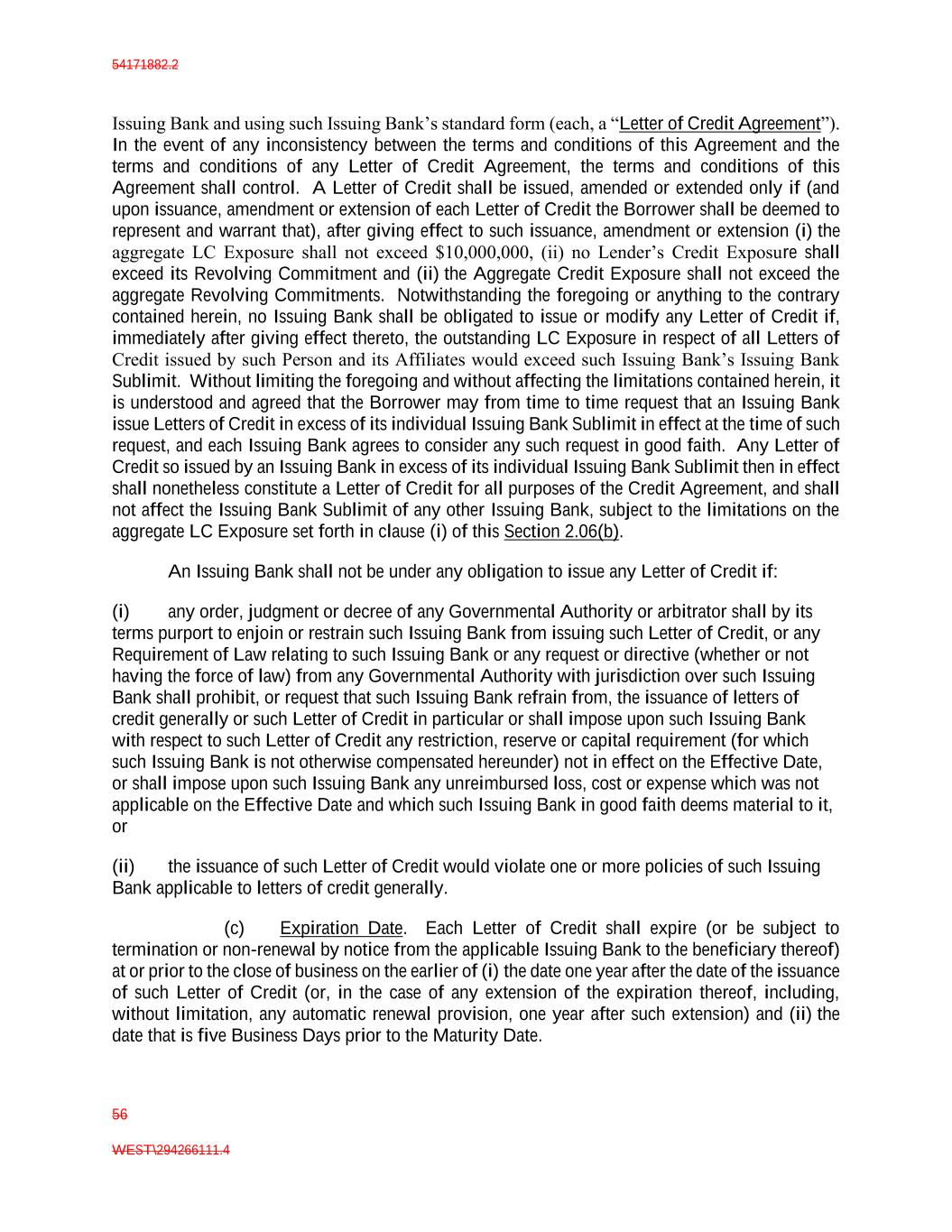 54171882.2 56 WEST\294266111.4 Issuing Bank and using such Issuing Bank’s standard form (each, a “Letter of Credit Agreement”). In the event of any inconsistency between the terms and conditions of this Agreement and the terms and conditions of any Letter of Credit Agreement, the terms and conditions of this Agreement shall control. A Letter of Credit shall be issued, amended or extended only if (and upon issuance, amendment or extension of each Letter of Credit the Borrower shall be deemed to represent and warrant that), after giving effect to such issuance, amendment or extension (i) the aggregate LC Exposure shall not exceed $10,000,000, (ii) no Lender’s Credit Exposure shall exceed its Revolving Commitment and (ii) the Aggregate Credit Exposure shall not exceed the aggregate Revolving Commitments. Notwithstanding the foregoing or anything to the contrary contained herein, no Issuing Bank shall be obligated to issue or modify any Letter of Credit if, immediately after giving effect thereto, the outstanding LC Exposure in respect of all Letters of Credit issued by such Person and its Affiliates would exceed such Issuing Bank’s Issuing Bank Sublimit. Without limiting the foregoing and without affecting the limitations contained herein, it is understood and agreed that the Borrower may from time to time request that an Issuing Bank issue Letters of Credit in excess of its individual Issuing Bank Sublimit in effect at the time of such request, and each Issuing Bank agrees to consider any such request in good faith. Any Letter of Credit so issued by an Issuing Bank in excess of its individual Issuing Bank Sublimit then in effect shall nonetheless constitute a Letter of Credit for all purposes of the Credit Agreement, and shall not affect the Issuing Bank Sublimit of any other Issuing Bank, subject to the limitations on the aggregate LC Exposure set forth in clause (i) of this Section 2.06(b). An Issuing Bank shall not be under any obligation to issue any Letter of Credit if: (i) any order, judgment or decree of any Governmental Authority or arbitrator shall by its terms purport to enjoin or restrain such Issuing Bank from issuing such Letter of Credit, or any Requirement of Law relating to such Issuing Bank or any request or directive (whether or not having the force of law) from any Governmental Authority with jurisdiction over such Issuing Bank shall prohibit, or request that such Issuing Bank refrain from, the issuance of letters of credit generally or such Letter of Credit in particular or shall impose upon such Issuing Bank with respect to such Letter of Credit any restriction, reserve or capital requirement (for which such Issuing Bank is not otherwise compensated hereunder) not in effect on the Effective Date, or shall impose upon such Issuing Bank any unreimbursed loss, cost or expense which was not applicable on the Effective Date and which such Issuing Bank in good faith deems material to it, or (ii) the issuance of such Letter of Credit would violate one or more policies of such Issuing Bank applicable to letters of credit generally. (c) Expiration Date. Each Letter of Credit shall expire (or be subject to termination or non-renewal by notice from the applicable Issuing Bank to the beneficiary thereof) at or prior to the close of business on the earlier of (i) the date one year after the date of the issuance of such Letter of Credit (or, in the case of any extension of the expiration thereof, including, without limitation, any automatic renewal provision, one year after such extension) and (ii) the date that is five Business Days prior to the Maturity Date.