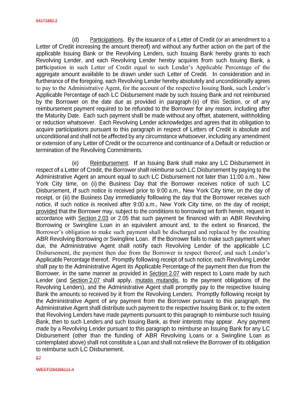 54171882.2 57 WEST\294266111.4 (d) Participations. By the issuance of a Letter of Credit (or an amendment to a Letter of Credit increasing the amount thereof) and without any further action on the part of the applicable Issuing Bank or the Revolving Lenders, such Issuing Bank hereby grants to each Revolving Lender, and each Revolving Lender hereby acquires from such Issuing Bank, a participation in such Letter of Credit equal to such Lender’s Applicable Percentage of the aggregate amount available to be drawn under such Letter of Credit. In consideration and in furtherance of the foregoing, each Revolving Lender hereby absolutely and unconditionally agrees to pay to the Administrative Agent, for the account of the respective Issuing Bank, such Lender’s Applicable Percentage of each LC Disbursement made by such Issuing Bank and not reimbursed by the Borrower on the date due as provided in paragraph (e) of this Section, or of any reimbursement payment required to be refunded to the Borrower for any reason, including after the Maturity Date. Each such payment shall be made without any offset, abatement, withholding or reduction whatsoever. Each Revolving Lender acknowledges and agrees that its obligation to acquire participations pursuant to this paragraph in respect of Letters of Credit is absolute and unconditional and shall not be affected by any circumstance whatsoever, including any amendment or extension of any Letter of Credit or the occurrence and continuance of a Default or reduction or termination of the Revolving Commitments. (e) Reimbursement. If an Issuing Bank shall make any LC Disbursement in respect of a Letter of Credit, the Borrower shall reimburse such LC Disbursement by paying to the Administrative Agent an amount equal to such LC Disbursement not later than 11:00 a.m., New York City time, on (i) the Business Day that the Borrower receives notice of such LC Disbursement, if such notice is received prior to 9:00 a.m., New York City time, on the day of receipt, or (ii) the Business Day immediately following the day that the Borrower receives such notice, if such notice is received after 9:00 a.m., New York City time, on the day of receipt; provided that the Borrower may, subject to the conditions to borrowing set forth herein, request in accordance with Section 2.03 or 2.05 that such payment be financed with an ABR Revolving Borrowing or Swingline Loan in an equivalent amount and, to the extent so financed, the Borrower’s obligation to make such payment shall be discharged and replaced by the resulting ABR Revolving Borrowing or Swingline Loan. If the Borrower fails to make such payment when due, the Administrative Agent shall notify each Revolving Lender of the applicable LC Disbursement, the payment then due from the Borrower in respect thereof, and such Lender’s Applicable Percentage thereof. Promptly following receipt of such notice, each Revolving Lender shall pay to the Administrative Agent its Applicable Percentage of the payment then due from the Borrower, in the same manner as provided in Section 2.07 with respect to Loans made by such Lender (and Section 2.07 shall apply, mutatis mutandis, to the payment obligations of the Revolving Lenders), and the Administrative Agent shall promptly pay to the respective Issuing Bank the amounts so received by it from the Revolving Lenders. Promptly following receipt by the Administrative Agent of any payment from the Borrower pursuant to this paragraph, the Administrative Agent shall distribute such payment to the respective Issuing Bank or, to the extent that Revolving Lenders have made payments pursuant to this paragraph to reimburse such Issuing Bank, then to such Lenders and such Issuing Bank, as their interests may appear. Any payment made by a Revolving Lender pursuant to this paragraph to reimburse an Issuing Bank for any LC Disbursement (other than the funding of ABR Revolving Loans or a Swingline Loan as contemplated above) shall not constitute a Loan and shall not relieve the Borrower of its obligation to reimburse such LC Disbursement.