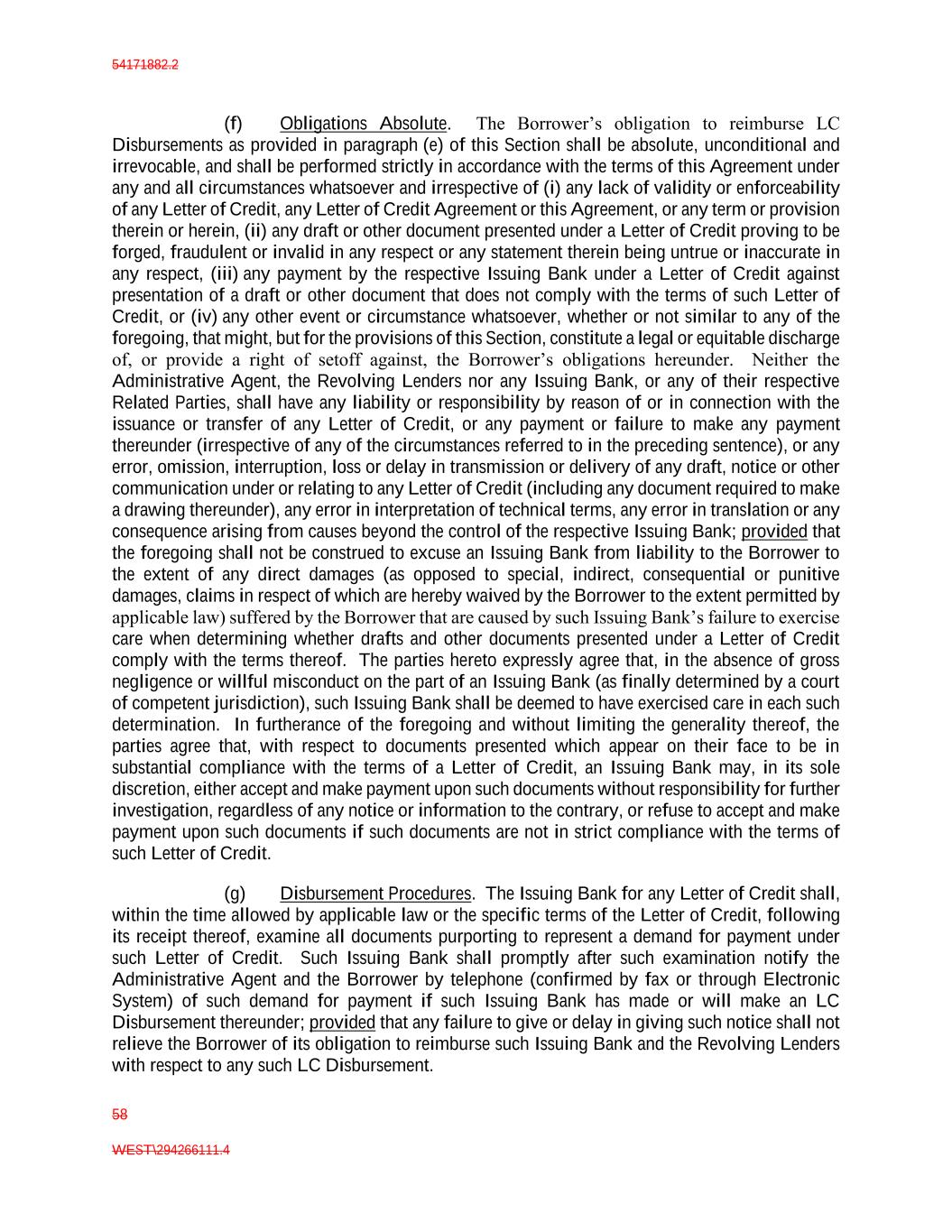 54171882.2 58 WEST\294266111.4 (f) Obligations Absolute. The Borrower’s obligation to reimburse LC Disbursements as provided in paragraph (e) of this Section shall be absolute, unconditional and irrevocable, and shall be performed strictly in accordance with the terms of this Agreement under any and all circumstances whatsoever and irrespective of (i) any lack of validity or enforceability of any Letter of Credit, any Letter of Credit Agreement or this Agreement, or any term or provision therein or herein, (ii) any draft or other document presented under a Letter of Credit proving to be forged, fraudulent or invalid in any respect or any statement therein being untrue or inaccurate in any respect, (iii) any payment by the respective Issuing Bank under a Letter of Credit against presentation of a draft or other document that does not comply with the terms of such Letter of Credit, or (iv) any other event or circumstance whatsoever, whether or not similar to any of the foregoing, that might, but for the provisions of this Section, constitute a legal or equitable discharge of, or provide a right of setoff against, the Borrower’s obligations hereunder. Neither the Administrative Agent, the Revolving Lenders nor any Issuing Bank, or any of their respective Related Parties, shall have any liability or responsibility by reason of or in connection with the issuance or transfer of any Letter of Credit, or any payment or failure to make any payment thereunder (irrespective of any of the circumstances referred to in the preceding sentence), or any error, omission, interruption, loss or delay in transmission or delivery of any draft, notice or other communication under or relating to any Letter of Credit (including any document required to make a drawing thereunder), any error in interpretation of technical terms, any error in translation or any consequence arising from causes beyond the control of the respective Issuing Bank; provided that the foregoing shall not be construed to excuse an Issuing Bank from liability to the Borrower to the extent of any direct damages (as opposed to special, indirect, consequential or punitive damages, claims in respect of which are hereby waived by the Borrower to the extent permitted by applicable law) suffered by the Borrower that are caused by such Issuing Bank’s failure to exercise care when determining whether drafts and other documents presented under a Letter of Credit comply with the terms thereof. The parties hereto expressly agree that, in the absence of gross negligence or willful misconduct on the part of an Issuing Bank (as finally determined by a court of competent jurisdiction), such Issuing Bank shall be deemed to have exercised care in each such determination. In furtherance of the foregoing and without limiting the generality thereof, the parties agree that, with respect to documents presented which appear on their face to be in substantial compliance with the terms of a Letter of Credit, an Issuing Bank may, in its sole discretion, either accept and make payment upon such documents without responsibility for further investigation, regardless of any notice or information to the contrary, or refuse to accept and make payment upon such documents if such documents are not in strict compliance with the terms of such Letter of Credit. (g) Disbursement Procedures. The Issuing Bank for any Letter of Credit shall, within the time allowed by applicable law or the specific terms of the Letter of Credit, following its receipt thereof, examine all documents purporting to represent a demand for payment under such Letter of Credit. Such Issuing Bank shall promptly after such examination notify the Administrative Agent and the Borrower by telephone (confirmed by fax or through Electronic System) of such demand for payment if such Issuing Bank has made or will make an LC Disbursement thereunder; provided that any failure to give or delay in giving such notice shall not relieve the Borrower of its obligation to reimburse such Issuing Bank and the Revolving Lenders with respect to any such LC Disbursement.