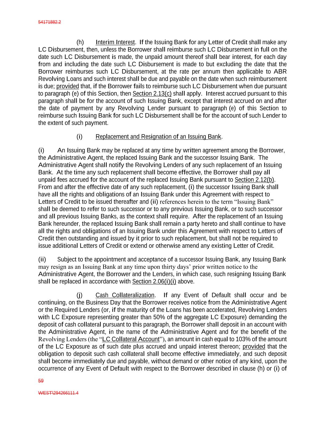 54171882.2 59 WEST\294266111.4 (h) Interim Interest. If the Issuing Bank for any Letter of Credit shall make any LC Disbursement, then, unless the Borrower shall reimburse such LC Disbursement in full on the date such LC Disbursement is made, the unpaid amount thereof shall bear interest, for each day from and including the date such LC Disbursement is made to but excluding the date that the Borrower reimburses such LC Disbursement, at the rate per annum then applicable to ABR Revolving Loans and such interest shall be due and payable on the date when such reimbursement is due; provided that, if the Borrower fails to reimburse such LC Disbursement when due pursuant to paragraph (e) of this Section, then Section 2.13(c) shall apply. Interest accrued pursuant to this paragraph shall be for the account of such Issuing Bank, except that interest accrued on and after the date of payment by any Revolving Lender pursuant to paragraph (e) of this Section to reimburse such Issuing Bank for such LC Disbursement shall be for the account of such Lender to the extent of such payment. (i) Replacement and Resignation of an Issuing Bank. (i) An Issuing Bank may be replaced at any time by written agreement among the Borrower, the Administrative Agent, the replaced Issuing Bank and the successor Issuing Bank. The Administrative Agent shall notify the Revolving Lenders of any such replacement of an Issuing Bank. At the time any such replacement shall become effective, the Borrower shall pay all unpaid fees accrued for the account of the replaced Issuing Bank pursuant to Section 2.12(b). From and after the effective date of any such replacement, (i) the successor Issuing Bank shall have all the rights and obligations of an Issuing Bank under this Agreement with respect to Letters of Credit to be issued thereafter and (ii) references herein to the term “Issuing Bank” shall be deemed to refer to such successor or to any previous Issuing Bank, or to such successor and all previous Issuing Banks, as the context shall require. After the replacement of an Issuing Bank hereunder, the replaced Issuing Bank shall remain a party hereto and shall continue to have all the rights and obligations of an Issuing Bank under this Agreement with respect to Letters of Credit then outstanding and issued by it prior to such replacement, but shall not be required to issue additional Letters of Credit or extend or otherwise amend any existing Letter of Credit. (ii) Subject to the appointment and acceptance of a successor Issuing Bank, any Issuing Bank may resign as an Issuing Bank at any time upon thirty days’ prior written notice to the Administrative Agent, the Borrower and the Lenders, in which case, such resigning Issuing Bank shall be replaced in accordance with Section 2.06(i)(i) above. (j) Cash Collateralization. If any Event of Default shall occur and be continuing, on the Business Day that the Borrower receives notice from the Administrative Agent or the Required Lenders (or, if the maturity of the Loans has been accelerated, Revolving Lenders with LC Exposure representing greater than 50% of the aggregate LC Exposure) demanding the deposit of cash collateral pursuant to this paragraph, the Borrower shall deposit in an account with the Administrative Agent, in the name of the Administrative Agent and for the benefit of the Revolving Lenders (the “LC Collateral Account”), an amount in cash equal to 103% of the amount of the LC Exposure as of such date plus accrued and unpaid interest thereon; provided that the obligation to deposit such cash collateral shall become effective immediately, and such deposit shall become immediately due and payable, without demand or other notice of any kind, upon the occurrence of any Event of Default with respect to the Borrower described in clause (h) or (i) of