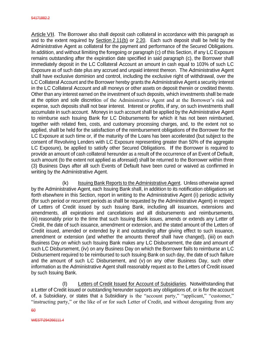 54171882.2 60 WEST\294266111.4 Article VII. The Borrower also shall deposit cash collateral in accordance with this paragraph as and to the extent required by Section 2.11(b) or 2.20. Each such deposit shall be held by the Administrative Agent as collateral for the payment and performance of the Secured Obligations. In addition, and without limiting the foregoing or paragraph (c) of this Section, if any LC Exposure remains outstanding after the expiration date specified in said paragraph (c), the Borrower shall immediately deposit in the LC Collateral Account an amount in cash equal to 103% of such LC Exposure as of such date plus any accrued and unpaid interest thereon. The Administrative Agent shall have exclusive dominion and control, including the exclusive right of withdrawal, over the LC Collateral Account and the Borrower hereby grants the Administrative Agent a security interest in the LC Collateral Account and all moneys or other assets on deposit therein or credited thereto. Other than any interest earned on the investment of such deposits, which investments shall be made at the option and sole discretion of the Administrative Agent and at the Borrower’s risk and expense, such deposits shall not bear interest. Interest or profits, if any, on such investments shall accumulate in such account. Moneys in such account shall be applied by the Administrative Agent to reimburse each Issuing Bank for LC Disbursements for which it has not been reimbursed, together with related fees, costs, and customary processing charges, and, to the extent not so applied, shall be held for the satisfaction of the reimbursement obligations of the Borrower for the LC Exposure at such time or, if the maturity of the Loans has been accelerated (but subject to the consent of Revolving Lenders with LC Exposure representing greater than 50% of the aggregate LC Exposure), be applied to satisfy other Secured Obligations. If the Borrower is required to provide an amount of cash collateral hereunder as a result of the occurrence of an Event of Default, such amount (to the extent not applied as aforesaid) shall be returned to the Borrower within three (3) Business Days after all such Events of Default have been cured or waived as confirmed in writing by the Administrative Agent. (k) Issuing Bank Reports to the Administrative Agent. Unless otherwise agreed by the Administrative Agent, each Issuing Bank shall, in addition to its notification obligations set forth elsewhere in this Section, report in writing to the Administrative Agent (i) periodic activity (for such period or recurrent periods as shall be requested by the Administrative Agent) in respect of Letters of Credit issued by such Issuing Bank, including all issuances, extensions and amendments, all expirations and cancelations and all disbursements and reimbursements, (ii) reasonably prior to the time that such Issuing Bank issues, amends or extends any Letter of Credit, the date of such issuance, amendment or extension, and the stated amount of the Letters of Credit issued, amended or extended by it and outstanding after giving effect to such issuance, amendment or extension (and whether the amounts thereof shall have changed), (iii) on each Business Day on which such Issuing Bank makes any LC Disbursement, the date and amount of such LC Disbursement, (iv) on any Business Day on which the Borrower fails to reimburse an LC Disbursement required to be reimbursed to such Issuing Bank on such day, the date of such failure and the amount of such LC Disbursement, and (v) on any other Business Day, such other information as the Administrative Agent shall reasonably request as to the Letters of Credit issued by such Issuing Bank. (l) Letters of Credit Issued for Account of Subsidiaries. Notwithstanding that a Letter of Credit issued or outstanding hereunder supports any obligations of, or is for the account of, a Subsidiary, or states that a Subsidiary is the “account party,” “applicant,” “customer,” “instructing party,” or the like of or for such Letter of Credit, and without derogating from any