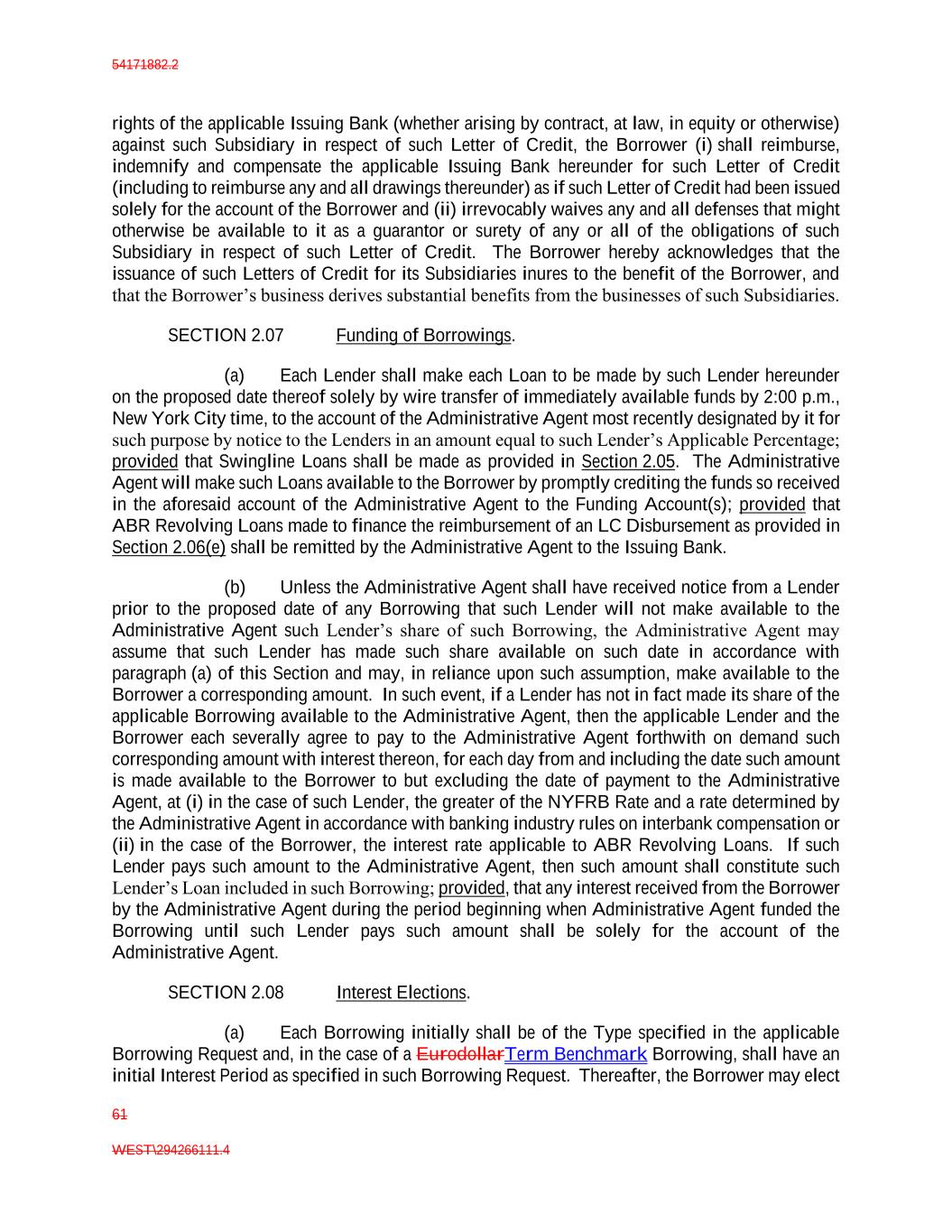 54171882.2 61 WEST\294266111.4 rights of the applicable Issuing Bank (whether arising by contract, at law, in equity or otherwise) against such Subsidiary in respect of such Letter of Credit, the Borrower (i) shall reimburse, indemnify and compensate the applicable Issuing Bank hereunder for such Letter of Credit (including to reimburse any and all drawings thereunder) as if such Letter of Credit had been issued solely for the account of the Borrower and (ii) irrevocably waives any and all defenses that might otherwise be available to it as a guarantor or surety of any or all of the obligations of such Subsidiary in respect of such Letter of Credit. The Borrower hereby acknowledges that the issuance of such Letters of Credit for its Subsidiaries inures to the benefit of the Borrower, and that the Borrower’s business derives substantial benefits from the businesses of such Subsidiaries. SECTION 2.07 Funding of Borrowings. (a) Each Lender shall make each Loan to be made by such Lender hereunder on the proposed date thereof solely by wire transfer of immediately available funds by 2:00 p.m., New York City time, to the account of the Administrative Agent most recently designated by it for such purpose by notice to the Lenders in an amount equal to such Lender’s Applicable Percentage; provided that Swingline Loans shall be made as provided in Section 2.05. The Administrative Agent will make such Loans available to the Borrower by promptly crediting the funds so received in the aforesaid account of the Administrative Agent to the Funding Account(s); provided that ABR Revolving Loans made to finance the reimbursement of an LC Disbursement as provided in Section 2.06(e) shall be remitted by the Administrative Agent to the Issuing Bank. (b) Unless the Administrative Agent shall have received notice from a Lender prior to the proposed date of any Borrowing that such Lender will not make available to the Administrative Agent such Lender’s share of such Borrowing, the Administrative Agent may assume that such Lender has made such share available on such date in accordance with paragraph (a) of this Section and may, in reliance upon such assumption, make available to the Borrower a corresponding amount. In such event, if a Lender has not in fact made its share of the applicable Borrowing available to the Administrative Agent, then the applicable Lender and the Borrower each severally agree to pay to the Administrative Agent forthwith on demand such corresponding amount with interest thereon, for each day from and including the date such amount is made available to the Borrower to but excluding the date of payment to the Administrative Agent, at (i) in the case of such Lender, the greater of the NYFRB Rate and a rate determined by the Administrative Agent in accordance with banking industry rules on interbank compensation or (ii) in the case of the Borrower, the interest rate applicable to ABR Revolving Loans. If such Lender pays such amount to the Administrative Agent, then such amount shall constitute such Lender’s Loan included in such Borrowing; provided, that any interest received from the Borrower by the Administrative Agent during the period beginning when Administrative Agent funded the Borrowing until such Lender pays such amount shall be solely for the account of the Administrative Agent. SECTION 2.08 Interest Elections. (a) Each Borrowing initially shall be of the Type specified in the applicable Borrowing Request and, in the case of a EurodollarTerm Benchmark Borrowing, shall have an initial Interest Period as specified in such Borrowing Request. Thereafter, the Borrower may elect