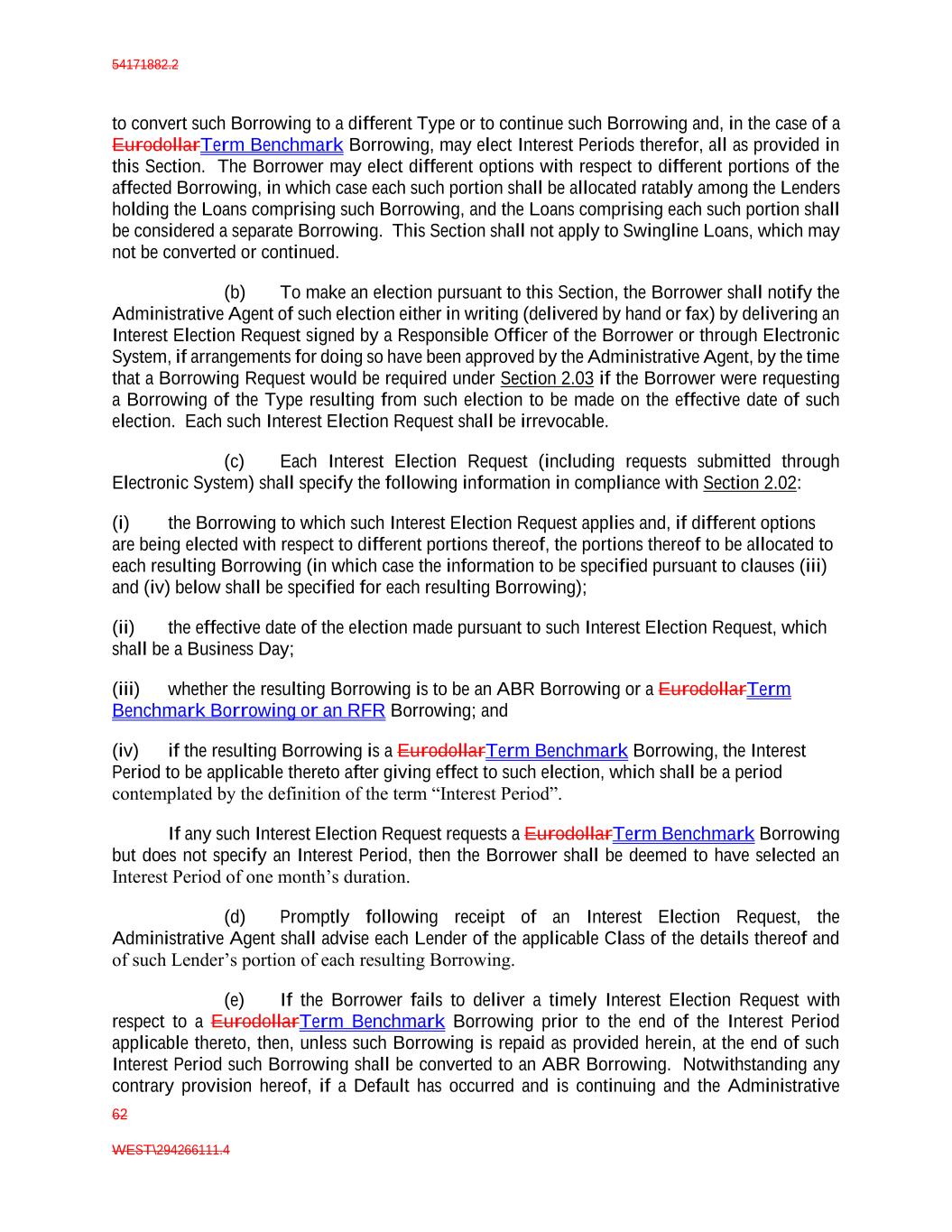 54171882.2 62 WEST\294266111.4 to convert such Borrowing to a different Type or to continue such Borrowing and, in the case of a EurodollarTerm Benchmark Borrowing, may elect Interest Periods therefor, all as provided in this Section. The Borrower may elect different options with respect to different portions of the affected Borrowing, in which case each such portion shall be allocated ratably among the Lenders holding the Loans comprising such Borrowing, and the Loans comprising each such portion shall be considered a separate Borrowing. This Section shall not apply to Swingline Loans, which may not be converted or continued. (b) To make an election pursuant to this Section, the Borrower shall notify the Administrative Agent of such election either in writing (delivered by hand or fax) by delivering an Interest Election Request signed by a Responsible Officer of the Borrower or through Electronic System, if arrangements for doing so have been approved by the Administrative Agent, by the time that a Borrowing Request would be required under Section 2.03 if the Borrower were requesting a Borrowing of the Type resulting from such election to be made on the effective date of such election. Each such Interest Election Request shall be irrevocable. (c) Each Interest Election Request (including requests submitted through Electronic System) shall specify the following information in compliance with Section 2.02: (i) the Borrowing to which such Interest Election Request applies and, if different options are being elected with respect to different portions thereof, the portions thereof to be allocated to each resulting Borrowing (in which case the information to be specified pursuant to clauses (iii) and (iv) below shall be specified for each resulting Borrowing); (ii) the effective date of the election made pursuant to such Interest Election Request, which shall be a Business Day; (iii) whether the resulting Borrowing is to be an ABR Borrowing or a EurodollarTerm Benchmark Borrowing or an RFR Borrowing; and (iv) if the resulting Borrowing is a EurodollarTerm Benchmark Borrowing, the Interest Period to be applicable thereto after giving effect to such election, which shall be a period contemplated by the definition of the term “Interest Period”. If any such Interest Election Request requests a EurodollarTerm Benchmark Borrowing but does not specify an Interest Period, then the Borrower shall be deemed to have selected an Interest Period of one month’s duration. (d) Promptly following receipt of an Interest Election Request, the Administrative Agent shall advise each Lender of the applicable Class of the details thereof and of such Lender’s portion of each resulting Borrowing. (e) If the Borrower fails to deliver a timely Interest Election Request with respect to a EurodollarTerm Benchmark Borrowing prior to the end of the Interest Period applicable thereto, then, unless such Borrowing is repaid as provided herein, at the end of such Interest Period such Borrowing shall be converted to an ABR Borrowing. Notwithstanding any contrary provision hereof, if a Default has occurred and is continuing and the Administrative