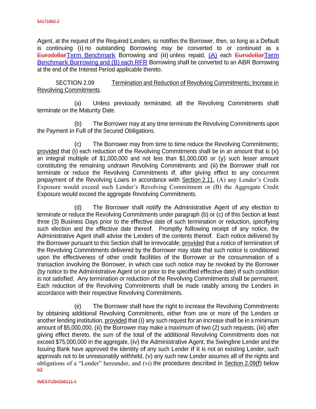 54171882.2 63 WEST\294266111.4 Agent, at the request of the Required Lenders, so notifies the Borrower, then, so long as a Default is continuing (i) no outstanding Borrowing may be converted to or continued as a EurodollarTerm Benchmark Borrowing and (ii) unless repaid, (A) each EurodollarTerm Benchmark Borrowing and (B) each RFR Borrowing shall be converted to an ABR Borrowing at the end of the Interest Period applicable thereto. SECTION 2.09 Termination and Reduction of Revolving Commitments; Increase in Revolving Commitments. (a) Unless previously terminated, all the Revolving Commitments shall terminate on the Maturity Date. (b) The Borrower may at any time terminate the Revolving Commitments upon the Payment in Full of the Secured Obligations. (c) The Borrower may from time to time reduce the Revolving Commitments; provided that (i) each reduction of the Revolving Commitments shall be in an amount that is (x) an integral multiple of $1,000,000 and not less than $1,000,000 or (y) such lesser amount constituting the remaining undrawn Revolving Commitments and (ii) the Borrower shall not terminate or reduce the Revolving Commitments if, after giving effect to any concurrent prepayment of the Revolving Loans in accordance with Section 2.11, (A) any Lender’s Credit Exposure would exceed such Lender’s Revolving Commitment or (B) the Aggregate Credit Exposure would exceed the aggregate Revolving Commitments. (d) The Borrower shall notify the Administrative Agent of any election to terminate or reduce the Revolving Commitments under paragraph (b) or (c) of this Section at least three (3) Business Days prior to the effective date of such termination or reduction, specifying such election and the effective date thereof. Promptly following receipt of any notice, the Administrative Agent shall advise the Lenders of the contents thereof. Each notice delivered by the Borrower pursuant to this Section shall be irrevocable; provided that a notice of termination of the Revolving Commitments delivered by the Borrower may state that such notice is conditioned upon the effectiveness of other credit facilities of the Borrower or the consummation of a transaction involving the Borrower, in which case such notice may be revoked by the Borrower (by notice to the Administrative Agent on or prior to the specified effective date) if such condition is not satisfied. Any termination or reduction of the Revolving Commitments shall be permanent. Each reduction of the Revolving Commitments shall be made ratably among the Lenders in accordance with their respective Revolving Commitments. (e) The Borrower shall have the right to increase the Revolving Commitments by obtaining additional Revolving Commitments, either from one or more of the Lenders or another lending institution, provided that (i) any such request for an increase shall be in a minimum amount of $5,000,000, (ii) the Borrower may make a maximum of two (2) such requests, (iii) after giving effect thereto, the sum of the total of the additional Revolving Commitments does not exceed $75,000,000 in the aggregate, (iv) the Administrative Agent, the Swingline Lender and the Issuing Bank have approved the identity of any such Lender if it is not an existing Lender, such approvals not to be unreasonably withheld, (v) any such new Lender assumes all of the rights and obligations of a “Lender” hereunder, and (vi) the procedures described in Section 2.09(f) below
