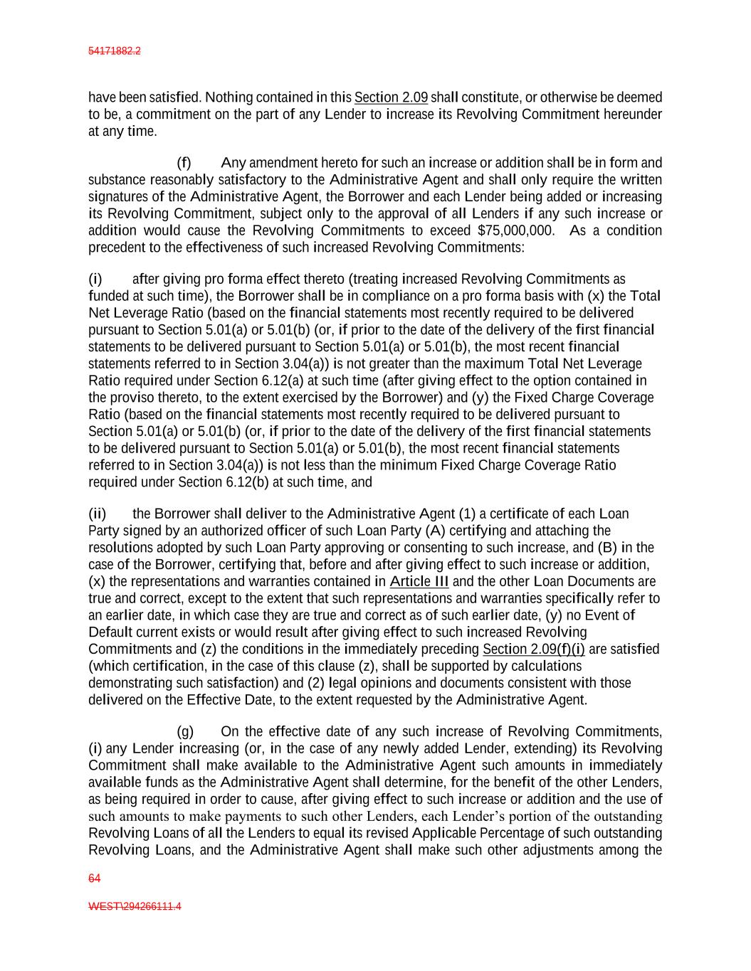 54171882.2 64 WEST\294266111.4 have been satisfied. Nothing contained in this Section 2.09 shall constitute, or otherwise be deemed to be, a commitment on the part of any Lender to increase its Revolving Commitment hereunder at any time. (f) Any amendment hereto for such an increase or addition shall be in form and substance reasonably satisfactory to the Administrative Agent and shall only require the written signatures of the Administrative Agent, the Borrower and each Lender being added or increasing its Revolving Commitment, subject only to the approval of all Lenders if any such increase or addition would cause the Revolving Commitments to exceed $75,000,000. As a condition precedent to the effectiveness of such increased Revolving Commitments: (i) after giving pro forma effect thereto (treating increased Revolving Commitments as funded at such time), the Borrower shall be in compliance on a pro forma basis with (x) the Total Net Leverage Ratio (based on the financial statements most recently required to be delivered pursuant to Section 5.01(a) or 5.01(b) (or, if prior to the date of the delivery of the first financial statements to be delivered pursuant to Section 5.01(a) or 5.01(b), the most recent financial statements referred to in Section 3.04(a)) is not greater than the maximum Total Net Leverage Ratio required under Section 6.12(a) at such time (after giving effect to the option contained in the proviso thereto, to the extent exercised by the Borrower) and (y) the Fixed Charge Coverage Ratio (based on the financial statements most recently required to be delivered pursuant to Section 5.01(a) or 5.01(b) (or, if prior to the date of the delivery of the first financial statements to be delivered pursuant to Section 5.01(a) or 5.01(b), the most recent financial statements referred to in Section 3.04(a)) is not less than the minimum Fixed Charge Coverage Ratio required under Section 6.12(b) at such time, and (ii) the Borrower shall deliver to the Administrative Agent (1) a certificate of each Loan Party signed by an authorized officer of such Loan Party (A) certifying and attaching the resolutions adopted by such Loan Party approving or consenting to such increase, and (B) in the case of the Borrower, certifying that, before and after giving effect to such increase or addition, (x) the representations and warranties contained in Article III and the other Loan Documents are true and correct, except to the extent that such representations and warranties specifically refer to an earlier date, in which case they are true and correct as of such earlier date, (y) no Event of Default current exists or would result after giving effect to such increased Revolving Commitments and (z) the conditions in the immediately preceding Section 2.09(f)(i) are satisfied (which certification, in the case of this clause (z), shall be supported by calculations demonstrating such satisfaction) and (2) legal opinions and documents consistent with those delivered on the Effective Date, to the extent requested by the Administrative Agent. (g) On the effective date of any such increase of Revolving Commitments, (i) any Lender increasing (or, in the case of any newly added Lender, extending) its Revolving Commitment shall make available to the Administrative Agent such amounts in immediately available funds as the Administrative Agent shall determine, for the benefit of the other Lenders, as being required in order to cause, after giving effect to such increase or addition and the use of such amounts to make payments to such other Lenders, each Lender’s portion of the outstanding Revolving Loans of all the Lenders to equal its revised Applicable Percentage of such outstanding Revolving Loans, and the Administrative Agent shall make such other adjustments among the