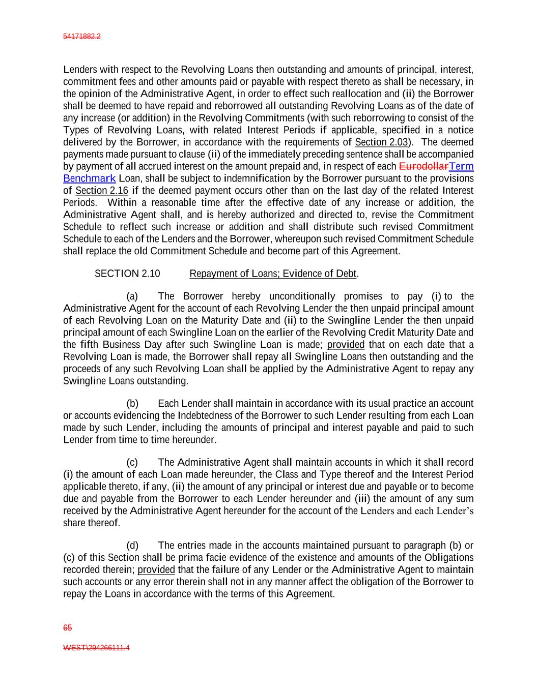 54171882.2 65 WEST\294266111.4 Lenders with respect to the Revolving Loans then outstanding and amounts of principal, interest, commitment fees and other amounts paid or payable with respect thereto as shall be necessary, in the opinion of the Administrative Agent, in order to effect such reallocation and (ii) the Borrower shall be deemed to have repaid and reborrowed all outstanding Revolving Loans as of the date of any increase (or addition) in the Revolving Commitments (with such reborrowing to consist of the Types of Revolving Loans, with related Interest Periods if applicable, specified in a notice delivered by the Borrower, in accordance with the requirements of Section 2.03). The deemed payments made pursuant to clause (ii) of the immediately preceding sentence shall be accompanied by payment of all accrued interest on the amount prepaid and, in respect of each EurodollarTerm Benchmark Loan, shall be subject to indemnification by the Borrower pursuant to the provisions of Section 2.16 if the deemed payment occurs other than on the last day of the related Interest Periods. Within a reasonable time after the effective date of any increase or addition, the Administrative Agent shall, and is hereby authorized and directed to, revise the Commitment Schedule to reflect such increase or addition and shall distribute such revised Commitment Schedule to each of the Lenders and the Borrower, whereupon such revised Commitment Schedule shall replace the old Commitment Schedule and become part of this Agreement. SECTION 2.10 Repayment of Loans; Evidence of Debt. (a) The Borrower hereby unconditionally promises to pay (i) to the Administrative Agent for the account of each Revolving Lender the then unpaid principal amount of each Revolving Loan on the Maturity Date and (ii) to the Swingline Lender the then unpaid principal amount of each Swingline Loan on the earlier of the Revolving Credit Maturity Date and the fifth Business Day after such Swingline Loan is made; provided that on each date that a Revolving Loan is made, the Borrower shall repay all Swingline Loans then outstanding and the proceeds of any such Revolving Loan shall be applied by the Administrative Agent to repay any Swingline Loans outstanding. (b) Each Lender shall maintain in accordance with its usual practice an account or accounts evidencing the Indebtedness of the Borrower to such Lender resulting from each Loan made by such Lender, including the amounts of principal and interest payable and paid to such Lender from time to time hereunder. (c) The Administrative Agent shall maintain accounts in which it shall record (i) the amount of each Loan made hereunder, the Class and Type thereof and the Interest Period applicable thereto, if any, (ii) the amount of any principal or interest due and payable or to become due and payable from the Borrower to each Lender hereunder and (iii) the amount of any sum received by the Administrative Agent hereunder for the account of the Lenders and each Lender’s share thereof. (d) The entries made in the accounts maintained pursuant to paragraph (b) or (c) of this Section shall be prima facie evidence of the existence and amounts of the Obligations recorded therein; provided that the failure of any Lender or the Administrative Agent to maintain such accounts or any error therein shall not in any manner affect the obligation of the Borrower to repay the Loans in accordance with the terms of this Agreement.