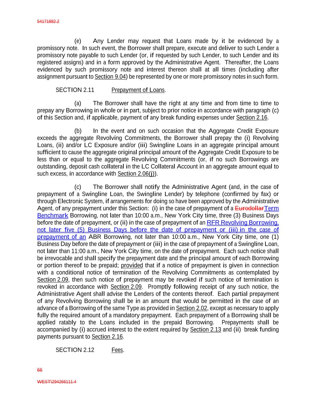 54171882.2 66 WEST\294266111.4 (e) Any Lender may request that Loans made by it be evidenced by a promissory note. In such event, the Borrower shall prepare, execute and deliver to such Lender a promissory note payable to such Lender (or, if requested by such Lender, to such Lender and its registered assigns) and in a form approved by the Administrative Agent. Thereafter, the Loans evidenced by such promissory note and interest thereon shall at all times (including after assignment pursuant to Section 9.04) be represented by one or more promissory notes in such form. SECTION 2.11 Prepayment of Loans. (a) The Borrower shall have the right at any time and from time to time to prepay any Borrowing in whole or in part, subject to prior notice in accordance with paragraph (c) of this Section and, if applicable, payment of any break funding expenses under Section 2.16. (b) In the event and on such occasion that the Aggregate Credit Exposure exceeds the aggregate Revolving Commitments, the Borrower shall prepay the (i) Revolving Loans, (ii) and/or LC Exposure and/or (iii) Swingline Loans in an aggregate principal amount sufficient to cause the aggregate original principal amount of the Aggregate Credit Exposure to be less than or equal to the aggregate Revolving Commitments (or, if no such Borrowings are outstanding, deposit cash collateral in the LC Collateral Account in an aggregate amount equal to such excess, in accordance with Section 2.06(j)). (c) The Borrower shall notify the Administrative Agent (and, in the case of prepayment of a Swingline Loan, the Swingline Lender) by telephone (confirmed by fax) or through Electronic System, if arrangements for doing so have been approved by the Administrative Agent, of any prepayment under this Section: (i) in the case of prepayment of a EurodollarTerm Benchmark Borrowing, not later than 10:00 a.m., New York City time, three (3) Business Days before the date of prepayment, or (ii) in the case of prepayment of an RFR Revolving Borrowing, not later five (5) Business Days before the date of prepayment or (iii) in the case of prepayment of an ABR Borrowing, not later than 10:00 a.m., New York City time, one (1) Business Day before the date of prepayment or (iii) in the case of prepayment of a Swingline Loan, not later than 11:00 a.m., New York City time, on the date of prepayment. Each such notice shall be irrevocable and shall specify the prepayment date and the principal amount of each Borrowing or portion thereof to be prepaid; provided that if a notice of prepayment is given in connection with a conditional notice of termination of the Revolving Commitments as contemplated by Section 2.09, then such notice of prepayment may be revoked if such notice of termination is revoked in accordance with Section 2.09. Promptly following receipt of any such notice, the Administrative Agent shall advise the Lenders of the contents thereof. Each partial prepayment of any Revolving Borrowing shall be in an amount that would be permitted in the case of an advance of a Borrowing of the same Type as provided in Section 2.02, except as necessary to apply fully the required amount of a mandatory prepayment. Each prepayment of a Borrowing shall be applied ratably to the Loans included in the prepaid Borrowing. Prepayments shall be accompanied by (i) accrued interest to the extent required by Section 2.13 and (ii) break funding payments pursuant to Section 2.16. SECTION 2.12 Fees.