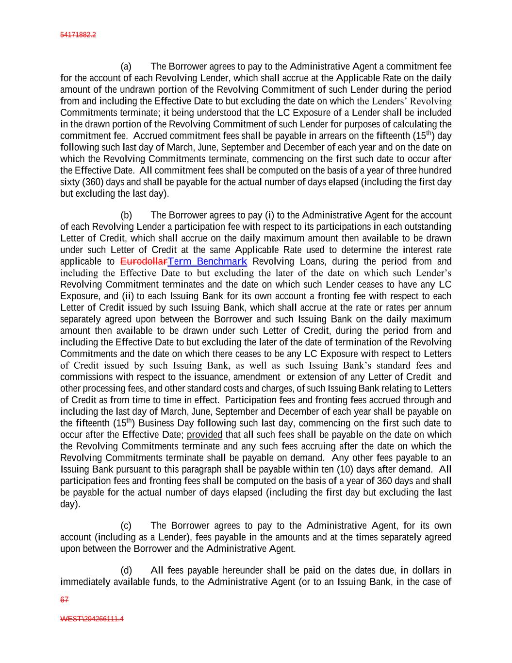54171882.2 67 WEST\294266111.4 (a) The Borrower agrees to pay to the Administrative Agent a commitment fee for the account of each Revolving Lender, which shall accrue at the Applicable Rate on the daily amount of the undrawn portion of the Revolving Commitment of such Lender during the period from and including the Effective Date to but excluding the date on which the Lenders’ Revolving Commitments terminate; it being understood that the LC Exposure of a Lender shall be included in the drawn portion of the Revolving Commitment of such Lender for purposes of calculating the commitment fee. Accrued commitment fees shall be payable in arrears on the fifteenth (15th) day following such last day of March, June, September and December of each year and on the date on which the Revolving Commitments terminate, commencing on the first such date to occur after the Effective Date. All commitment fees shall be computed on the basis of a year of three hundred sixty (360) days and shall be payable for the actual number of days elapsed (including the first day but excluding the last day). (b) The Borrower agrees to pay (i) to the Administrative Agent for the account of each Revolving Lender a participation fee with respect to its participations in each outstanding Letter of Credit, which shall accrue on the daily maximum amount then available to be drawn under such Letter of Credit at the same Applicable Rate used to determine the interest rate applicable to EurodollarTerm Benchmark Revolving Loans, during the period from and including the Effective Date to but excluding the later of the date on which such Lender’s Revolving Commitment terminates and the date on which such Lender ceases to have any LC Exposure, and (ii) to each Issuing Bank for its own account a fronting fee with respect to each Letter of Credit issued by such Issuing Bank, which shall accrue at the rate or rates per annum separately agreed upon between the Borrower and such Issuing Bank on the daily maximum amount then available to be drawn under such Letter of Credit, during the period from and including the Effective Date to but excluding the later of the date of termination of the Revolving Commitments and the date on which there ceases to be any LC Exposure with respect to Letters of Credit issued by such Issuing Bank, as well as such Issuing Bank’s standard fees and commissions with respect to the issuance, amendment or extension of any Letter of Credit and other processing fees, and other standard costs and charges, of such Issuing Bank relating to Letters of Credit as from time to time in effect. Participation fees and fronting fees accrued through and including the last day of March, June, September and December of each year shall be payable on the fifteenth (15th) Business Day following such last day, commencing on the first such date to occur after the Effective Date; provided that all such fees shall be payable on the date on which the Revolving Commitments terminate and any such fees accruing after the date on which the Revolving Commitments terminate shall be payable on demand. Any other fees payable to an Issuing Bank pursuant to this paragraph shall be payable within ten (10) days after demand. All participation fees and fronting fees shall be computed on the basis of a year of 360 days and shall be payable for the actual number of days elapsed (including the first day but excluding the last day). (c) The Borrower agrees to pay to the Administrative Agent, for its own account (including as a Lender), fees payable in the amounts and at the times separately agreed upon between the Borrower and the Administrative Agent. (d) All fees payable hereunder shall be paid on the dates due, in dollars in immediately available funds, to the Administrative Agent (or to an Issuing Bank, in the case of