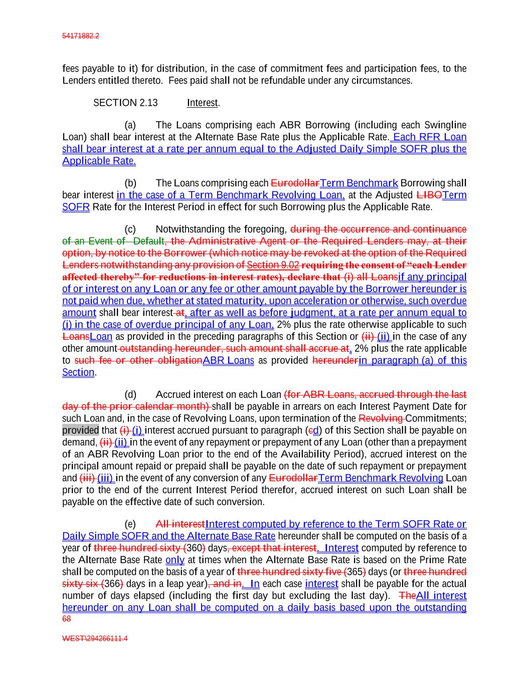54171882.2 68 WEST\294266111.4 fees payable to it) for distribution, in the case of commitment fees and participation fees, to the Lenders entitled thereto. Fees paid shall not be refundable under any circumstances. SECTION 2.13 Interest. (a) The Loans comprising each ABR Borrowing (including each Swingline Loan) shall bear interest at the Alternate Base Rate plus the Applicable Rate. Each RFR Loan shall bear interest at a rate per annum equal to the Adjusted Daily Simple SOFR plus the Applicable Rate. (b) The Loans comprising each EurodollarTerm Benchmark Borrowing shall bear interest in the case of a Term Benchmark Revolving Loan, at the Adjusted LIBOTerm SOFR Rate for the Interest Period in effect for such Borrowing plus the Applicable Rate. (c) Notwithstanding the foregoing, during the occurrence and continuance of an Event of Default, the Administrative Agent or the Required Lenders may, at their option, by notice to the Borrower (which notice may be revoked at the option of the Required Lenders notwithstanding any provision of Section 9.02 requiring the consent of “each Lender affected thereby” for reductions in interest rates), declare that (i) all Loansif any principal of or interest on any Loan or any fee or other amount payable by the Borrower hereunder is not paid when due, whether at stated maturity, upon acceleration or otherwise, such overdue amount shall bear interest at, after as well as before judgment, at a rate per annum equal to (i) in the case of overdue principal of any Loan, 2% plus the rate otherwise applicable to such LoansLoan as provided in the preceding paragraphs of this Section or (ii) (ii) in the case of any other amount outstanding hereunder, such amount shall accrue at, 2% plus the rate applicable to such fee or other obligationABR Loans as provided hereunderin paragraph (a) of this Section. (d) Accrued interest on each Loan (for ABR Loans, accrued through the last day of the prior calendar month) shall be payable in arrears on each Interest Payment Date for such Loan and, in the case of Revolving Loans, upon termination of the Revolving Commitments; provided that (i) (i) interest accrued pursuant to paragraph (cd) of this Section shall be payable on demand, (ii) (ii) in the event of any repayment or prepayment of any Loan (other than a prepayment of an ABR Revolving Loan prior to the end of the Availability Period), accrued interest on the principal amount repaid or prepaid shall be payable on the date of such repayment or prepayment and (iii) (iii) in the event of any conversion of any EurodollarTerm Benchmark Revolving Loan prior to the end of the current Interest Period therefor, accrued interest on such Loan shall be payable on the effective date of such conversion. (e) All interestInterest computed by reference to the Term SOFR Rate or Daily Simple SOFR and the Alternate Base Rate hereunder shall be computed on the basis of a year of three hundred sixty (360) days, except that interest. Interest computed by reference to the Alternate Base Rate only at times when the Alternate Base Rate is based on the Prime Rate shall be computed on the basis of a year of three hundred sixty five (365) days (or three hundred sixty six (366) days in a leap year), and in. In each case interest shall be payable for the actual number of days elapsed (including the first day but excluding the last day). TheAll interest hereunder on any Loan shall be computed on a daily basis based upon the outstanding