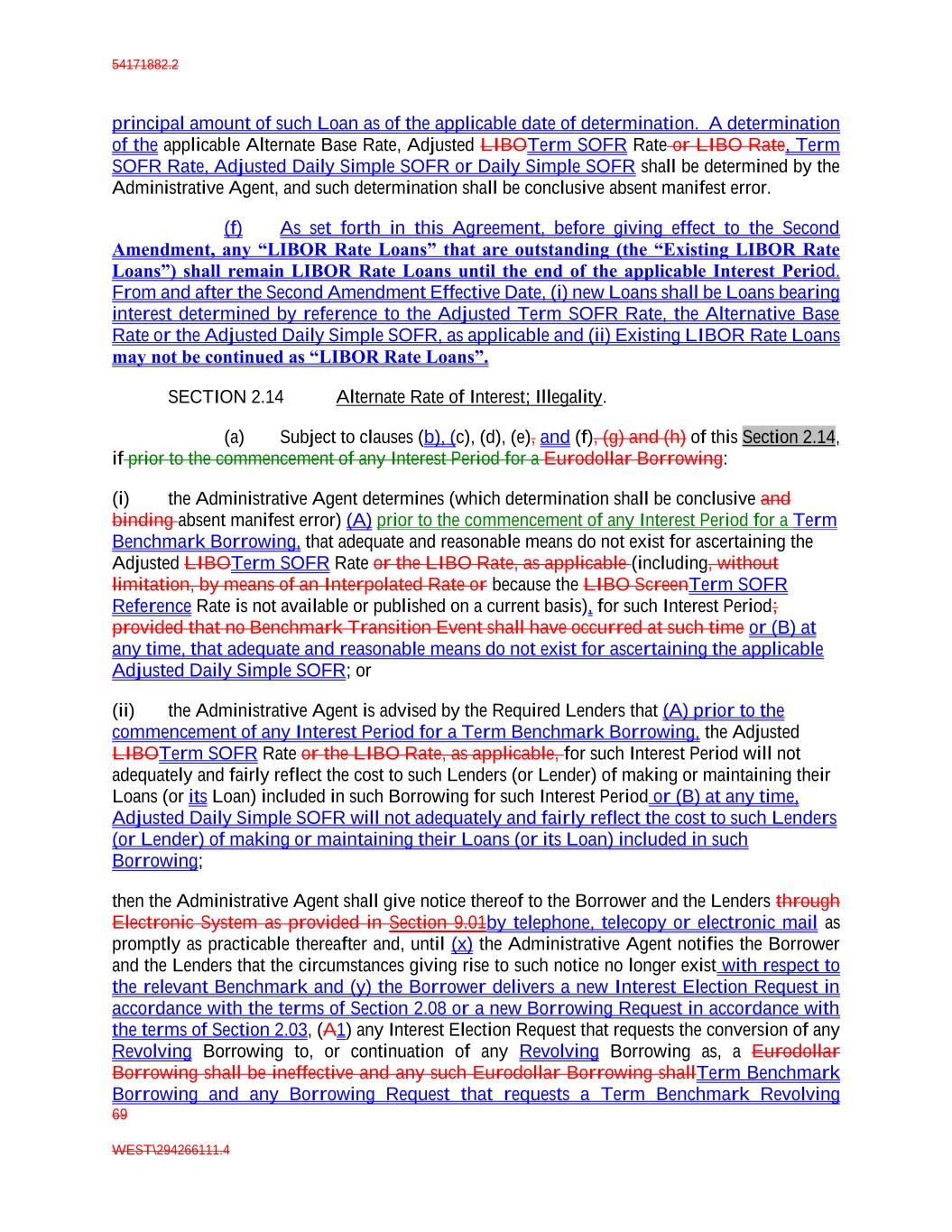 54171882.2 69 WEST\294266111.4 principal amount of such Loan as of the applicable date of determination. A determination of the applicable Alternate Base Rate, Adjusted LIBOTerm SOFR Rate or LIBO Rate, Term SOFR Rate, Adjusted Daily Simple SOFR or Daily Simple SOFR shall be determined by the Administrative Agent, and such determination shall be conclusive absent manifest error. (f) As set forth in this Agreement, before giving effect to the Second Amendment, any “LIBOR Rate Loans” that are outstanding (the “Existing LIBOR Rate Loans”) shall remain LIBOR Rate Loans until the end of the applicable Interest Period. From and after the Second Amendment Effective Date, (i) new Loans shall be Loans bearing interest determined by reference to the Adjusted Term SOFR Rate, the Alternative Base Rate or the Adjusted Daily Simple SOFR, as applicable and (ii) Existing LIBOR Rate Loans may not be continued as “LIBOR Rate Loans”. SECTION 2.14 Alternate Rate of Interest; Illegality. (a) Subject to clauses (b), (c), (d), (e), and (f), (g) and (h) of this Section 2.14, if prior to the commencement of any Interest Period for a Eurodollar Borrowing: (i) the Administrative Agent determines (which determination shall be conclusive and binding absent manifest error) (A) prior to the commencement of any Interest Period for a Term Benchmark Borrowing, that adequate and reasonable means do not exist for ascertaining the Adjusted LIBOTerm SOFR Rate or the LIBO Rate, as applicable (including, without limitation, by means of an Interpolated Rate or because the LIBO ScreenTerm SOFR Reference Rate is not available or published on a current basis), for such Interest Period; provided that no Benchmark Transition Event shall have occurred at such time or (B) at any time, that adequate and reasonable means do not exist for ascertaining the applicable Adjusted Daily Simple SOFR; or (ii) the Administrative Agent is advised by the Required Lenders that (A) prior to the commencement of any Interest Period for a Term Benchmark Borrowing, the Adjusted LIBOTerm SOFR Rate or the LIBO Rate, as applicable, for such Interest Period will not adequately and fairly reflect the cost to such Lenders (or Lender) of making or maintaining their Loans (or its Loan) included in such Borrowing for such Interest Period or (B) at any time, Adjusted Daily Simple SOFR will not adequately and fairly reflect the cost to such Lenders (or Lender) of making or maintaining their Loans (or its Loan) included in such Borrowing; then the Administrative Agent shall give notice thereof to the Borrower and the Lenders through Electronic System as provided in Section 9.01by telephone, telecopy or electronic mail as promptly as practicable thereafter and, until (x) the Administrative Agent notifies the Borrower and the Lenders that the circumstances giving rise to such notice no longer exist with respect to the relevant Benchmark and (y) the Borrower delivers a new Interest Election Request in accordance with the terms of Section 2.08 or a new Borrowing Request in accordance with the terms of Section 2.03, (A1) any Interest Election Request that requests the conversion of any Revolving Borrowing to, or continuation of any Revolving Borrowing as, a Eurodollar Borrowing shall be ineffective and any such Eurodollar Borrowing shallTerm Benchmark Borrowing and any Borrowing Request that requests a Term Benchmark Revolving