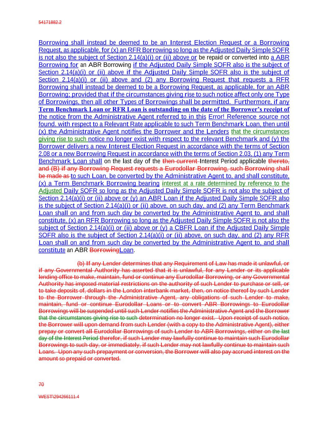 54171882.2 70 WEST\294266111.4 Borrowing shall instead be deemed to be an Interest Election Request or a Borrowing Request, as applicable, for (x) an RFR Borrowing so long as the Adjusted Daily Simple SOFR is not also the subject of Section 2.14(a)(i) or (ii) above or be repaid or converted into a ABR Borrowing for an ABR Borrowing if the Adjusted Daily Simple SOFR also is the subject of Section 2.14(a)(i) or (ii) above if the Adjusted Daily Simple SOFR also is the subject of Section 2.14(a)(i) or (ii) above and (2) any Borrowing Request that requests a RFR Borrowing shall instead be deemed to be a Borrowing Request, as applicable, for an ABR Borrowing; provided that if the circumstances giving rise to such notice affect only one Type of Borrowings, then all other Types of Borrowings shall be permitted. Furthermore, if any Term Benchmark Loan or RFR Loan is outstanding on the date of the Borrower’s receipt of the notice from the Administrative Agent referred to in this Error! Reference source not found. with respect to a Relevant Rate applicable to such Term Benchmark Loan, then until (x) the Administrative Agent notifies the Borrower and the Lenders that the circumstances giving rise to such notice no longer exist with respect to the relevant Benchmark and (y) the Borrower delivers a new Interest Election Request in accordance with the terms of Section 2.08 or a new Borrowing Request in accordance with the terms of Section 2.03, (1) any Term Benchmark Loan shall on the last day of the then current Interest Period applicable thereto, and (B) if any Borrowing Request requests a Eurodollar Borrowing, such Borrowing shall be made as to such Loan, be converted by the Administrative Agent to, and shall constitute, (x) a Term Benchmark Borrowing bearing interest at a rate determined by reference to the Adjusted Daily SOFR so long as the Adjusted Daily Simple SOFR is not also the subject of Section 2.14(a)(i) or (ii) above or (y) an ABR Loan if the Adjusted Daily Simple SOFR also is the subject of Section 2.14(a)(i) or (ii) above, on such day, and (2) any Term Benchmark Loan shall on and from such day be converted by the Administrative Agent to, and shall constitute, (x) an RFR Borrowing so long as the Adjusted Daily Simple SOFR is not also the subject of Section 2.14(a)(i) or (ii) above or (y) a CBFR Loan if the Adjusted Daily Simple SOFR also is the subject of Section 2.14(a)(i) or (ii) above, on such day, and (2) any RFR Loan shall on and from such day be converted by the Administrative Agent to, and shall constitute an ABR BorrowingLoan. (b) If any Lender determines that any Requirement of Law has made it unlawful, or if any Governmental Authority has asserted that it is unlawful, for any Lender or its applicable lending office to make, maintain, fund or continue any Eurodollar Borrowing, or any Governmental Authority has imposed material restrictions on the authority of such Lender to purchase or sell, or to take deposits of, dollars in the London interbank market, then, on notice thereof by such Lender to the Borrower through the Administrative Agent, any obligations of such Lender to make, maintain, fund or continue Eurodollar Loans or to convert ABR Borrowings to Eurodollar Borrowings will be suspended until such Lender notifies the Administrative Agent and the Borrower that the circumstances giving rise to such determination no longer exist. Upon receipt of such notice, the Borrower will upon demand from such Lender (with a copy to the Administrative Agent), either prepay or convert all Eurodollar Borrowings of such Lender to ABR Borrowings, either on the last day of the Interest Period therefor, if such Lender may lawfully continue to maintain such Eurodollar Borrowings to such day, or immediately, if such Lender may not lawfully continue to maintain such Loans. Upon any such prepayment or conversion, the Borrower will also pay accrued interest on the amount so prepaid or converted.