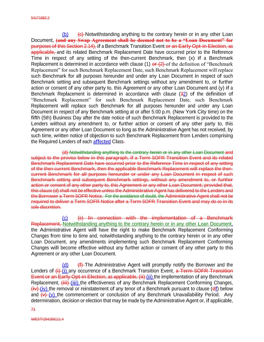 54171882.2 71 WEST\294266111.4 (b) (c) Notwithstanding anything to the contrary herein or in any other Loan Document, (and any Swap Agreement shall be deemed not to be a “Loan Document” for purposes of this Section 2.14), if a Benchmark Transition Event or an Early Opt-in Election, as applicable, and its related Benchmark Replacement Date have occurred prior to the Reference Time in respect of any setting of the then-current Benchmark, then (x) if a Benchmark Replacement is determined in accordance with clause (1) or (2) of the definition of “Benchmark Replacement” for such Benchmark Replacement Date, such Benchmark Replacement will replace such Benchmark for all purposes hereunder and under any Loan Document in respect of such Benchmark setting and subsequent Benchmark settings without any amendment to, or further action or consent of any other party to, this Agreement or any other Loan Document and (y) if a Benchmark Replacement is determined in accordance with clause (32) of the definition of “Benchmark Replacement” for such Benchmark Replacement Date, such Benchmark Replacement will replace such Benchmark for all purposes hereunder and under any Loan Document in respect of any Benchmark setting at or after 5:00 p.m. (New York City time) on the fifth (5th) Business Day after the date notice of such Benchmark Replacement is provided to the Lenders without any amendment to, or further action or consent of any other party to, this Agreement or any other Loan Document so long as the Administrative Agent has not received, by such time, written notice of objection to such Benchmark Replacement from Lenders comprising the Required Lenders of each affected Class. (d) Notwithstanding anything to the contrary herein or in any other Loan Document and subject to the proviso below in this paragraph, if a Term SOFR Transition Event and its related Benchmark Replacement Date have occurred prior to the Reference Time in respect of any setting of the then-current Benchmark, then the applicable Benchmark Replacement will replace the then- current Benchmark for all purposes hereunder or under any Loan Document in respect of such Benchmark setting and subsequent Benchmark settings, without any amendment to, or further action or consent of any other party to, this Agreement or any other Loan Document; provided that, this clause (d) shall not be effective unless the Administrative Agent has delivered to the Lenders and the Borrower a Term SOFR Notice. For the avoidance of doubt, the Administrative Agent shall not be required to deliver a Term SOFR Notice after a Term SOFR Transition Event and may do so in its sole discretion. (c) (e) In connection with the implementation of a Benchmark Replacement, Notwithstanding anything to the contrary herein or in any other Loan Document, the Administrative Agent will have the right to make Benchmark Replacement Conforming Changes from time to time and, notwithstanding anything to the contrary herein or in any other Loan Document, any amendments implementing such Benchmark Replacement Conforming Changes will become effective without any further action or consent of any other party to this Agreement or any other Loan Document. (d) (f) The Administrative Agent will promptly notify the Borrower and the Lenders of (i) (i) any occurrence of a Benchmark Transition Event, a Term SOFR Transition Event or an Early Opt-in Election, as applicable, (ii) (ii) the implementation of any Benchmark Replacement, (iii) (iii) the effectiveness of any Benchmark Replacement Conforming Changes, (iv) (iv) the removal or reinstatement of any tenor of a Benchmark pursuant to clause (df) below and (v) (v) the commencement or conclusion of any Benchmark Unavailability Period. Any determination, decision or election that may be made by the Administrative Agent or, if applicable,