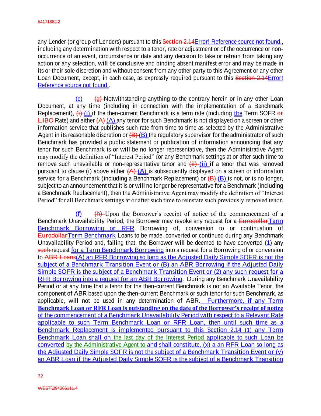 54171882.2 72 WEST\294266111.4 any Lender (or group of Lenders) pursuant to this Section 2.14Error! Reference source not found., including any determination with respect to a tenor, rate or adjustment or of the occurrence or non- occurrence of an event, circumstance or date and any decision to take or refrain from taking any action or any selection, will be conclusive and binding absent manifest error and may be made in its or their sole discretion and without consent from any other party to this Agreement or any other Loan Document, except, in each case, as expressly required pursuant to this Section 2.14Error! Reference source not found.. (e) (g) Notwithstanding anything to the contrary herein or in any other Loan Document, at any time (including in connection with the implementation of a Benchmark Replacement), (i) (i) if the then-current Benchmark is a term rate (including the Term SOFR or LIBO Rate) and either (A) (A) any tenor for such Benchmark is not displayed on a screen or other information service that publishes such rate from time to time as selected by the Administrative Agent in its reasonable discretion or (B) (B) the regulatory supervisor for the administrator of such Benchmark has provided a public statement or publication of information announcing that any tenor for such Benchmark is or will be no longer representative, then the Administrative Agent may modify the definition of “Interest Period” for any Benchmark settings at or after such time to remove such unavailable or non-representative tenor and (ii) (ii) if a tenor that was removed pursuant to clause (i) above either (A) (A) is subsequently displayed on a screen or information service for a Benchmark (including a Benchmark Replacement) or (B) (B) is not, or is no longer, subject to an announcement that it is or will no longer be representative for a Benchmark (including a Benchmark Replacement), then the Administrative Agent may modify the definition of “Interest Period” for all Benchmark settings at or after such time to reinstate such previously removed tenor. (f) (h) Upon the Borrower’s receipt of notice of the commencement of a Benchmark Unavailability Period, the Borrower may revoke any request for a EurodollarTerm Benchmark Borrowing or RFR Borrowing of, conversion to or continuation of EurodollarTerm Benchmark Loans to be made, converted or continued during any Benchmark Unavailability Period and, failing that, the Borrower will be deemed to have converted (1) any such request for a Term Benchmark Borrowing into a request for a Borrowing of or conversion to ABR Loans(A) an RFR Borrowing so long as the Adjusted Daily Simple SOFR is not the subject of a Benchmark Transition Event or (B) an ABR Borrowing if the Adjusted Daily Simple SOFR is the subject of a Benchmark Transition Event or (2) any such request for a RFR Borrowing into a request for an ABR Borrowing. During any Benchmark Unavailability Period or at any time that a tenor for the then-current Benchmark is not an Available Tenor, the component of ABR based upon the then-current Benchmark or such tenor for such Benchmark, as applicable, will not be used in any determination of ABR. Furthermore, if any Term Benchmark Loan or RFR Loan is outstanding on the date of the Borrower’s receipt of notice of the commencement of a Benchmark Unavailability Period with respect to a Relevant Rate applicable to such Term Benchmark Loan or RFR Loan, then until such time as a Benchmark Replacement is implemented pursuant to this Section 2.14 (1) any Term Benchmark Loan shall on the last day of the Interest Period applicable to such Loan be converted by the Administrative Agent to and shall constitute, (x) a an RFR Loan so long as the Adjusted Daily Simple SOFR is not the subject of a Benchmark Transition Event or (y) an ABR Loan if the Adjusted Daily Simple SOFR is the subject of a Benchmark Transition