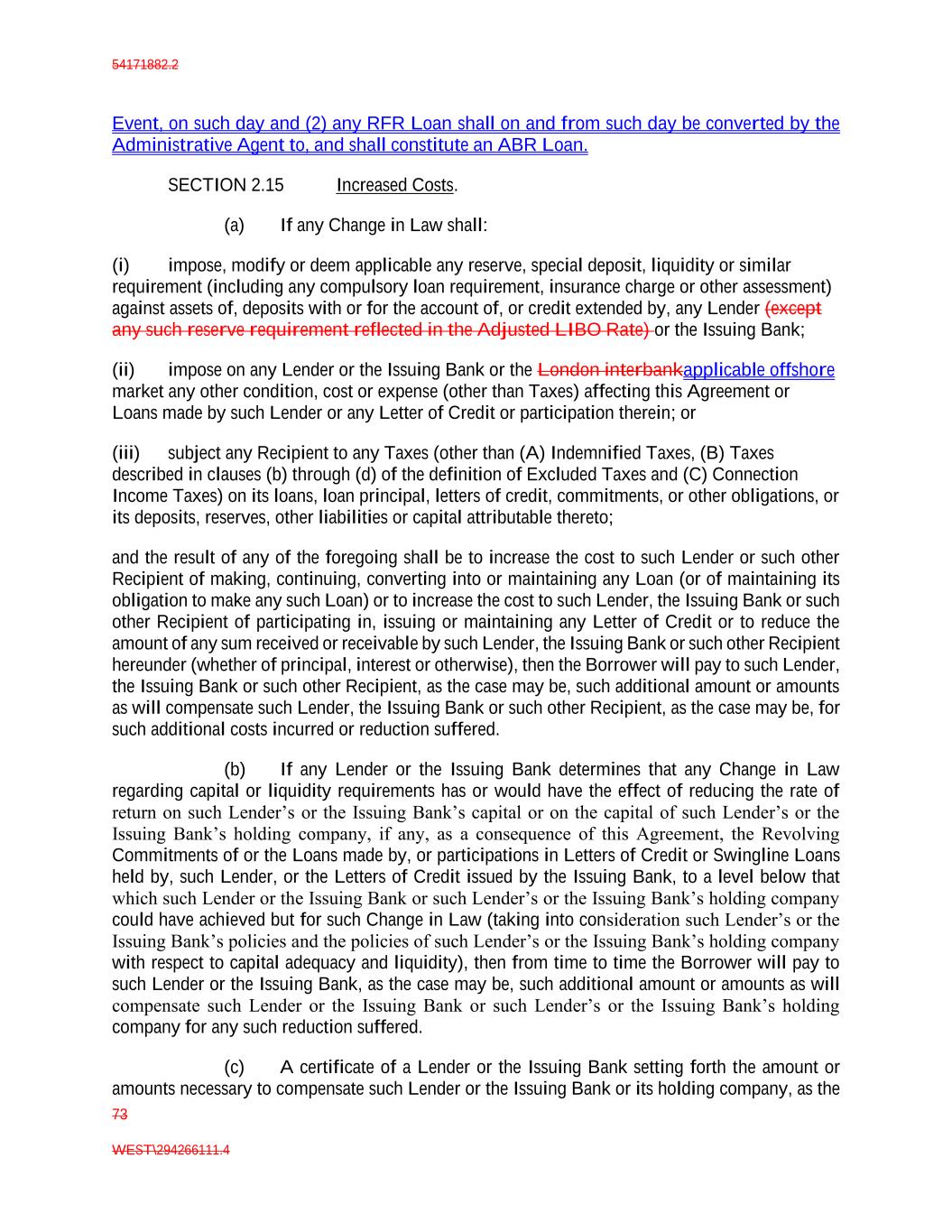 54171882.2 73 WEST\294266111.4 Event, on such day and (2) any RFR Loan shall on and from such day be converted by the Administrative Agent to, and shall constitute an ABR Loan. SECTION 2.15 Increased Costs. (a) If any Change in Law shall: (i) impose, modify or deem applicable any reserve, special deposit, liquidity or similar requirement (including any compulsory loan requirement, insurance charge or other assessment) against assets of, deposits with or for the account of, or credit extended by, any Lender (except any such reserve requirement reflected in the Adjusted LIBO Rate) or the Issuing Bank; (ii) impose on any Lender or the Issuing Bank or the London interbankapplicable offshore market any other condition, cost or expense (other than Taxes) affecting this Agreement or Loans made by such Lender or any Letter of Credit or participation therein; or (iii) subject any Recipient to any Taxes (other than (A) Indemnified Taxes, (B) Taxes described in clauses (b) through (d) of the definition of Excluded Taxes and (C) Connection Income Taxes) on its loans, loan principal, letters of credit, commitments, or other obligations, or its deposits, reserves, other liabilities or capital attributable thereto; and the result of any of the foregoing shall be to increase the cost to such Lender or such other Recipient of making, continuing, converting into or maintaining any Loan (or of maintaining its obligation to make any such Loan) or to increase the cost to such Lender, the Issuing Bank or such other Recipient of participating in, issuing or maintaining any Letter of Credit or to reduce the amount of any sum received or receivable by such Lender, the Issuing Bank or such other Recipient hereunder (whether of principal, interest or otherwise), then the Borrower will pay to such Lender, the Issuing Bank or such other Recipient, as the case may be, such additional amount or amounts as will compensate such Lender, the Issuing Bank or such other Recipient, as the case may be, for such additional costs incurred or reduction suffered. (b) If any Lender or the Issuing Bank determines that any Change in Law regarding capital or liquidity requirements has or would have the effect of reducing the rate of return on such Lender’s or the Issuing Bank’s capital or on the capital of such Lender’s or the Issuing Bank’s holding company, if any, as a consequence of this Agreement, the Revolving Commitments of or the Loans made by, or participations in Letters of Credit or Swingline Loans held by, such Lender, or the Letters of Credit issued by the Issuing Bank, to a level below that which such Lender or the Issuing Bank or such Lender’s or the Issuing Bank’s holding company could have achieved but for such Change in Law (taking into consideration such Lender’s or the Issuing Bank’s policies and the policies of such Lender’s or the Issuing Bank’s holding company with respect to capital adequacy and liquidity), then from time to time the Borrower will pay to such Lender or the Issuing Bank, as the case may be, such additional amount or amounts as will compensate such Lender or the Issuing Bank or such Lender’s or the Issuing Bank’s holding company for any such reduction suffered. (c) A certificate of a Lender or the Issuing Bank setting forth the amount or amounts necessary to compensate such Lender or the Issuing Bank or its holding company, as the