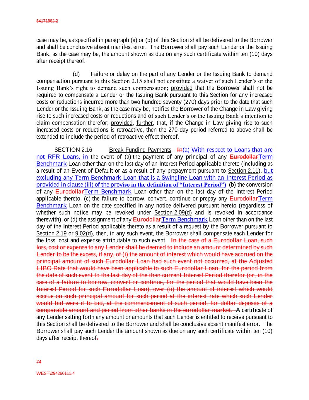 54171882.2 74 WEST\294266111.4 case may be, as specified in paragraph (a) or (b) of this Section shall be delivered to the Borrower and shall be conclusive absent manifest error. The Borrower shall pay such Lender or the Issuing Bank, as the case may be, the amount shown as due on any such certificate within ten (10) days after receipt thereof. (d) Failure or delay on the part of any Lender or the Issuing Bank to demand compensation pursuant to this Section 2.15 shall not constitute a waiver of such Lender’s or the Issuing Bank’s right to demand such compensation; provided that the Borrower shall not be required to compensate a Lender or the Issuing Bank pursuant to this Section for any increased costs or reductions incurred more than two hundred seventy (270) days prior to the date that such Lender or the Issuing Bank, as the case may be, notifies the Borrower of the Change in Law giving rise to such increased costs or reductions and of such Lender’s or the Issuing Bank’s intention to claim compensation therefor; provided, further, that, if the Change in Law giving rise to such increased costs or reductions is retroactive, then the 270-day period referred to above shall be extended to include the period of retroactive effect thereof. SECTION 2.16 Break Funding Payments. In(a) With respect to Loans that are not RFR Loans, in the event of (a) the payment of any principal of any EurodollarTerm Benchmark Loan other than on the last day of an Interest Period applicable thereto (including as a result of an Event of Default or as a result of any prepayment pursuant to Section 2.11), but excluding any Term Benchmark Loan that is a Swingline Loan with an Interest Period as provided in clause (iii) of the proviso in the definition of “Interest Period”) (b) the conversion of any EurodollarTerm Benchmark Loan other than on the last day of the Interest Period applicable thereto, (c) the failure to borrow, convert, continue or prepay any EurodollarTerm Benchmark Loan on the date specified in any notice delivered pursuant hereto (regardless of whether such notice may be revoked under Section 2.09(d) and is revoked in accordance therewith), or (d) the assignment of any EurodollarTerm Benchmark Loan other than on the last day of the Interest Period applicable thereto as a result of a request by the Borrower pursuant to Section 2.19 or 9.02(d), then, in any such event, the Borrower shall compensate each Lender for the loss, cost and expense attributable to such event. In the case of a Eurodollar Loan, such loss, cost or expense to any Lender shall be deemed to include an amount determined by such Lender to be the excess, if any, of (i) the amount of interest which would have accrued on the principal amount of such Eurodollar Loan had such event not occurred, at the Adjusted LIBO Rate that would have been applicable to such Eurodollar Loan, for the period from the date of such event to the last day of the then current Interest Period therefor (or, in the case of a failure to borrow, convert or continue, for the period that would have been the Interest Period for such Eurodollar Loan), over (ii) the amount of interest which would accrue on such principal amount for such period at the interest rate which such Lender would bid were it to bid, at the commencement of such period, for dollar deposits of a comparable amount and period from other banks in the eurodollar market. A certificate of any Lender setting forth any amount or amounts that such Lender is entitled to receive pursuant to this Section shall be delivered to the Borrower and shall be conclusive absent manifest error. The Borrower shall pay such Lender the amount shown as due on any such certificate within ten (10) days after receipt thereof.