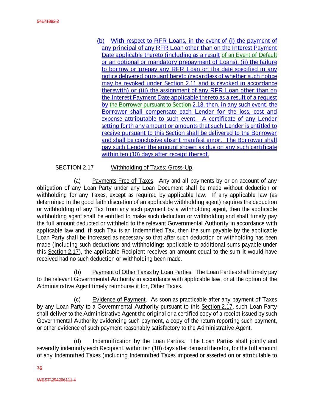 54171882.2 75 WEST\294266111.4 (b) With respect to RFR Loans, in the event of (i) the payment of any principal of any RFR Loan other than on the Interest Payment Date applicable thereto (including as a result of an Event of Default or an optional or mandatory prepayment of Loans), (ii) the failure to borrow or prepay any RFR Loan on the date specified in any notice delivered pursuant hereto (regardless of whether such notice may be revoked under Section 2.11 and is revoked in accordance therewith) or (iii) the assignment of any RFR Loan other than on the Interest Payment Date applicable thereto as a result of a request by the Borrower pursuant to Section 2.18, then, in any such event, the Borrower shall compensate each Lender for the loss, cost and expense attributable to such event. A certificate of any Lender setting forth any amount or amounts that such Lender is entitled to receive pursuant to this Section shall be delivered to the Borrower and shall be conclusive absent manifest error. The Borrower shall pay such Lender the amount shown as due on any such certificate within ten (10) days after receipt thereof. SECTION 2.17 Withholding of Taxes; Gross-Up. (a) Payments Free of Taxes. Any and all payments by or on account of any obligation of any Loan Party under any Loan Document shall be made without deduction or withholding for any Taxes, except as required by applicable law. If any applicable law (as determined in the good faith discretion of an applicable withholding agent) requires the deduction or withholding of any Tax from any such payment by a withholding agent, then the applicable withholding agent shall be entitled to make such deduction or withholding and shall timely pay the full amount deducted or withheld to the relevant Governmental Authority in accordance with applicable law and, if such Tax is an Indemnified Tax, then the sum payable by the applicable Loan Party shall be increased as necessary so that after such deduction or withholding has been made (including such deductions and withholdings applicable to additional sums payable under this Section 2.17), the applicable Recipient receives an amount equal to the sum it would have received had no such deduction or withholding been made. (b) Payment of Other Taxes by Loan Parties. The Loan Parties shall timely pay to the relevant Governmental Authority in accordance with applicable law, or at the option of the Administrative Agent timely reimburse it for, Other Taxes. (c) Evidence of Payment. As soon as practicable after any payment of Taxes by any Loan Party to a Governmental Authority pursuant to this Section 2.17, such Loan Party shall deliver to the Administrative Agent the original or a certified copy of a receipt issued by such Governmental Authority evidencing such payment, a copy of the return reporting such payment, or other evidence of such payment reasonably satisfactory to the Administrative Agent. (d) Indemnification by the Loan Parties. The Loan Parties shall jointly and severally indemnify each Recipient, within ten (10) days after demand therefor, for the full amount of any Indemnified Taxes (including Indemnified Taxes imposed or asserted on or attributable to