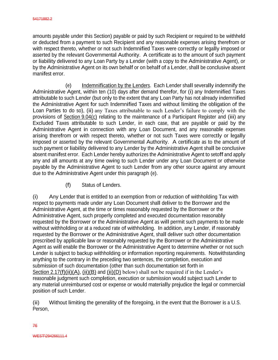 54171882.2 76 WEST\294266111.4 amounts payable under this Section) payable or paid by such Recipient or required to be withheld or deducted from a payment to such Recipient and any reasonable expenses arising therefrom or with respect thereto, whether or not such Indemnified Taxes were correctly or legally imposed or asserted by the relevant Governmental Authority. A certificate as to the amount of such payment or liability delivered to any Loan Party by a Lender (with a copy to the Administrative Agent), or by the Administrative Agent on its own behalf or on behalf of a Lender, shall be conclusive absent manifest error. (e) Indemnification by the Lenders. Each Lender shall severally indemnify the Administrative Agent, within ten (10) days after demand therefor, for (i) any Indemnified Taxes attributable to such Lender (but only to the extent that any Loan Party has not already indemnified the Administrative Agent for such Indemnified Taxes and without limiting the obligation of the Loan Parties to do so), (ii) any Taxes attributable to such Lender’s failure to comply with the provisions of Section 9.04(c) relating to the maintenance of a Participant Register and (iii) any Excluded Taxes attributable to such Lender, in each case, that are payable or paid by the Administrative Agent in connection with any Loan Document, and any reasonable expenses arising therefrom or with respect thereto, whether or not such Taxes were correctly or legally imposed or asserted by the relevant Governmental Authority. A certificate as to the amount of such payment or liability delivered to any Lender by the Administrative Agent shall be conclusive absent manifest error. Each Lender hereby authorizes the Administrative Agent to setoff and apply any and all amounts at any time owing to such Lender under any Loan Document or otherwise payable by the Administrative Agent to such Lender from any other source against any amount due to the Administrative Agent under this paragraph (e). (f) Status of Lenders. (i) Any Lender that is entitled to an exemption from or reduction of withholding Tax with respect to payments made under any Loan Document shall deliver to the Borrower and the Administrative Agent, at the time or times reasonably requested by the Borrower or the Administrative Agent, such properly completed and executed documentation reasonably requested by the Borrower or the Administrative Agent as will permit such payments to be made without withholding or at a reduced rate of withholding. In addition, any Lender, if reasonably requested by the Borrower or the Administrative Agent, shall deliver such other documentation prescribed by applicable law or reasonably requested by the Borrower or the Administrative Agent as will enable the Borrower or the Administrative Agent to determine whether or not such Lender is subject to backup withholding or information reporting requirements. Notwithstanding anything to the contrary in the preceding two sentences, the completion, execution and submission of such documentation (other than such documentation set forth in Section 2.17(f)(ii)(A), (ii)(B) and (ii)(D) below) shall not be required if in the Lender’s reasonable judgment such completion, execution or submission would subject such Lender to any material unreimbursed cost or expense or would materially prejudice the legal or commercial position of such Lender. (ii) Without limiting the generality of the foregoing, in the event that the Borrower is a U.S. Person,
