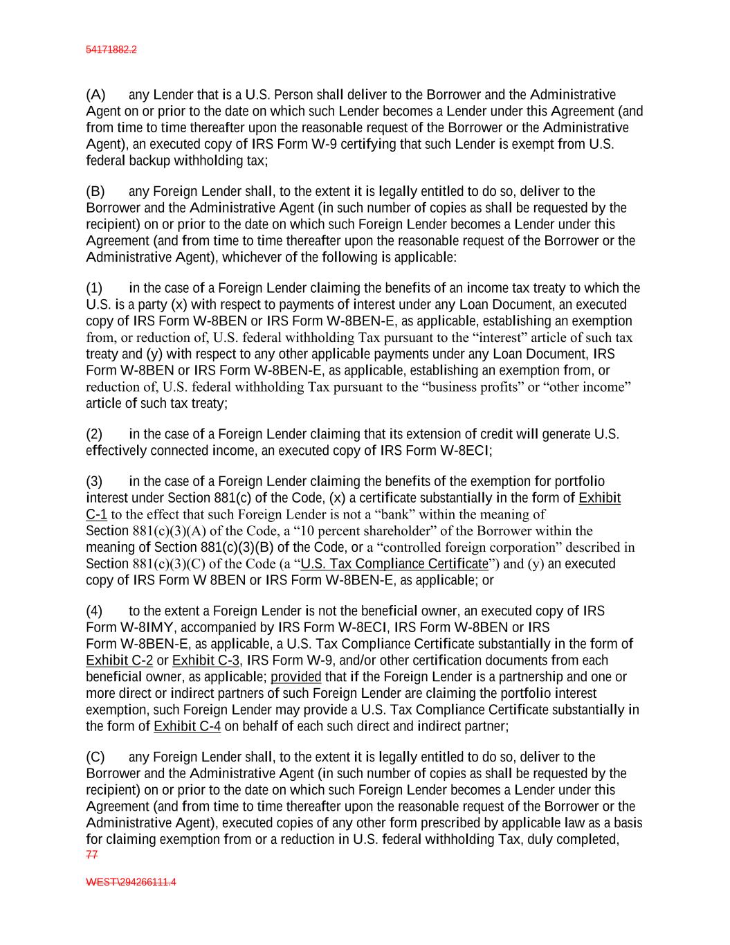 54171882.2 77 WEST\294266111.4 (A) any Lender that is a U.S. Person shall deliver to the Borrower and the Administrative Agent on or prior to the date on which such Lender becomes a Lender under this Agreement (and from time to time thereafter upon the reasonable request of the Borrower or the Administrative Agent), an executed copy of IRS Form W-9 certifying that such Lender is exempt from U.S. federal backup withholding tax; (B) any Foreign Lender shall, to the extent it is legally entitled to do so, deliver to the Borrower and the Administrative Agent (in such number of copies as shall be requested by the recipient) on or prior to the date on which such Foreign Lender becomes a Lender under this Agreement (and from time to time thereafter upon the reasonable request of the Borrower or the Administrative Agent), whichever of the following is applicable: (1) in the case of a Foreign Lender claiming the benefits of an income tax treaty to which the U.S. is a party (x) with respect to payments of interest under any Loan Document, an executed copy of IRS Form W-8BEN or IRS Form W-8BEN-E, as applicable, establishing an exemption from, or reduction of, U.S. federal withholding Tax pursuant to the “interest” article of such tax treaty and (y) with respect to any other applicable payments under any Loan Document, IRS Form W-8BEN or IRS Form W-8BEN-E, as applicable, establishing an exemption from, or reduction of, U.S. federal withholding Tax pursuant to the “business profits” or “other income” article of such tax treaty; (2) in the case of a Foreign Lender claiming that its extension of credit will generate U.S. effectively connected income, an executed copy of IRS Form W-8ECI; (3) in the case of a Foreign Lender claiming the benefits of the exemption for portfolio interest under Section 881(c) of the Code, (x) a certificate substantially in the form of Exhibit C-1 to the effect that such Foreign Lender is not a “bank” within the meaning of Section 881(c)(3)(A) of the Code, a “10 percent shareholder” of the Borrower within the meaning of Section 881(c)(3)(B) of the Code, or a “controlled foreign corporation” described in Section 881(c)(3)(C) of the Code (a “U.S. Tax Compliance Certificate”) and (y) an executed copy of IRS Form W 8BEN or IRS Form W-8BEN-E, as applicable; or (4) to the extent a Foreign Lender is not the beneficial owner, an executed copy of IRS Form W-8IMY, accompanied by IRS Form W-8ECI, IRS Form W-8BEN or IRS Form W-8BEN-E, as applicable, a U.S. Tax Compliance Certificate substantially in the form of Exhibit C-2 or Exhibit C-3, IRS Form W-9, and/or other certification documents from each beneficial owner, as applicable; provided that if the Foreign Lender is a partnership and one or more direct or indirect partners of such Foreign Lender are claiming the portfolio interest exemption, such Foreign Lender may provide a U.S. Tax Compliance Certificate substantially in the form of Exhibit C-4 on behalf of each such direct and indirect partner; (C) any Foreign Lender shall, to the extent it is legally entitled to do so, deliver to the Borrower and the Administrative Agent (in such number of copies as shall be requested by the recipient) on or prior to the date on which such Foreign Lender becomes a Lender under this Agreement (and from time to time thereafter upon the reasonable request of the Borrower or the Administrative Agent), executed copies of any other form prescribed by applicable law as a basis for claiming exemption from or a reduction in U.S. federal withholding Tax, duly completed,