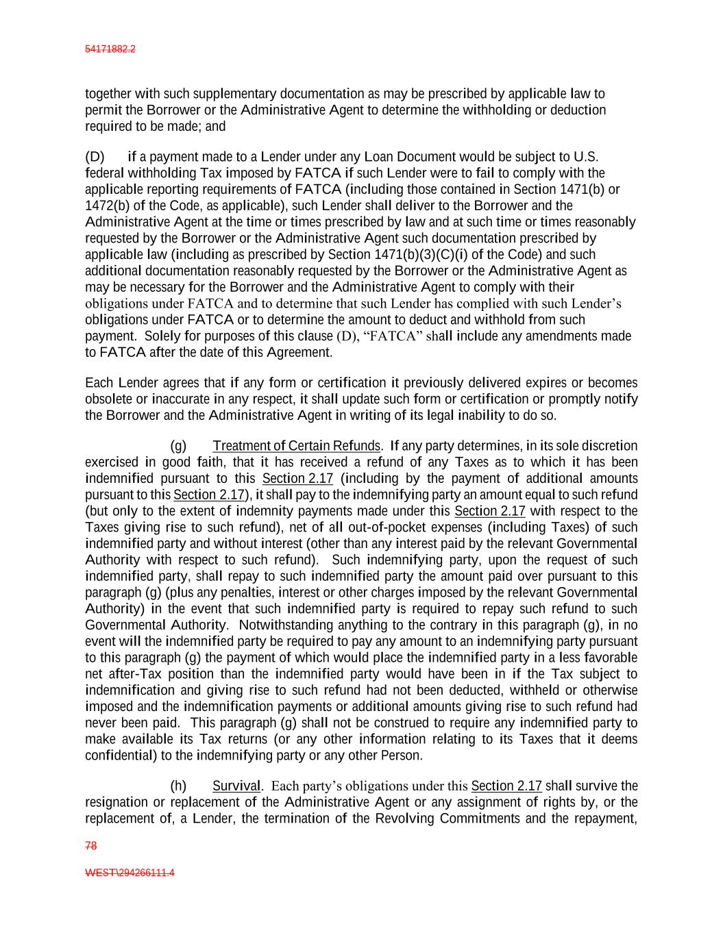 54171882.2 78 WEST\294266111.4 together with such supplementary documentation as may be prescribed by applicable law to permit the Borrower or the Administrative Agent to determine the withholding or deduction required to be made; and (D) if a payment made to a Lender under any Loan Document would be subject to U.S. federal withholding Tax imposed by FATCA if such Lender were to fail to comply with the applicable reporting requirements of FATCA (including those contained in Section 1471(b) or 1472(b) of the Code, as applicable), such Lender shall deliver to the Borrower and the Administrative Agent at the time or times prescribed by law and at such time or times reasonably requested by the Borrower or the Administrative Agent such documentation prescribed by applicable law (including as prescribed by Section 1471(b)(3)(C)(i) of the Code) and such additional documentation reasonably requested by the Borrower or the Administrative Agent as may be necessary for the Borrower and the Administrative Agent to comply with their obligations under FATCA and to determine that such Lender has complied with such Lender’s obligations under FATCA or to determine the amount to deduct and withhold from such payment. Solely for purposes of this clause (D), “FATCA” shall include any amendments made to FATCA after the date of this Agreement. Each Lender agrees that if any form or certification it previously delivered expires or becomes obsolete or inaccurate in any respect, it shall update such form or certification or promptly notify the Borrower and the Administrative Agent in writing of its legal inability to do so. (g) Treatment of Certain Refunds. If any party determines, in its sole discretion exercised in good faith, that it has received a refund of any Taxes as to which it has been indemnified pursuant to this Section 2.17 (including by the payment of additional amounts pursuant to this Section 2.17), it shall pay to the indemnifying party an amount equal to such refund (but only to the extent of indemnity payments made under this Section 2.17 with respect to the Taxes giving rise to such refund), net of all out-of-pocket expenses (including Taxes) of such indemnified party and without interest (other than any interest paid by the relevant Governmental Authority with respect to such refund). Such indemnifying party, upon the request of such indemnified party, shall repay to such indemnified party the amount paid over pursuant to this paragraph (g) (plus any penalties, interest or other charges imposed by the relevant Governmental Authority) in the event that such indemnified party is required to repay such refund to such Governmental Authority. Notwithstanding anything to the contrary in this paragraph (g), in no event will the indemnified party be required to pay any amount to an indemnifying party pursuant to this paragraph (g) the payment of which would place the indemnified party in a less favorable net after-Tax position than the indemnified party would have been in if the Tax subject to indemnification and giving rise to such refund had not been deducted, withheld or otherwise imposed and the indemnification payments or additional amounts giving rise to such refund had never been paid. This paragraph (g) shall not be construed to require any indemnified party to make available its Tax returns (or any other information relating to its Taxes that it deems confidential) to the indemnifying party or any other Person. (h) Survival. Each party’s obligations under this Section 2.17 shall survive the resignation or replacement of the Administrative Agent or any assignment of rights by, or the replacement of, a Lender, the termination of the Revolving Commitments and the repayment,